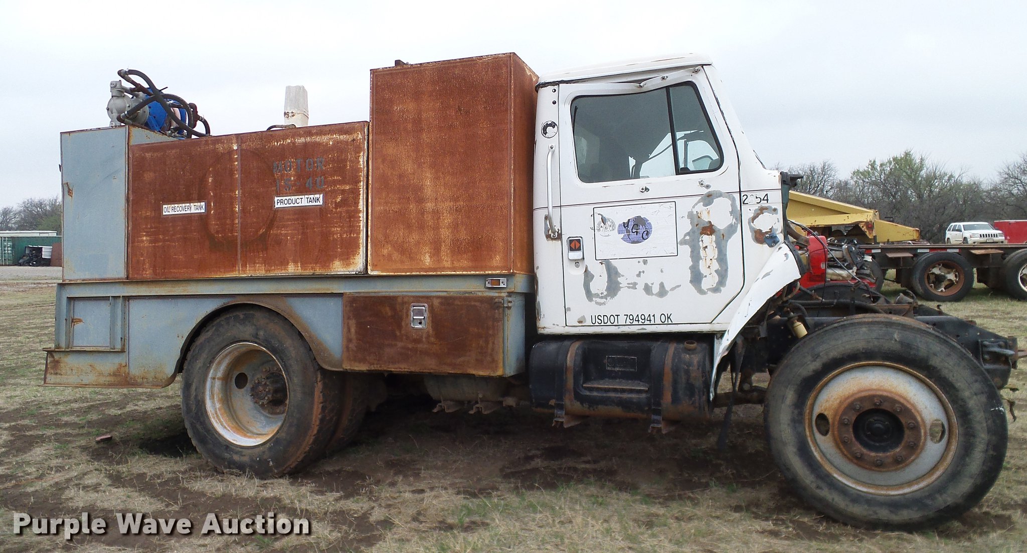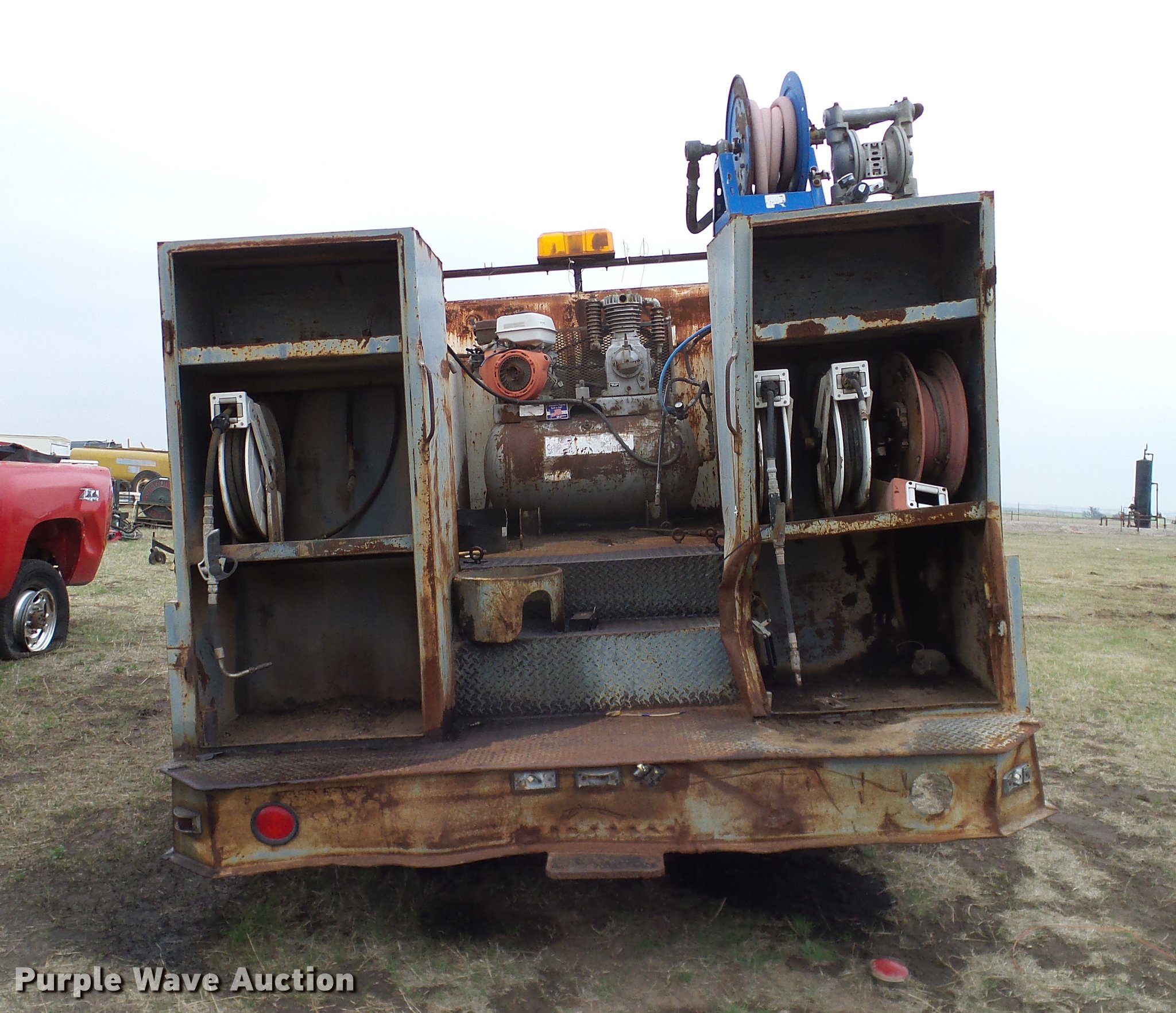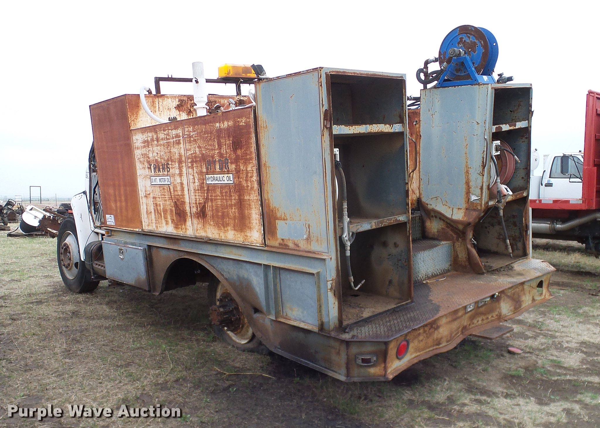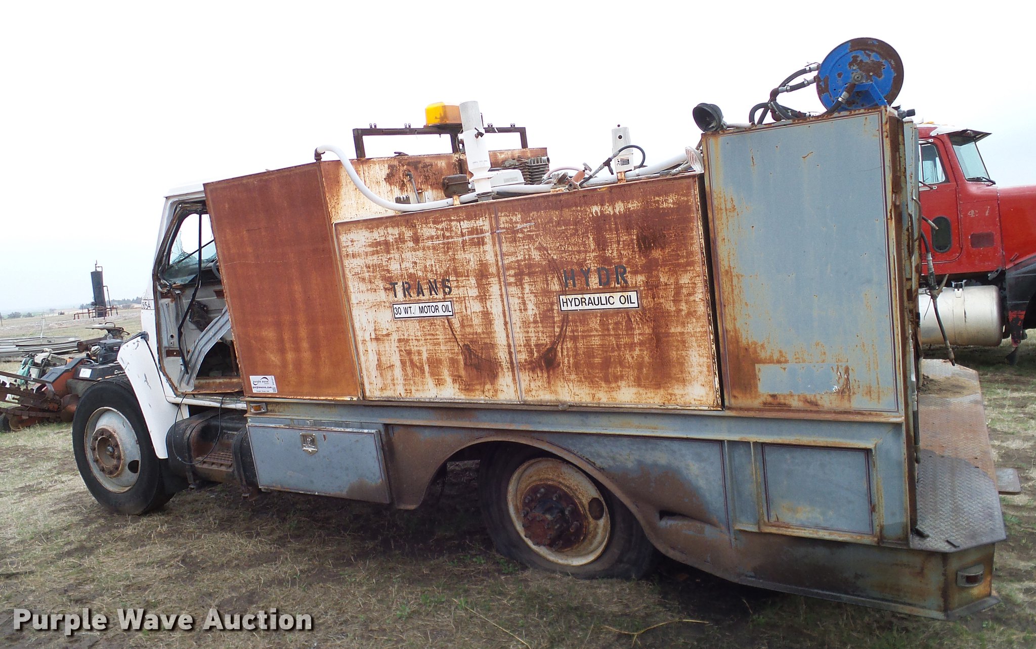 Purple Wave is selling a used Service Truck in Oklahoma. This item is a 1986 International 1955 service truck with the following: Unknown miles on odometer, No engine, No transmission, Single axle, Front tow hooks, Single exhaust stack, 12'L service bed, Industrial Air air compressor, Non-operational, Oil/lube system, Hose reels, Nozzles, Hydraulic fluid reservoir, Motor oil reservoir, Used oil reservoir, Dual fuel tanks, Spring suspension, Air brakes, 139" wheelbase, 285/75R24.5 front tires, 11R24.5 rear tires, GVWR 26,500 lbs, Cab glass missing, Interior components missing, Rear tire and wheel missing, Non-operational unit