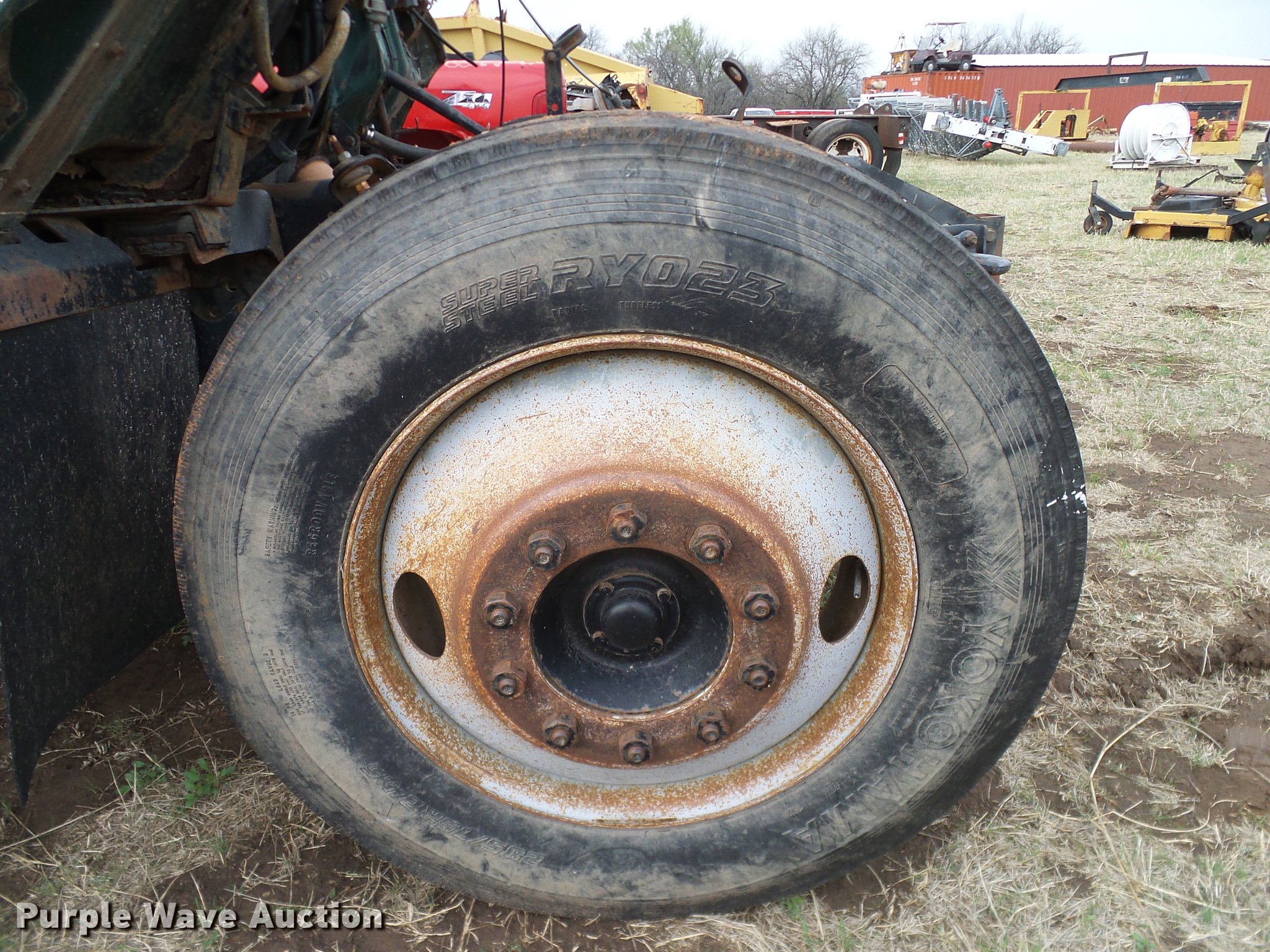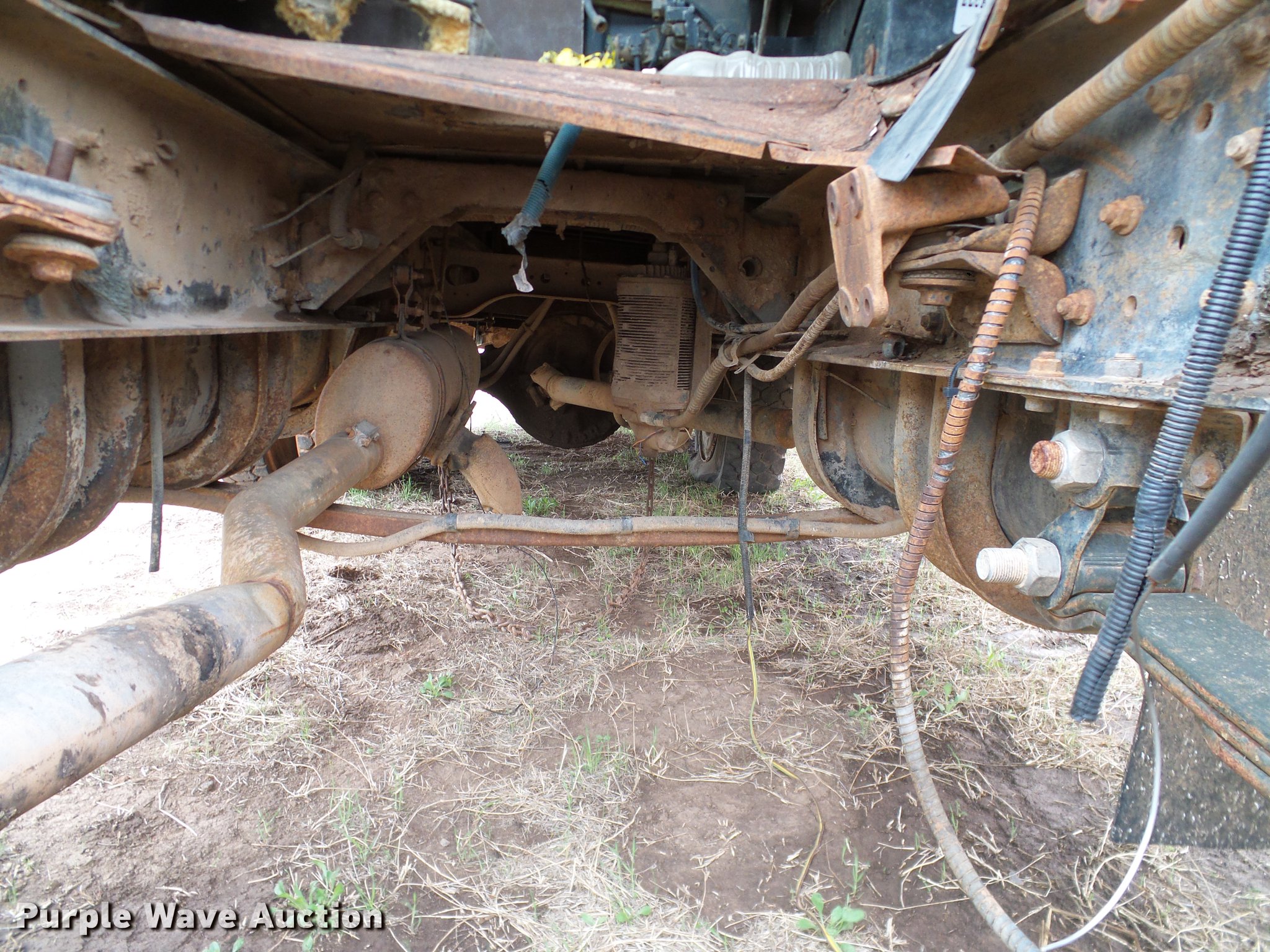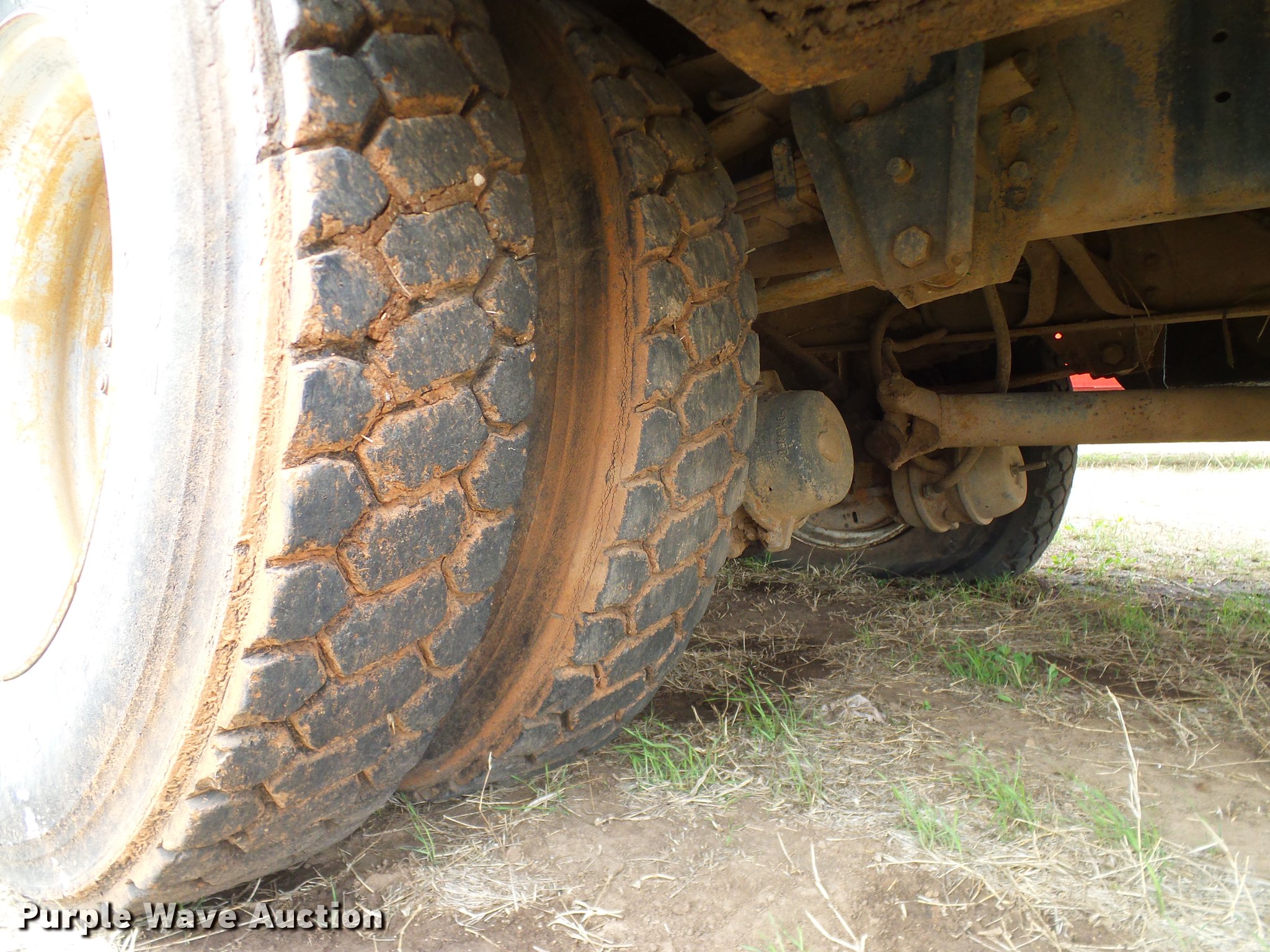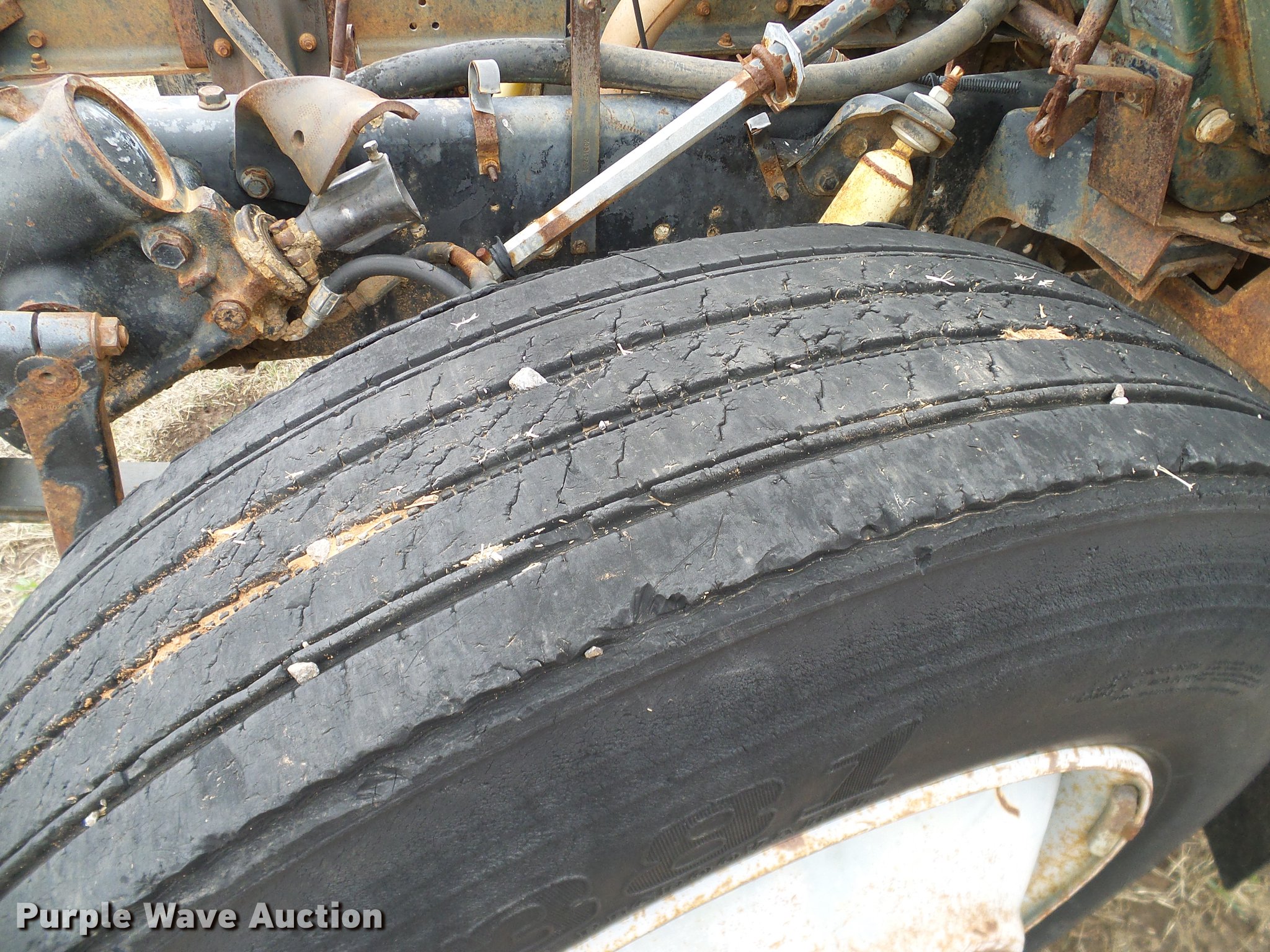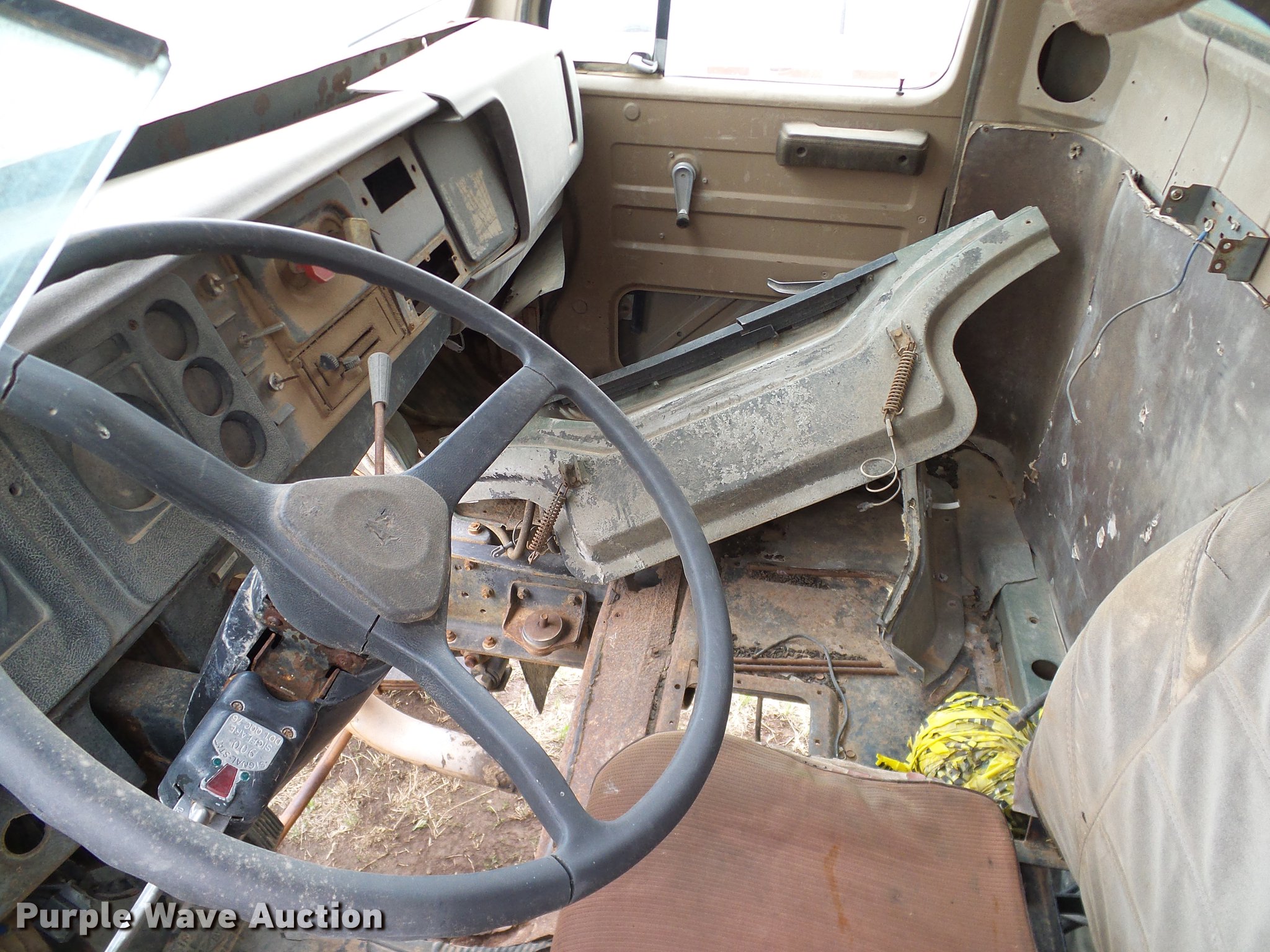 Purple Wave is selling a used Service Truck in Oklahoma. This item is a 1986 International 1955 service truck with the following: Unknown miles on odometer, No engine, No transmission, Single axle, Front tow hooks, Single exhaust stack, 12'L service bed, Industrial Air air compressor, Non-operational, Oil/lube system, Hose reels, Nozzles, Hydraulic fluid reservoir, Motor oil reservoir, Used oil reservoir, Dual fuel tanks, Spring suspension, Air brakes, 139" wheelbase, 285/75R24.5 front tires, 11R24.5 rear tires, GVWR 26,500 lbs, Cab glass missing, Interior components missing, Rear tire and wheel missing, Non-operational unit