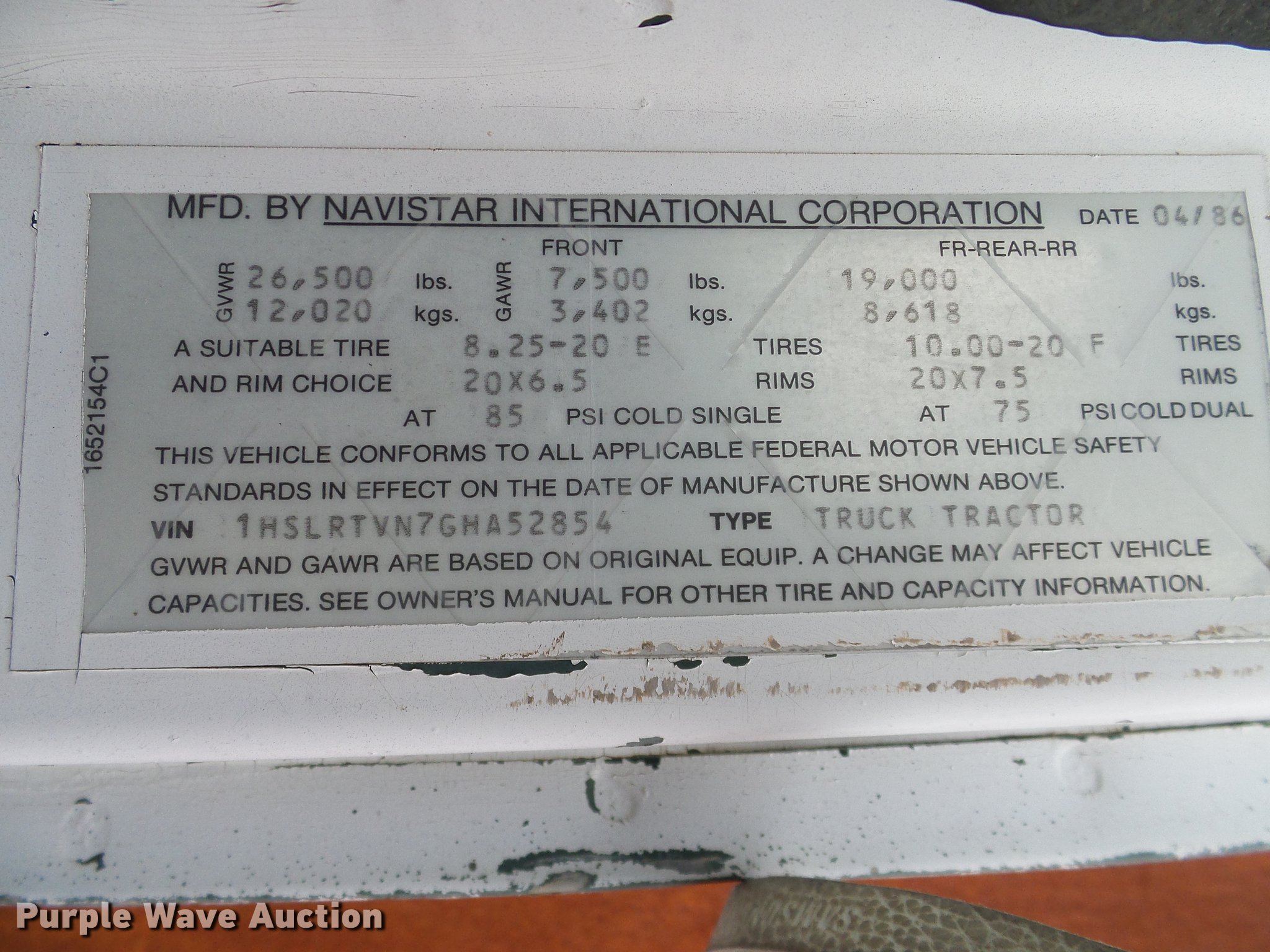 1986 International 1955 service truck. Unknown miles on odometer, No engine, No transmission, Single axle, Front tow hooks, Single exhaust stack, 12'L service bed, Industrial Air air compressor Non-operational, Oil/lube system Hose reels, Nozzles, Hydraulic fluid reservoir, Motor oil reservoir, Used oil reservoir, Dual fuel tanks, Spring suspension, Air brakes, 139" wheelbase, 285/75R24.5 front tires, 11R24.5 rear tires, GVWR 26,500 lbs, Cab glass missing, Interior components missing, Rear tire and wheel missing, Non-operational unit. Oklahoma title. Title distribution may be delayed up to 14 days from verification of funds. 1HSLRTVN7GHA52854. Redlands Contracting LLC. 8479 E0980 Rd. El Reno, OK 73036