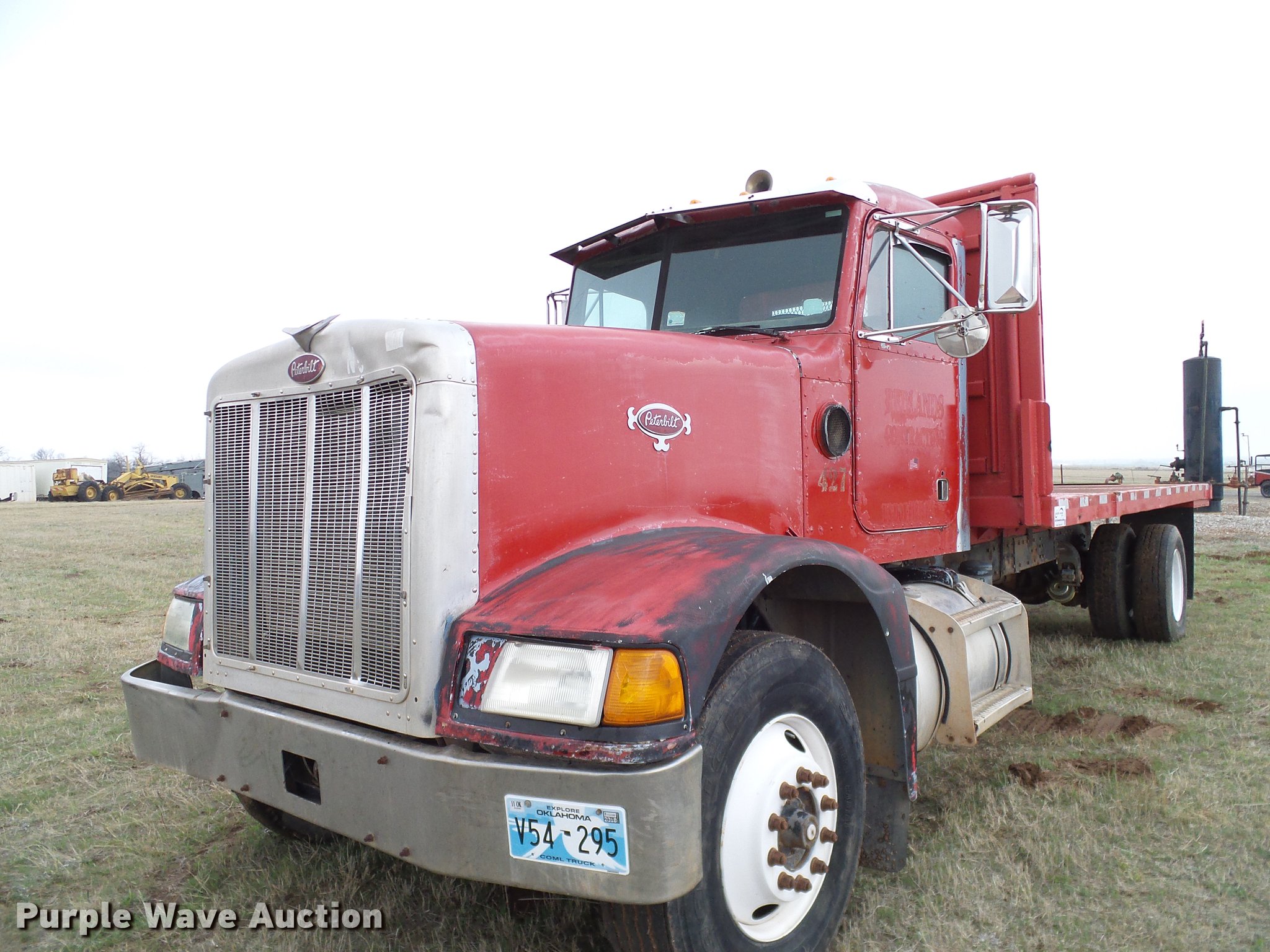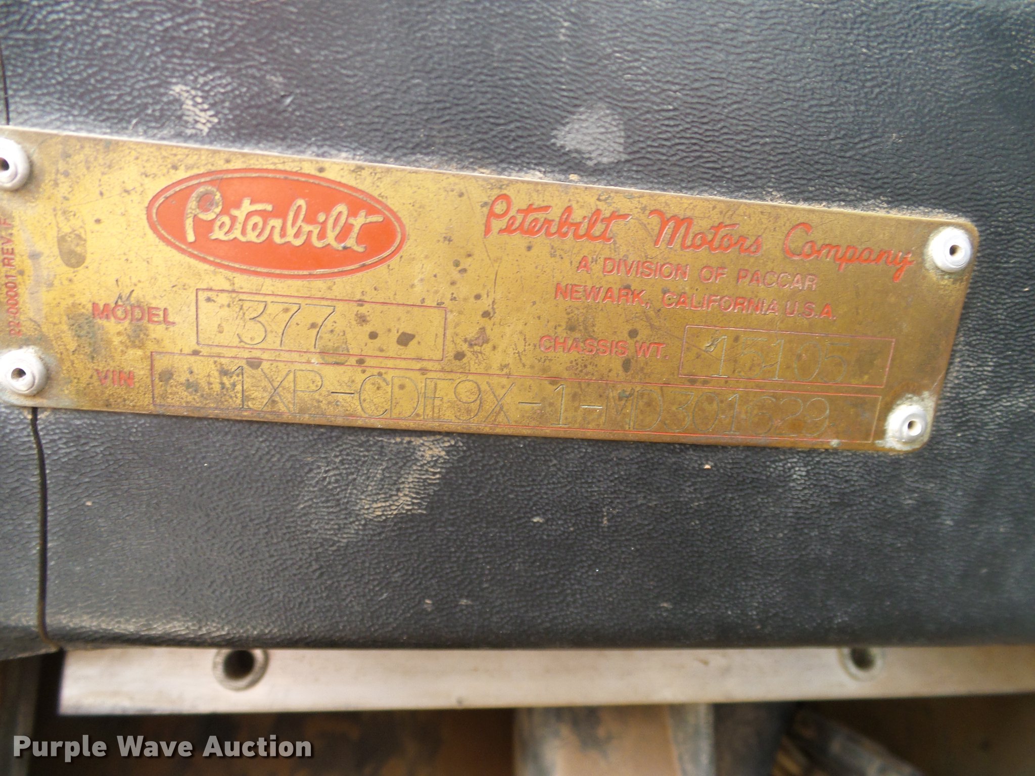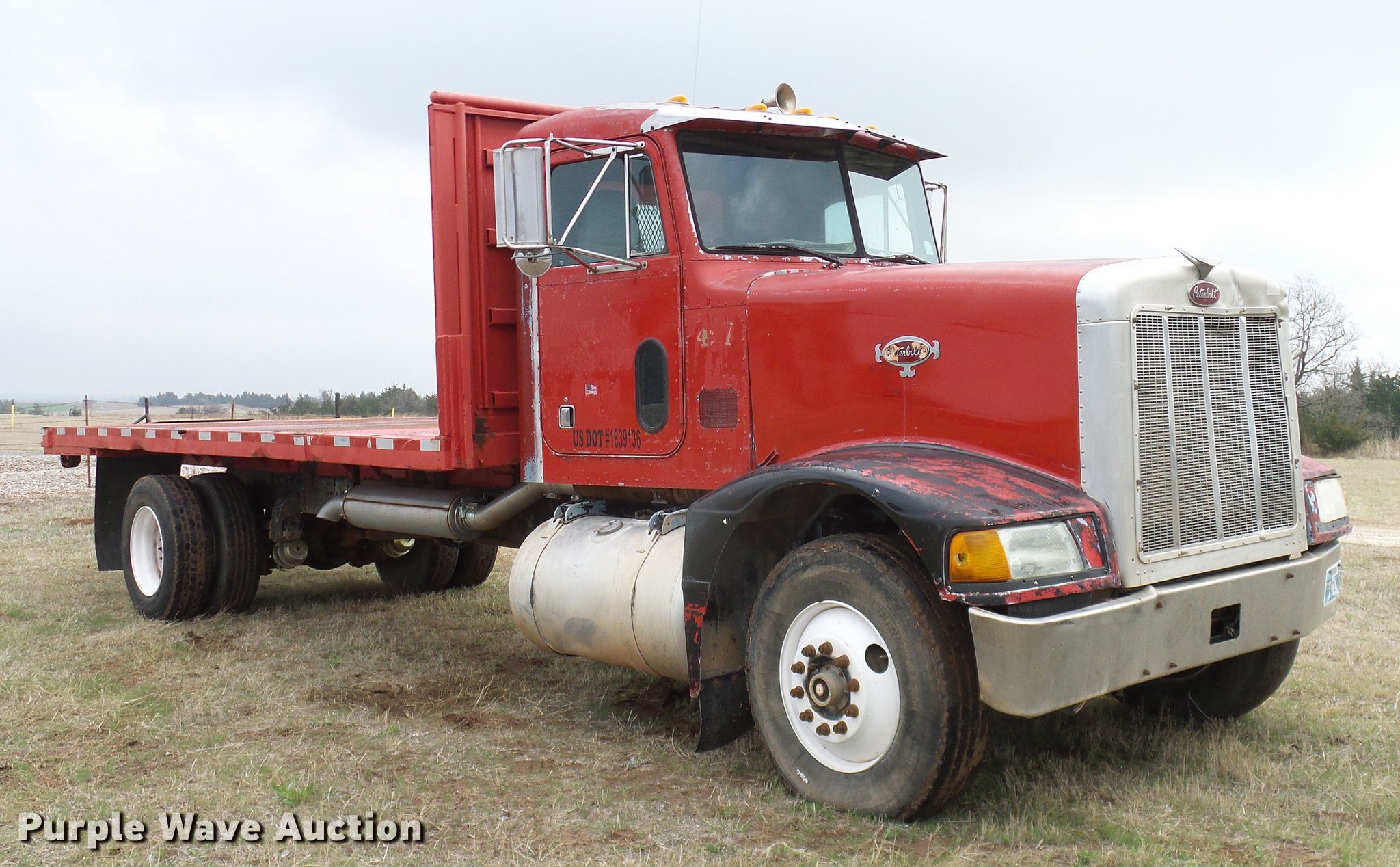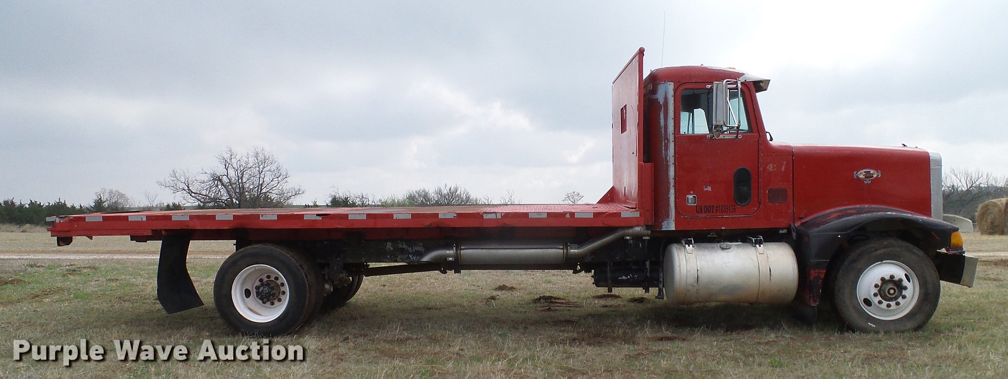 Purple Wave is selling a used Flat Bed Truck in Oklahoma. This item is a 1991 Peterbilt 377 flatbed truck with the following: 262,217 miles on odometer, Caterpillar 3176 10.3L L6 turbo diesel engine, Rockwell nine speed manual transmission, Single axle, Inter-axle differential lock, AC and heat, Cruise, AM/FM/CD, Power and heated mirrors, Suspension seat, Front tow hooks, Single exhaust stack, PTO, 20'L x 96"W flatbed, Steel floor, Stake pockets, Dual fuel tanks, Air suspension, Air brakes, 11R22.5 front tires, 295/75R22.5 rear tires, GVWR 50,000 lbs, Cracked windshield