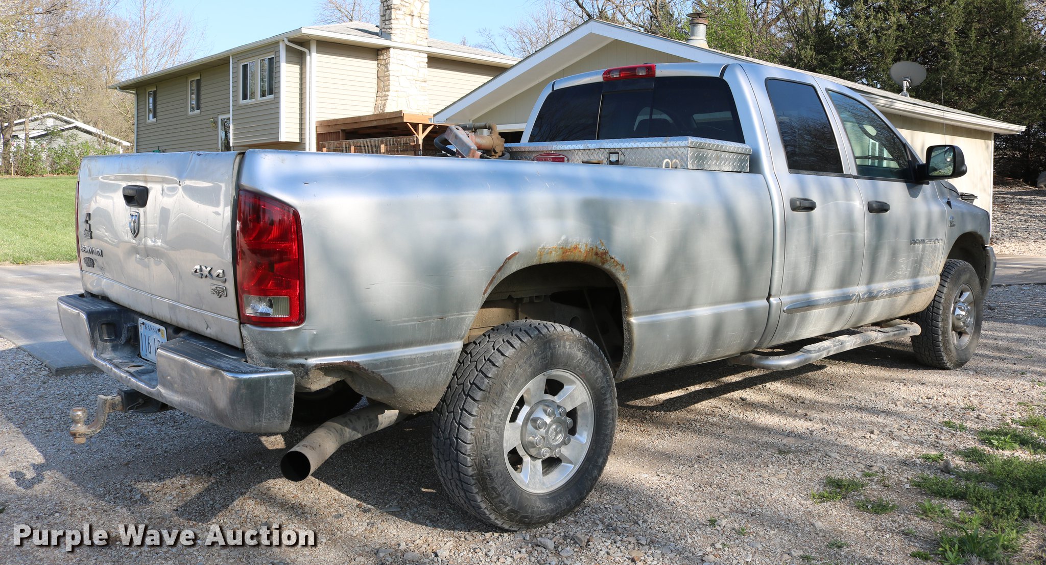 Purple Wave is selling a used 3/4 or 1 Ton Pickup or Van in Kansas. This item is a 2006 Dodge Ram 2500 Quad Cab pickup truck with the following: 344,288 miles on odometer, 5.9L L6 OHV 24V turbo diesel engine, 325 HP, Automatic transmission, Four wheel drive, AC and heat, Tilt, Cruise, AM/FM/CD, Power windows, locks, mirrors, and seats, Vinyl interior, Fog lights, Front tow hooks, Running boards, Long bed, Receiver hitch, Trailer wiring, 265/70R17 tires, Unused replacement window switch included, Transmission replaced in March 2018, Auxiliary fuel tank and toolbox not included, Contents not included, Hail damage, One fog light missing, Cracked windshield