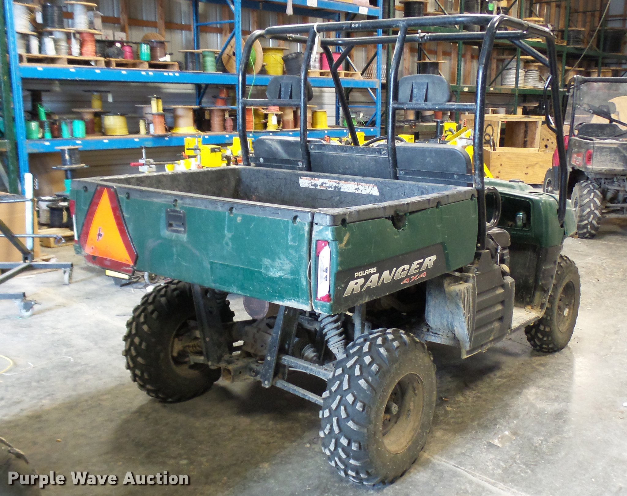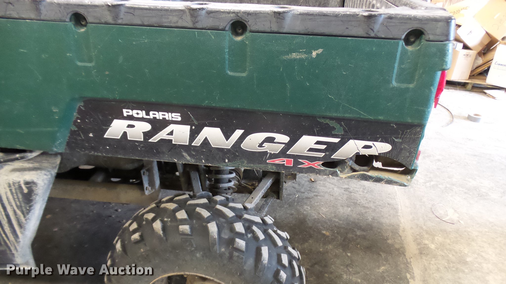 Purple Wave is selling a used Utility Vehicle in Missouri. This item is a 2005 Polaris Ranger utility vehicle with the following: 1,448 hours on meter, 500cc gas engine, Automatic transmission, Four wheel drive, ROPS, Seat belts, Dump bed, Receiver hitch, Independent suspension, 25x8.00-12 front tires, 25x10.00-12 rear tires