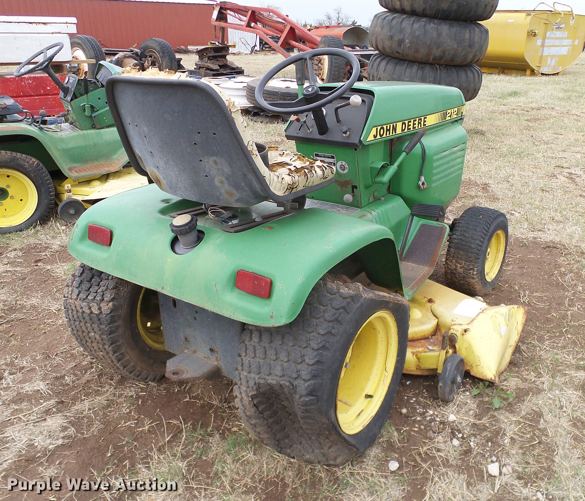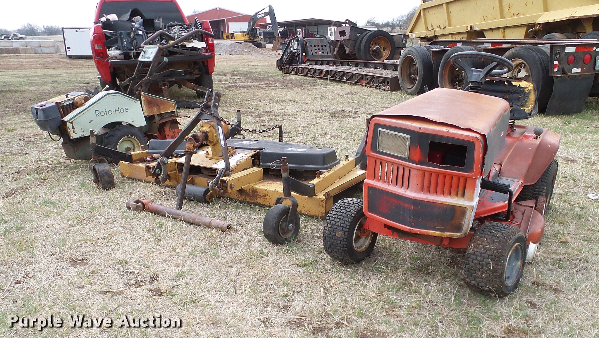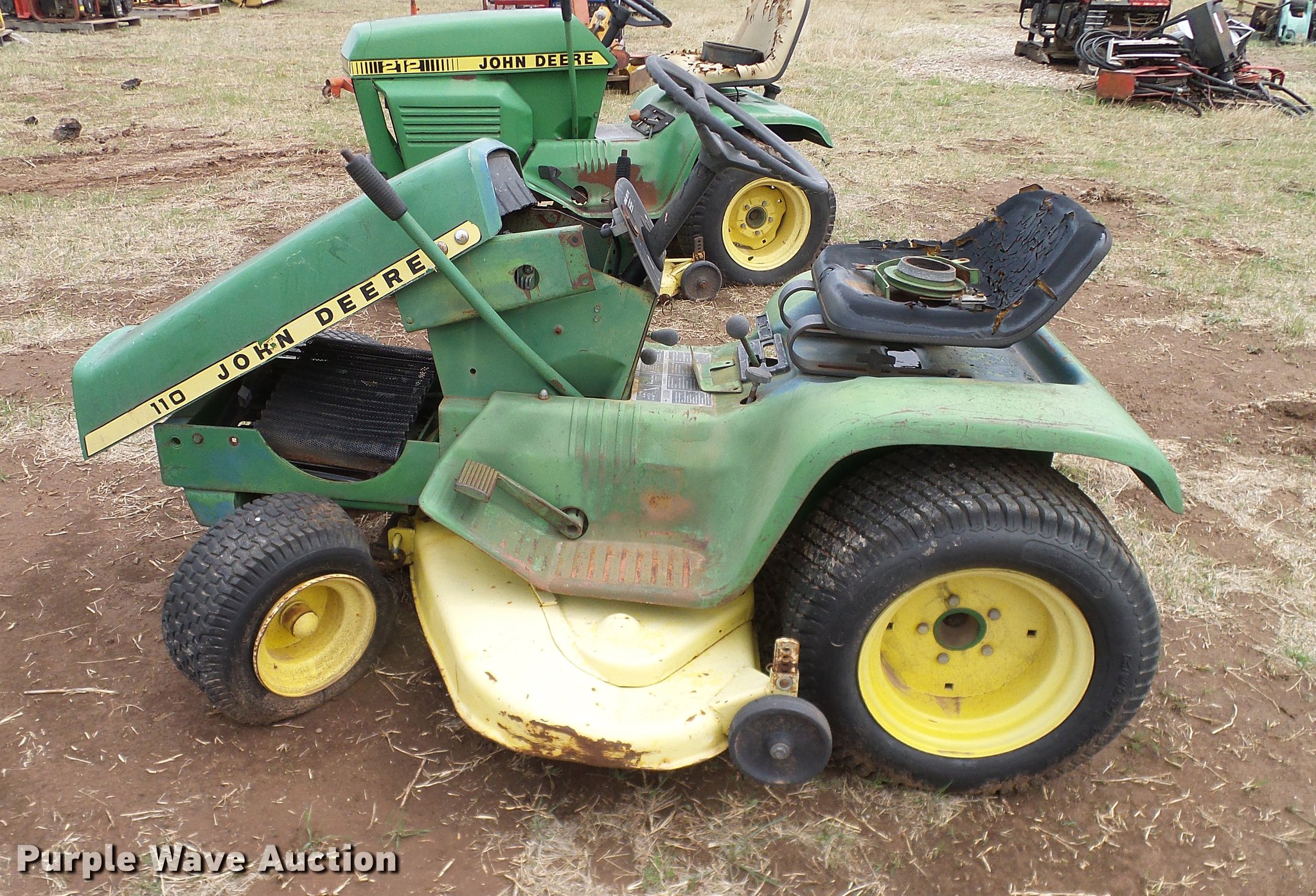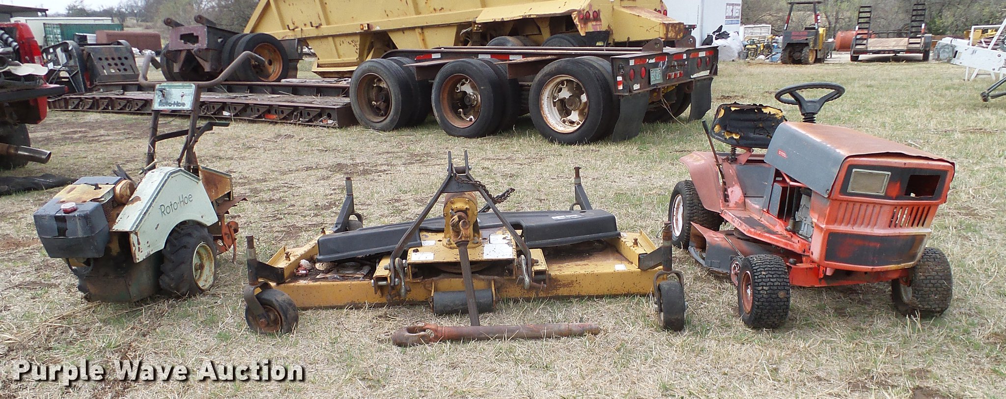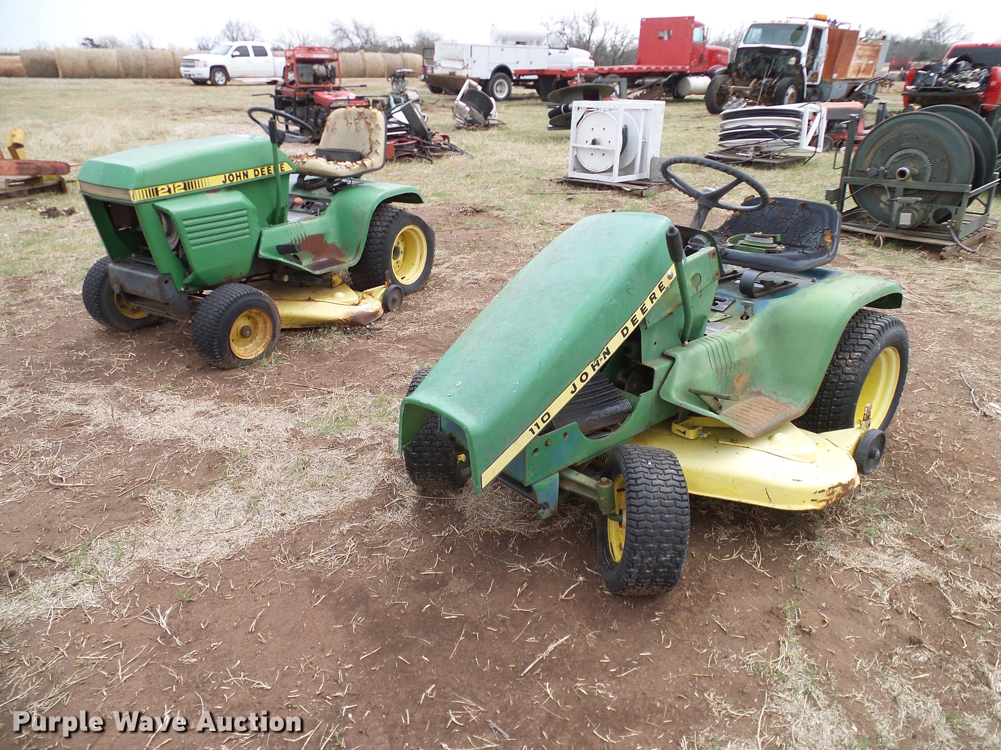 Purple Wave is selling a used Lawn Mower in Oklahoma. This item is a Lawn mowers and tiller with the following: John Deere 110 lawn mower, No engine, Serial 15101ZM, John Deere 212 lawn mower, Single cylinder gas engine, Flat tires, Unknown operating condition, Serial 55075M, Transmatic lawn mower, 32" cut, Briggs & Stratton single cylinder gas engine, 12.5 HP, Flat tires, Unknown operating condition, Finish mower, 72"W, 540 PTO, Three point, Non-operational unit, parts missing, Roto-Hog tiller, 19"W, Single cylinder gas engine, Flat tires, Unknown operating condition