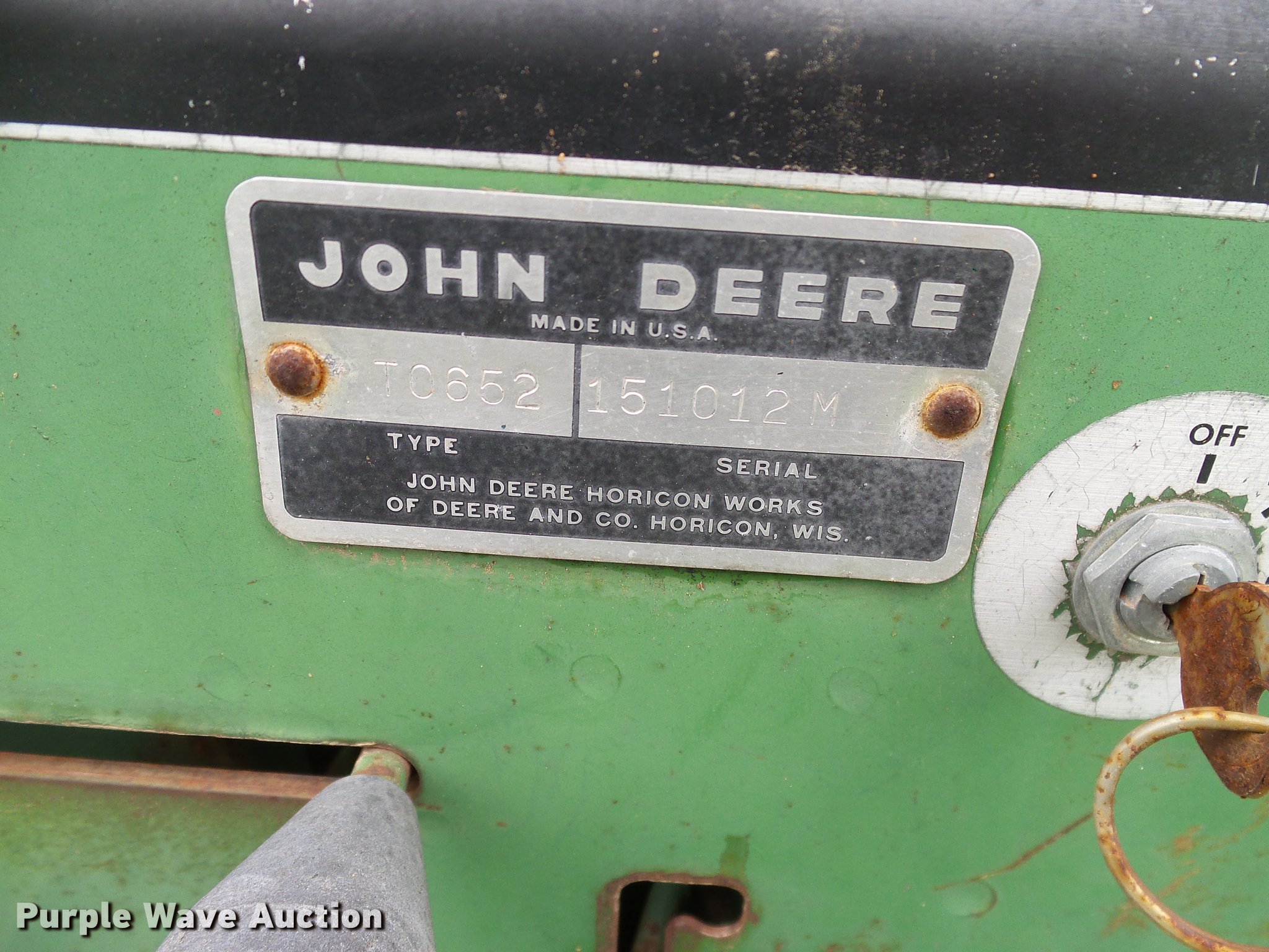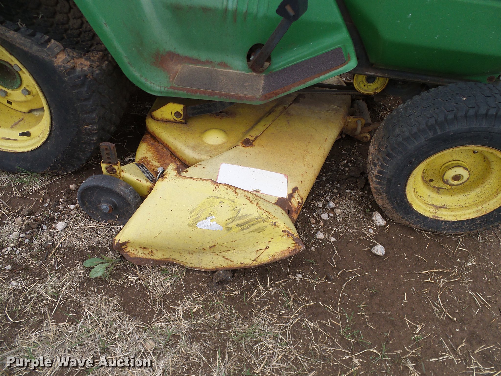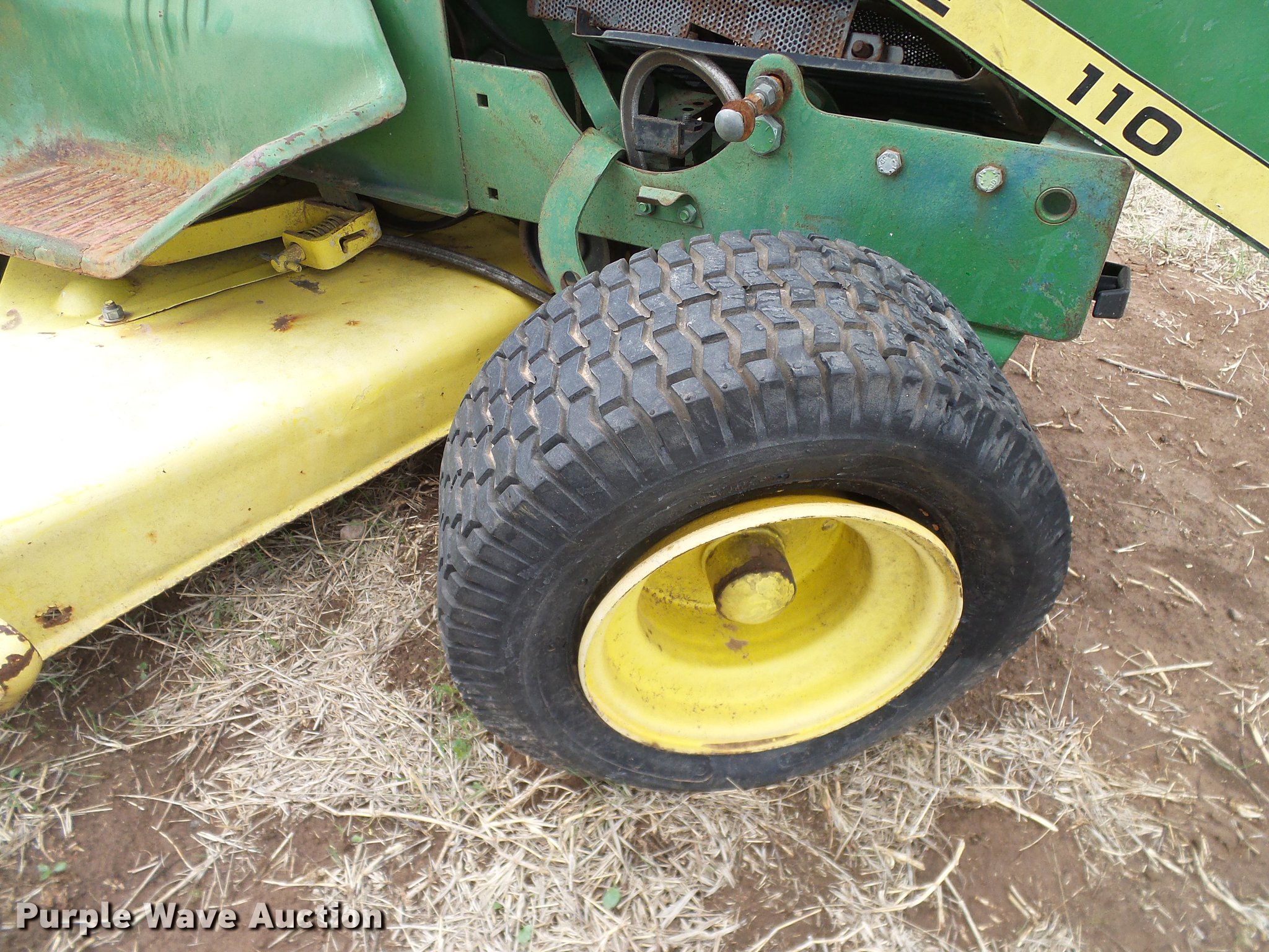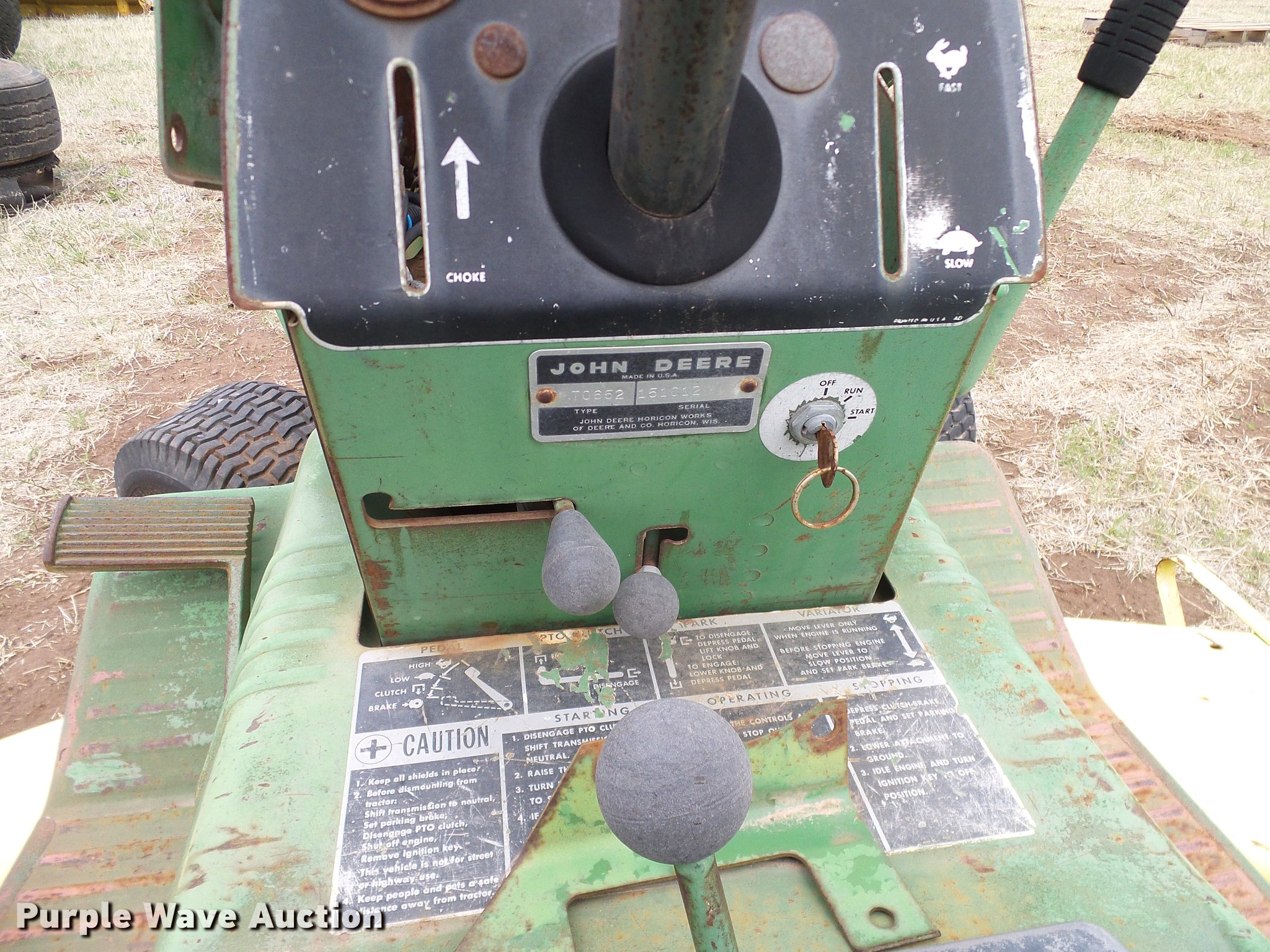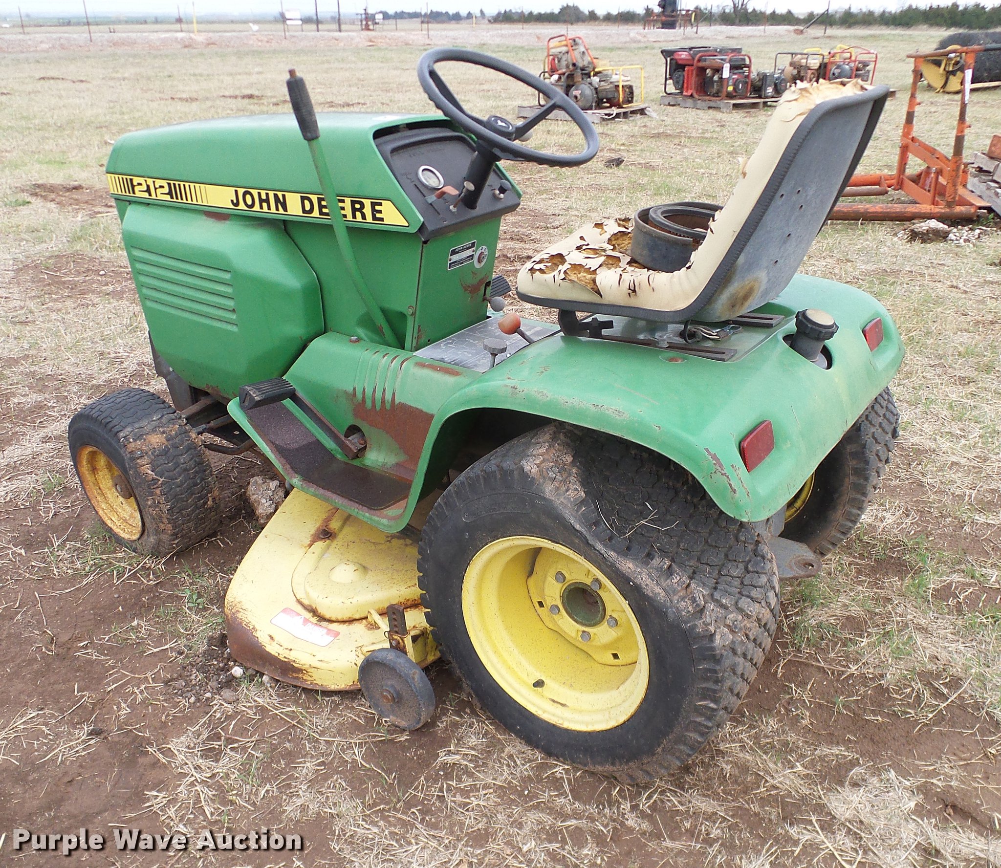 Purple Wave is selling a used Lawn Mower in Oklahoma. This item is a Lawn mowers and tiller with the following: John Deere 110 lawn mower, No engine, Serial 15101ZM, John Deere 212 lawn mower, Single cylinder gas engine, Flat tires, Unknown operating condition, Serial 55075M, Transmatic lawn mower, 32" cut, Briggs & Stratton single cylinder gas engine, 12.5 HP, Flat tires, Unknown operating condition, Finish mower, 72"W, 540 PTO, Three point, Non-operational unit, parts missing, Roto-Hog tiller, 19"W, Single cylinder gas engine, Flat tires, Unknown operating condition