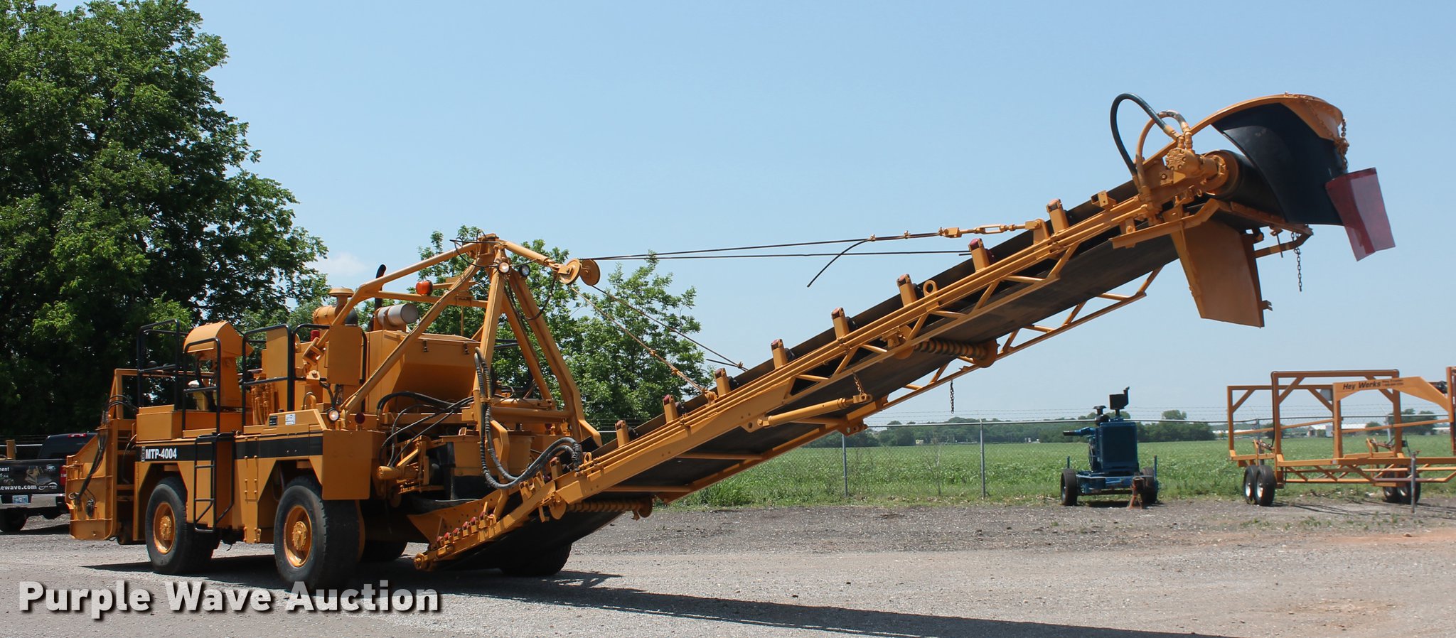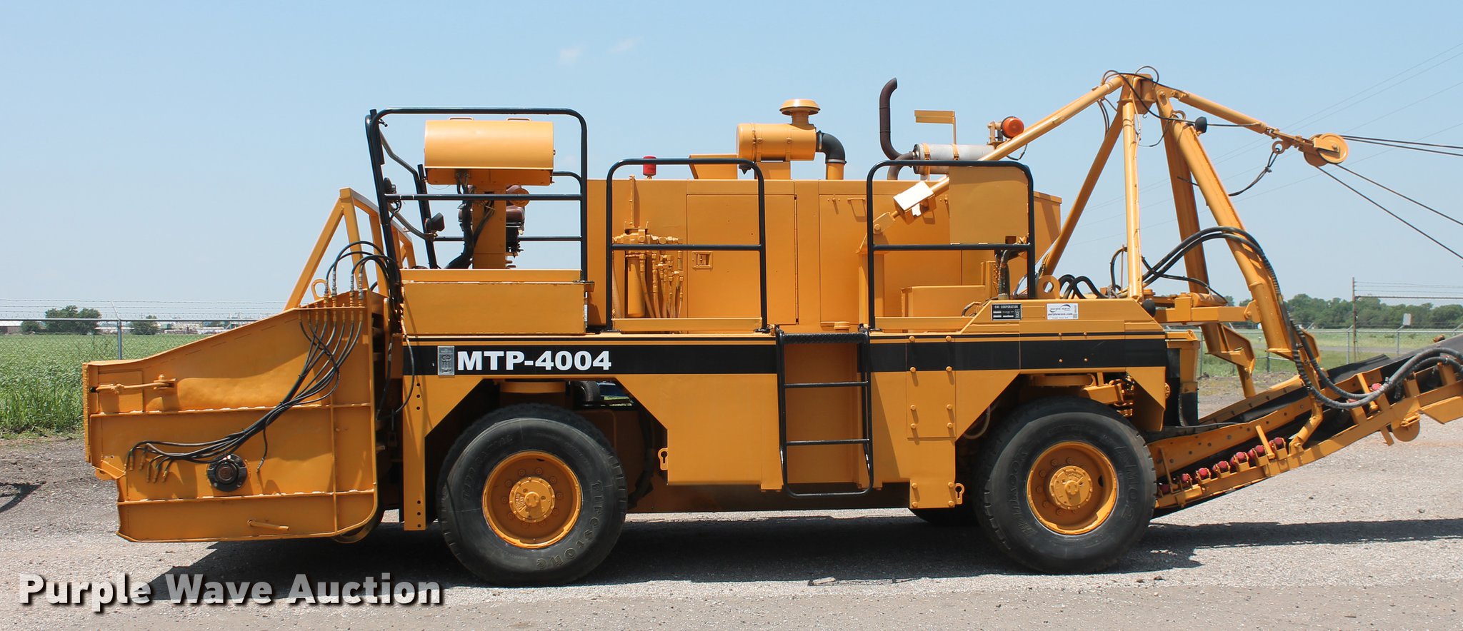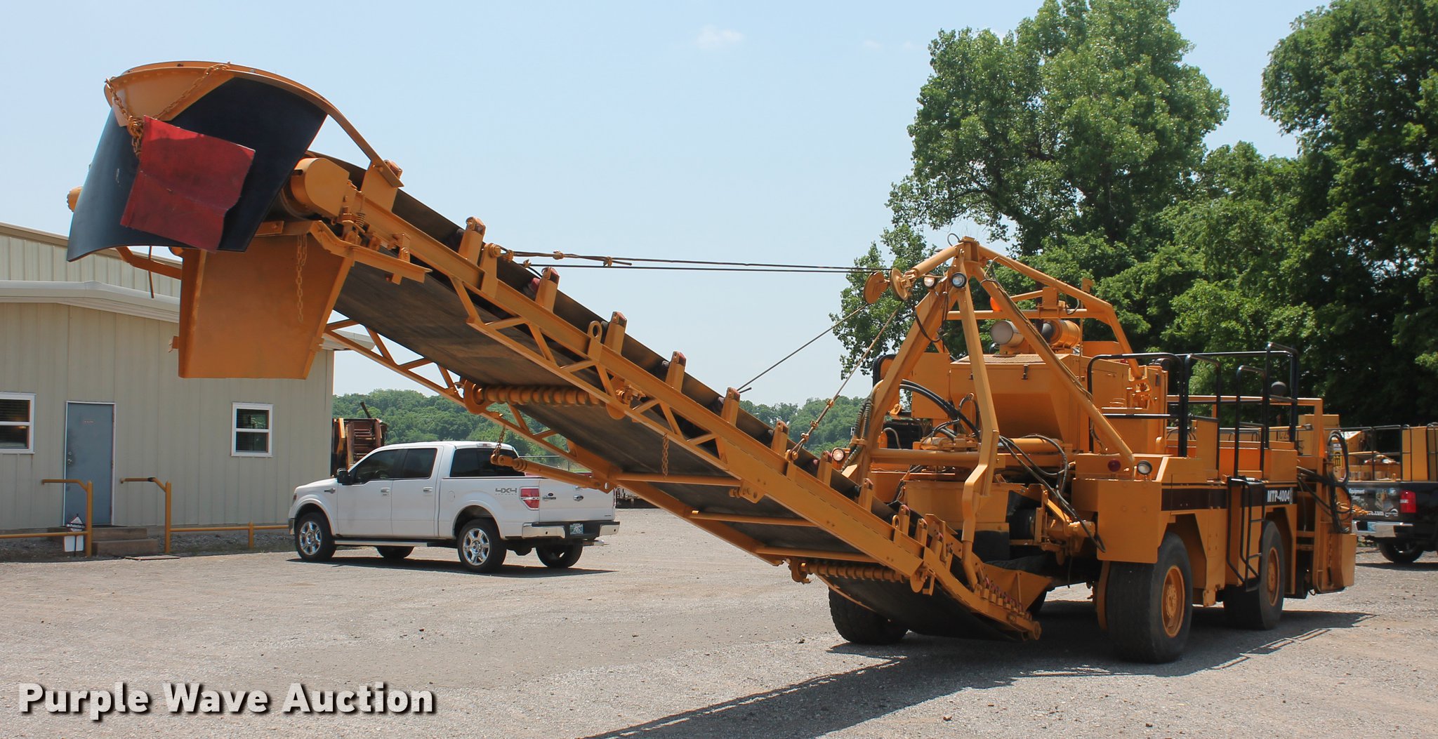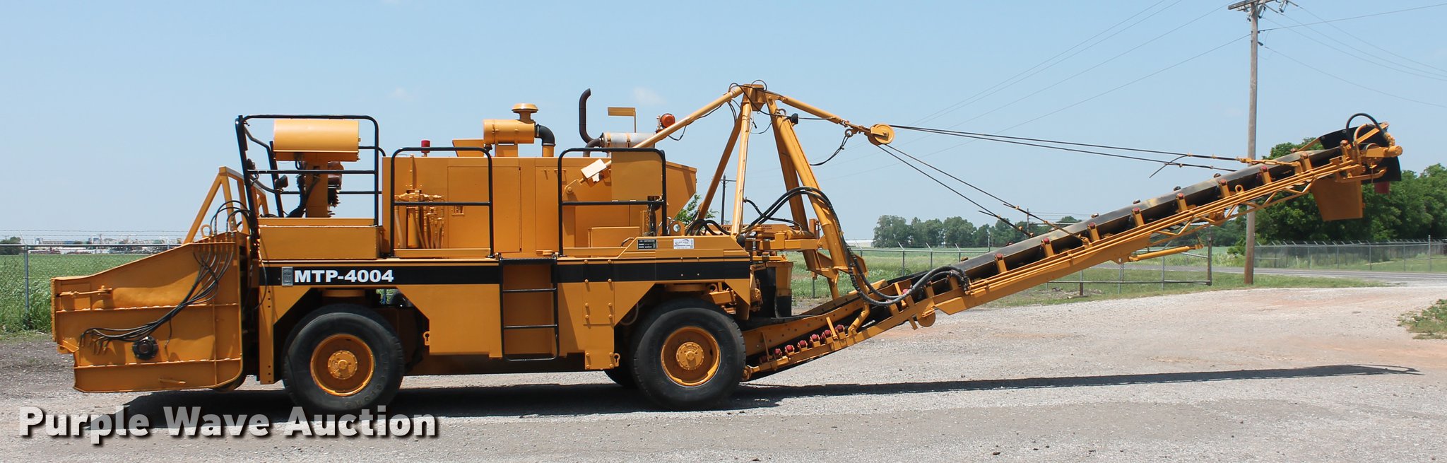 Purple Wave is selling a used Windrow or Belt Placer in Oklahoma. This item is a 1999 CMI MTP4004CP concrete placer with the following: 2,107 hours on meter, Cummins B5.9-C 5.9L six cylinder turbo diesel engine, 175 HP, Serial 45864929, Hydrostatic transmission, Crab steer, Circle steer, Rear steer, 11'W hopper, 36"W rollers, 42"W rubber belt feed conveyor, 30'L x 36"W rubber belt discharge conveyor, 85 degree swing, Work lights, 445/65R22.5 tires, Serial 537180