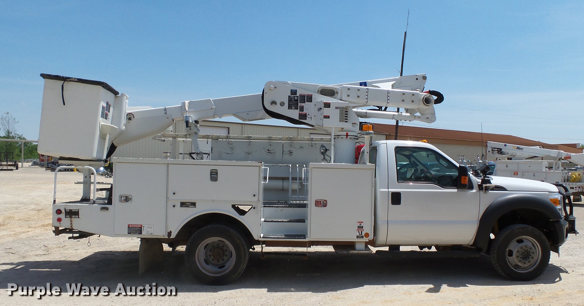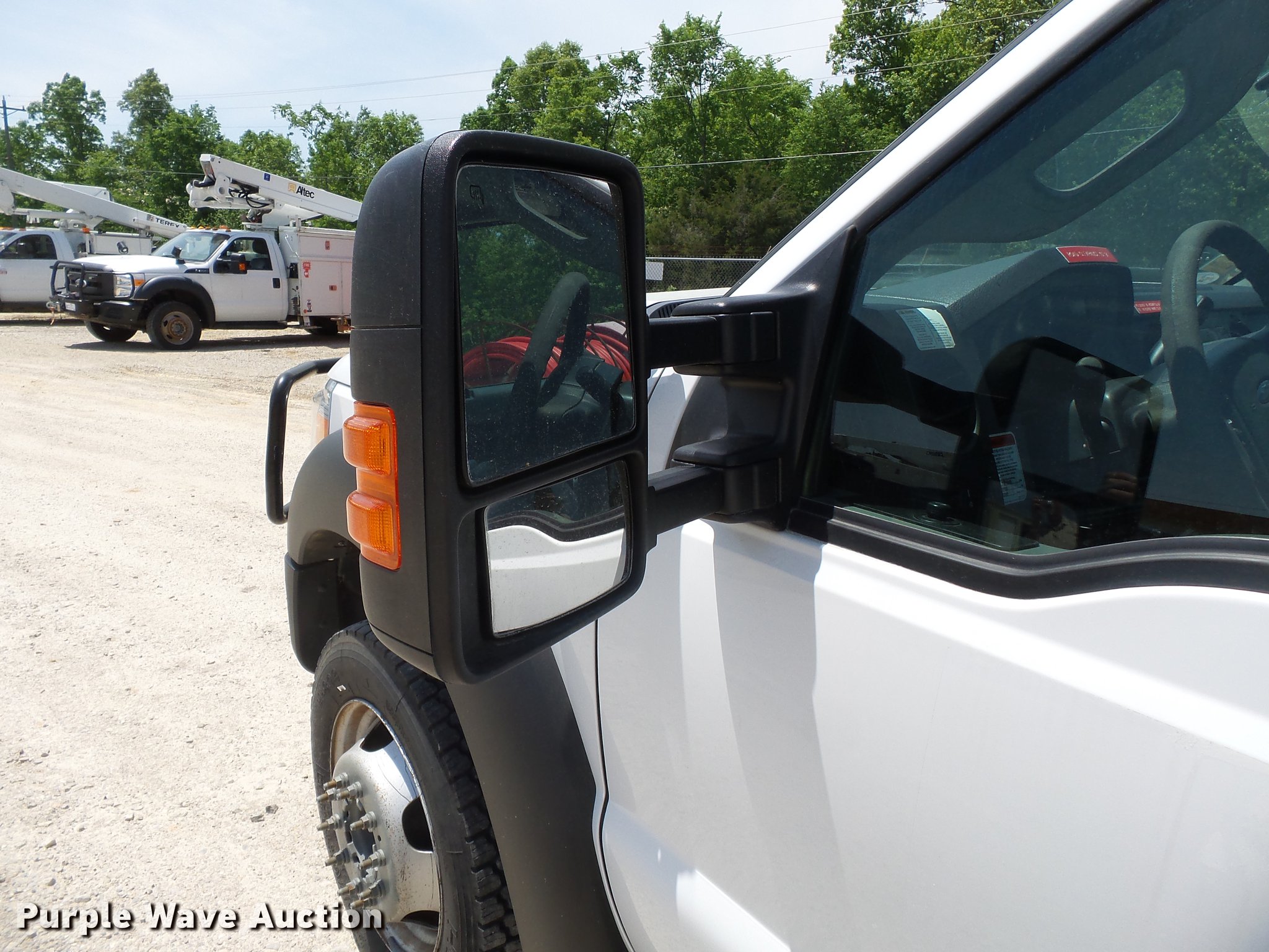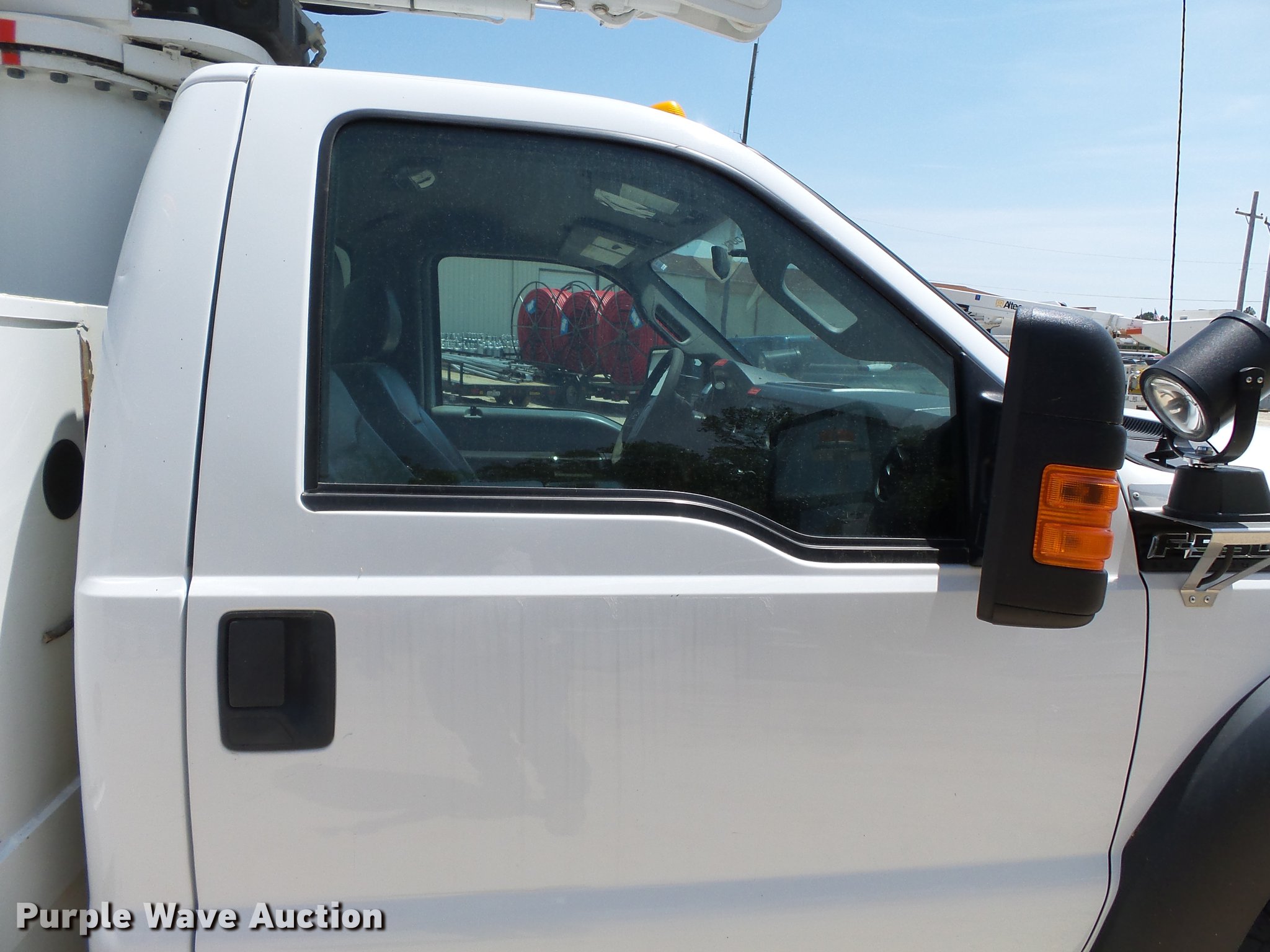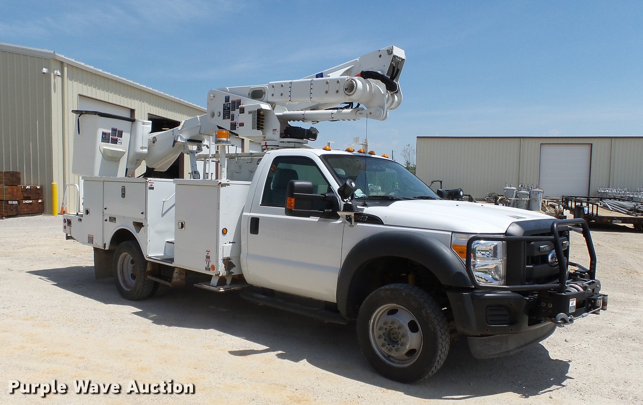 Purple Wave is selling a used Bucket Truck in Missouri. This item is a 2011 Ford F550 Super Duty bucket truck with the following: 157,645 miles on odometer, 585 PTO hours on meter, 6.8L V10 gas engine, Automatic transmission, AC and heat, AM/FM, Power windows, locks, and mirrors, Suspension seat, Auxiliary controls, Backup camera, Backup alarm, PTO, Beacon light, Front tow hooks, Altec 13'4"L utility bed, Shelving, Slide-out drawers, Catwalk, Work lights, Serial 2719081708611, Warn winch, 15,000 lbs capacity, M4-TE winch, 800 lbs capacity, 2011 Altec AT40M boom, 400 lbs maximum lift capcity, 40' maximum lift height, Man basket, Platform and ground controls, Boom rotation, Articulating, insulated, telescopic boom, Rope material handler, Certification valid through September 2018, Single fuel tank, Pintle hitch, Trailer wiring, 165" wheelbase, Spring suspension, Hydraulic brakes, 225/70R19.5 tires, GVWR 19,500 lbs, View Aerial Device Test Report