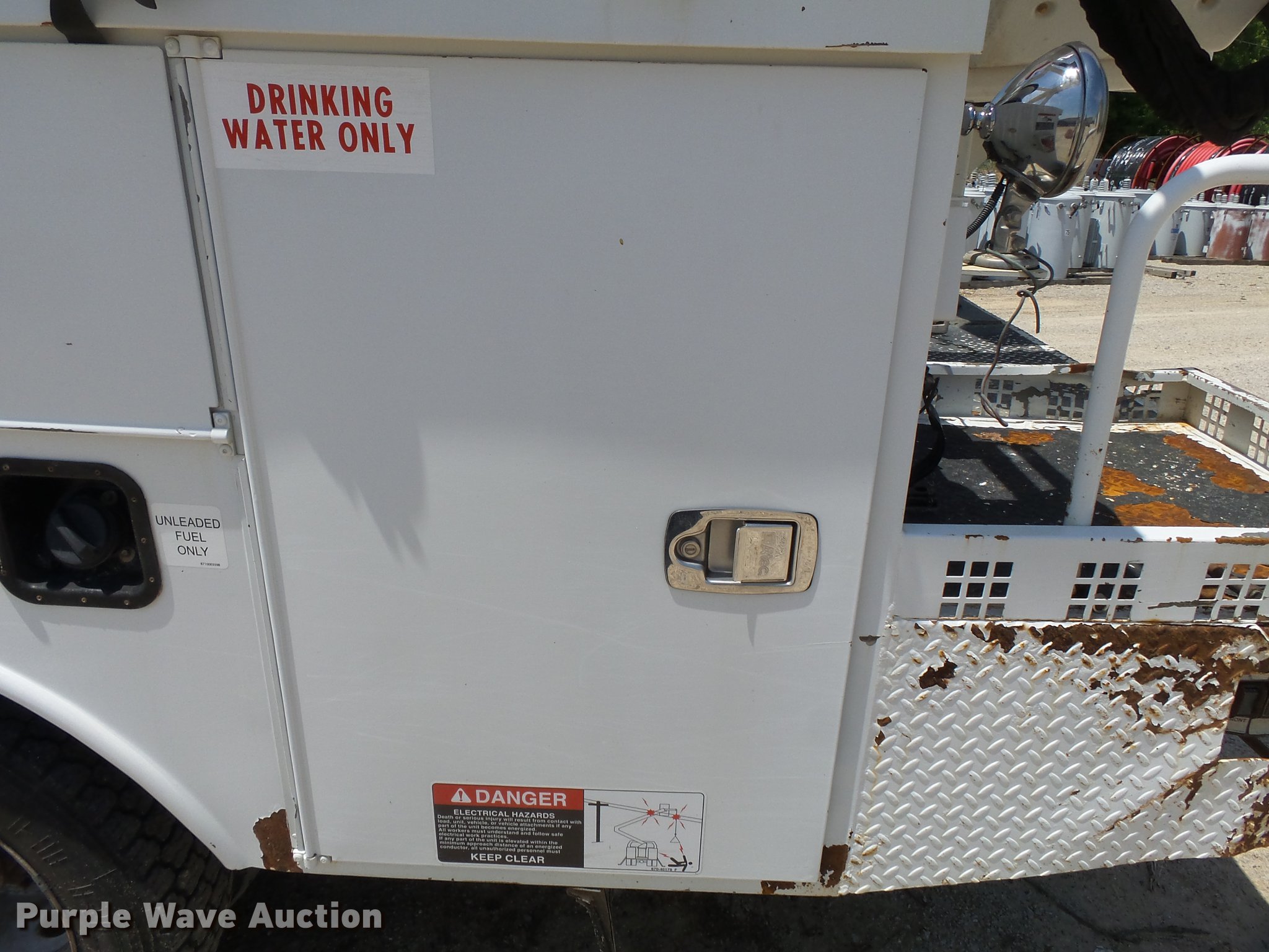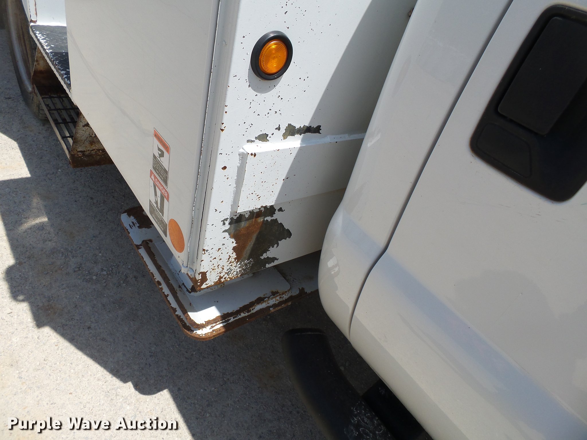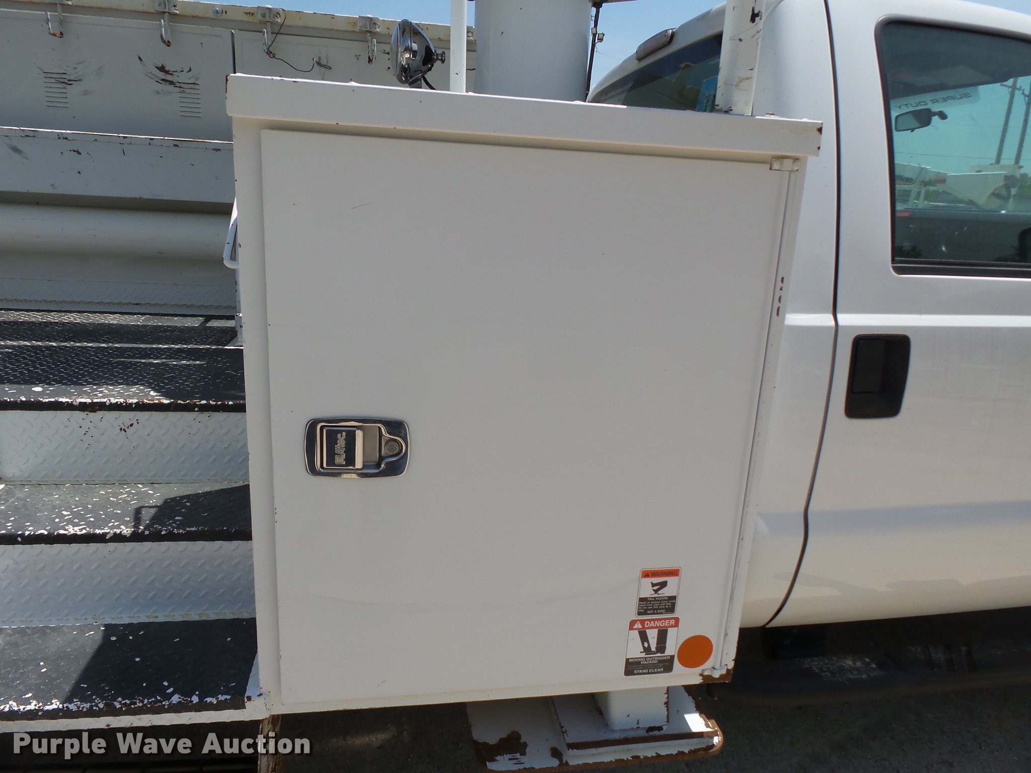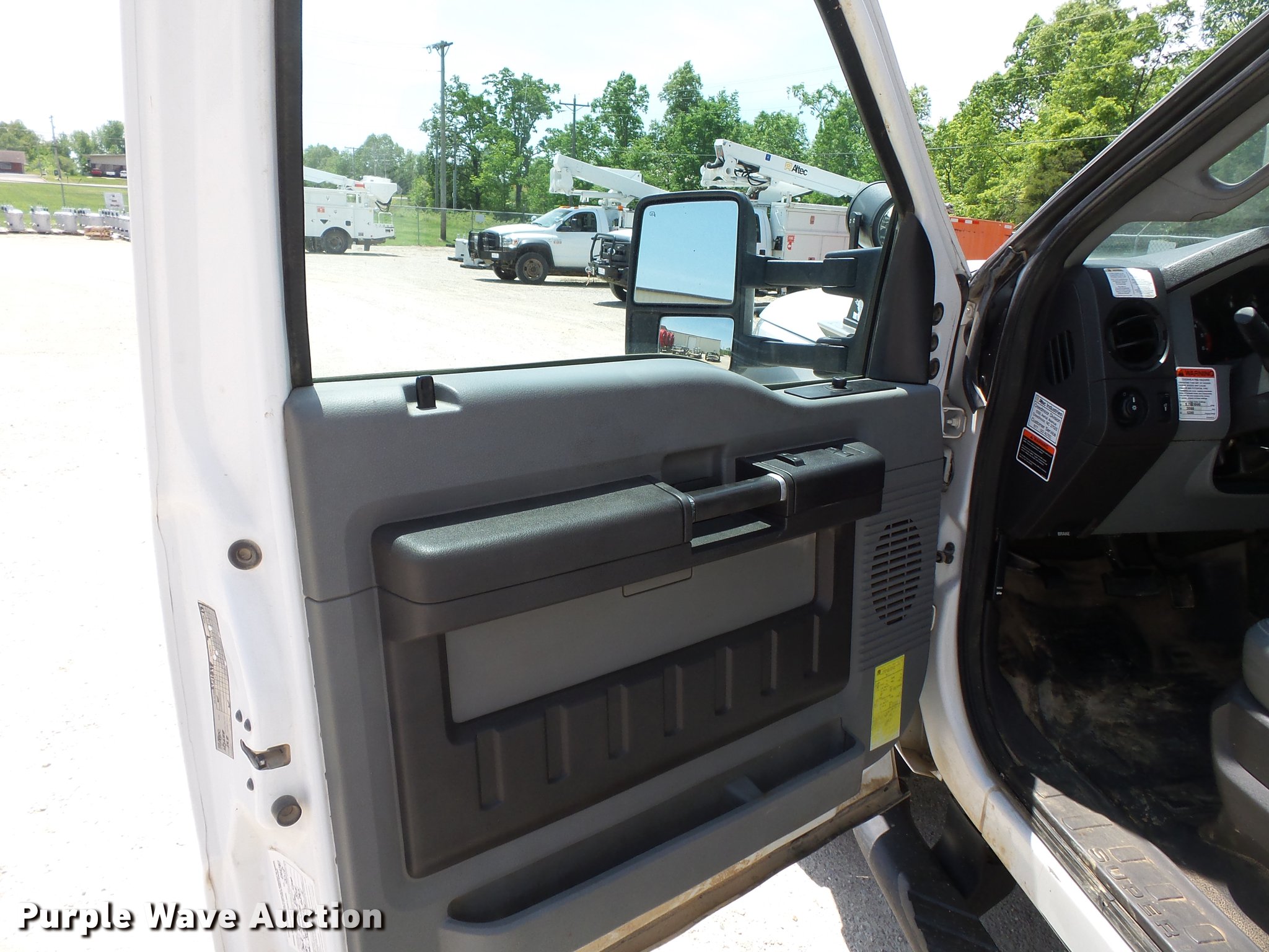 Purple Wave is selling a used Bucket Truck in Missouri. This item is a 2011 Ford F550 Super Duty bucket truck with the following: 157,645 miles on odometer, 585 PTO hours on meter, 6.8L V10 gas engine, Automatic transmission, AC and heat, AM/FM, Power windows, locks, and mirrors, Suspension seat, Auxiliary controls, Backup camera, Backup alarm, PTO, Beacon light, Front tow hooks, Altec 13'4"L utility bed, Shelving, Slide-out drawers, Catwalk, Work lights, Serial 2719081708611, Warn winch, 15,000 lbs capacity, M4-TE winch, 800 lbs capacity, 2011 Altec AT40M boom, 400 lbs maximum lift capcity, 40' maximum lift height, Man basket, Platform and ground controls, Boom rotation, Articulating, insulated, telescopic boom, Rope material handler, Certification valid through September 2018, Single fuel tank, Pintle hitch, Trailer wiring, 165" wheelbase, Spring suspension, Hydraulic brakes, 225/70R19.5 tires, GVWR 19,500 lbs, View Aerial Device Test Report
