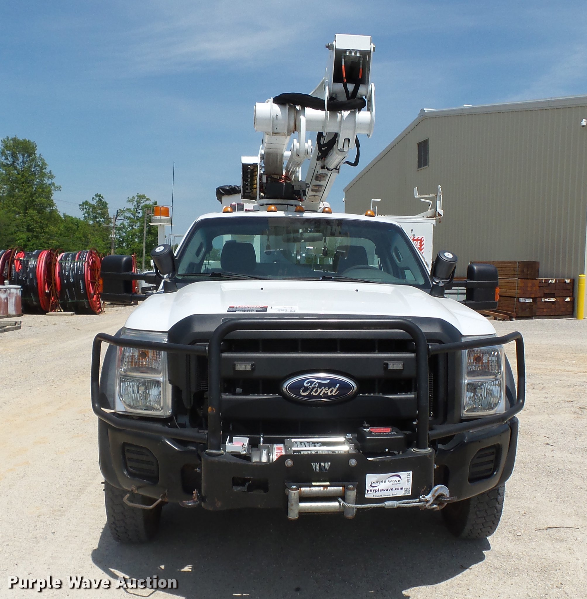 2011 Ford F550 Super Duty bucket truck. 127,394 miles on odometer, 1,276 PTO hours on meter, 6.8L V10 gas engine, Automatic transmission, Four wheel drive, Single axle, AC and heat, AM/FM, Power windows, locks, and mirorrs, Suspension seat, Trailer brake controller, Auxiliary controls, Backup alarm, PTO, Beacon light, Front tow hooks, Altec 13'4"L utility bed Shelving, Slide-out drawers, Catwalk, Work lights, Serial 27165966371010, Warn winch 15,000 lbs capacity, My-TE rope winch 800 lbs capacity, 2010 Altec AT40M boom 40' maximum lift height, Platform and ground controls, Boom rotation, Articulating, insulated, telescopic boom, Rope material handler, Outrigges, Certification valid through September 2018, Single fuel tank, Pintle hitch, Trailer wiring, 165" wheelbase, Spring suspension, Hydraulic brakes, 225/70R19.5 tires, GVWR 19,500 lbs, View Aerial Device Test Report , Unit# 44. View repairs. Missouri title. 1FDUF5HY7BEA30167. Ozark Border Electric Cooperative. 3281 S Westwood Blvd. Poplar Bluff, MO 63901