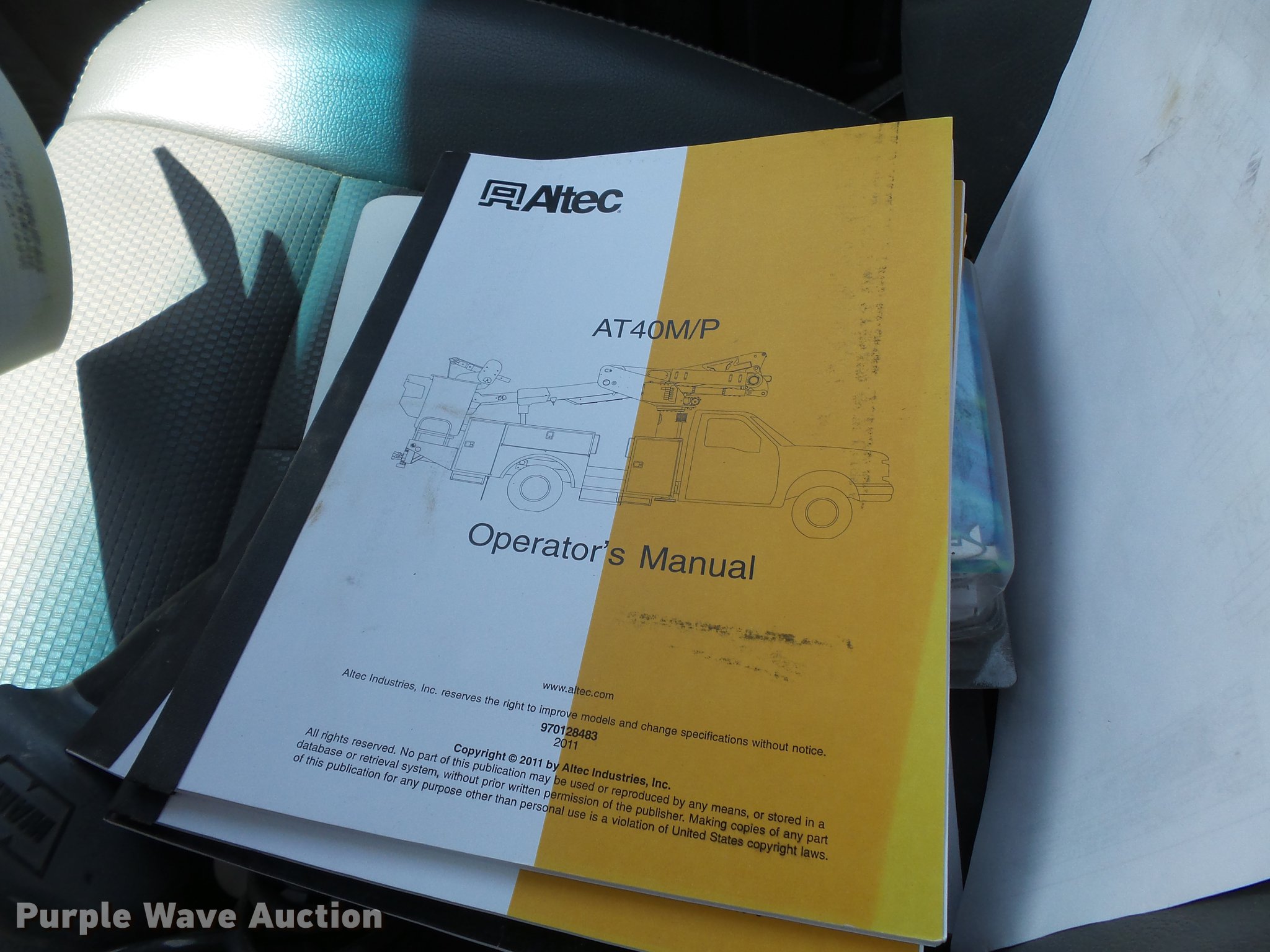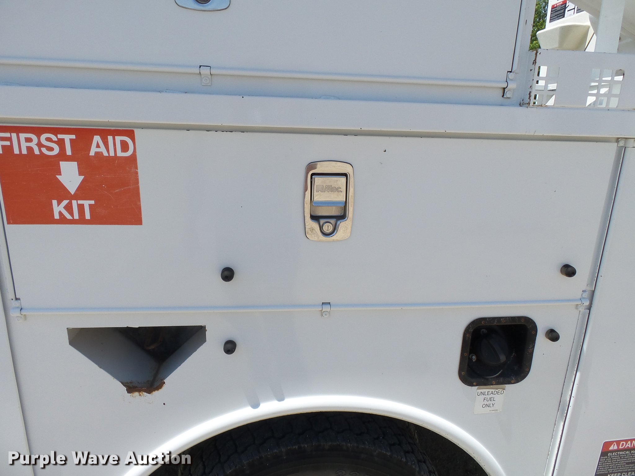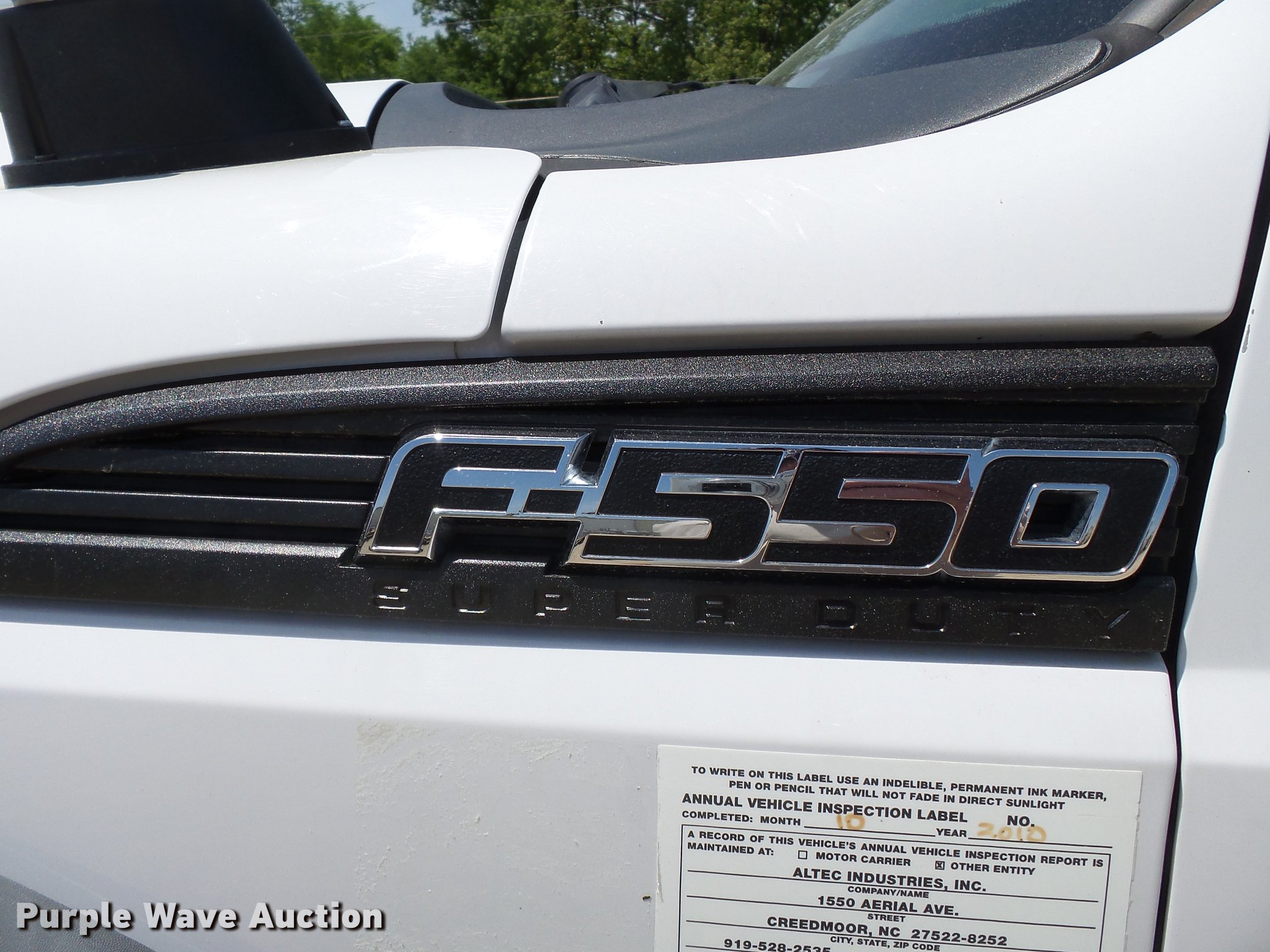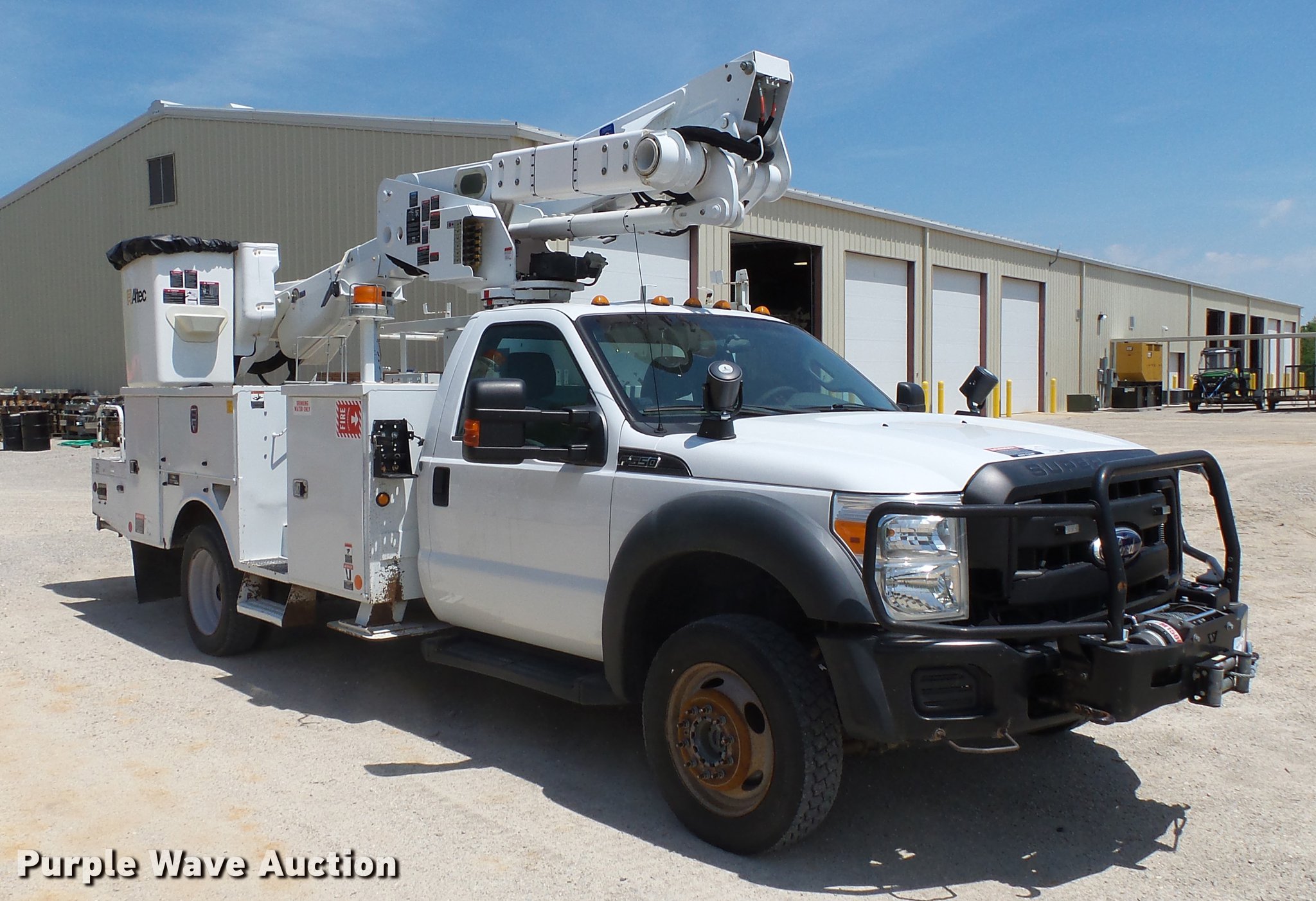 Purple Wave is selling a used Bucket Truck in Missouri. This item is a 2011 Ford F550 Super Duty bucket truck with the following: 127,394 miles on odometer, 1,276 PTO hours on meter, 6.8L V10 gas engine, Automatic transmission, Four wheel drive, Single axle, AC and heat, AM/FM, Power windows, locks, and mirorrs, Suspension seat, Trailer brake controller, Auxiliary controls, Backup alarm, PTO, Beacon light, Front tow hooks, Altec 13'4"L utility bed, Shelving, Slide-out drawers, Catwalk, Work lights, Serial 27165966371010, Warn winch, 15,000 lbs capacity, My-TE rope winch, 800 lbs capacity, 2010 Altec AT40M boom, 40' maximum lift height, Platform and ground controls, Boom rotation, Articulating, insulated, telescopic boom, Rope material handler, Outrigges, Certification valid through September 2018, Single fuel tank, Pintle hitch, Trailer wiring, 165" wheelbase, Spring suspension, Hydraulic brakes, 225/70R19.5 tires, GVWR 19,500 lbs, View Aerial Device Test Report, Unit# 44