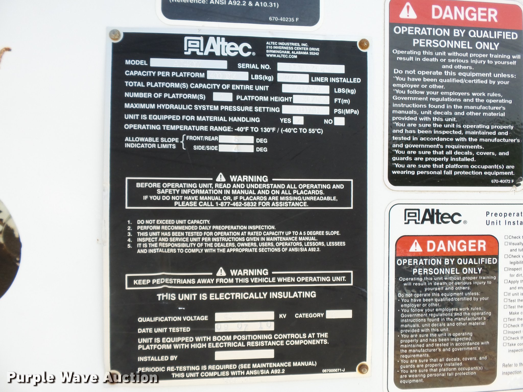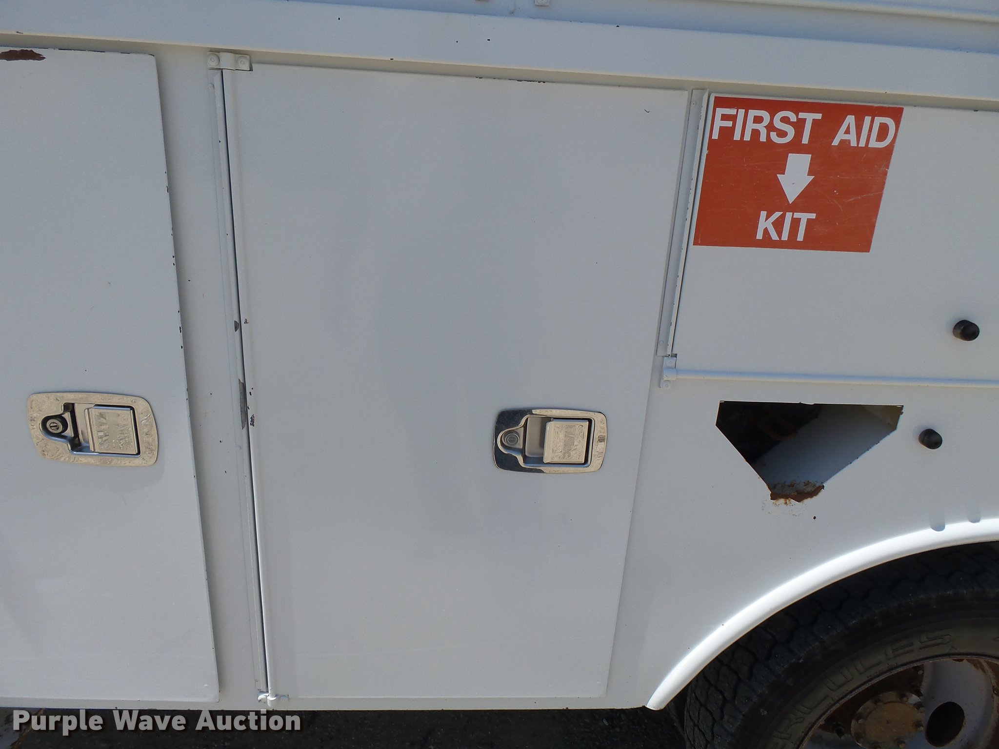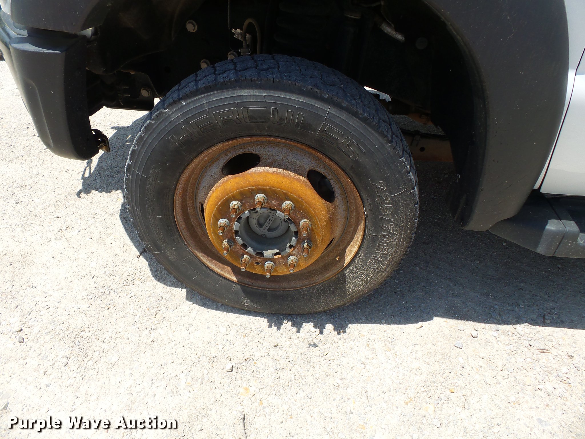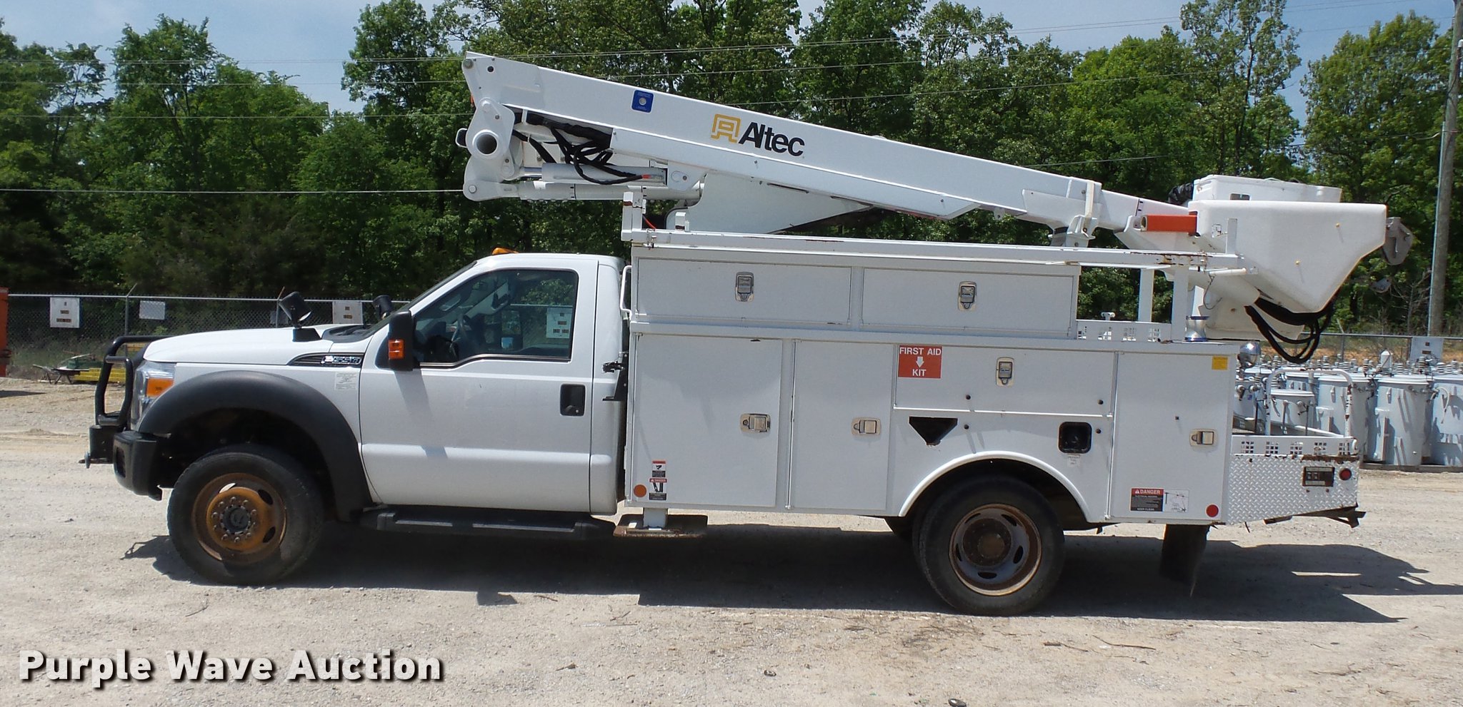 Purple Wave is selling a used Bucket Truck in Missouri. This item is a 2011 Ford F550 Super Duty bucket truck with the following: 127,394 miles on odometer, 1,276 PTO hours on meter, 6.8L V10 gas engine, Automatic transmission, Four wheel drive, Single axle, AC and heat, AM/FM, Power windows, locks, and mirorrs, Suspension seat, Trailer brake controller, Auxiliary controls, Backup alarm, PTO, Beacon light, Front tow hooks, Altec 13'4"L utility bed, Shelving, Slide-out drawers, Catwalk, Work lights, Serial 27165966371010, Warn winch, 15,000 lbs capacity, My-TE rope winch, 800 lbs capacity, 2010 Altec AT40M boom, 40' maximum lift height, Platform and ground controls, Boom rotation, Articulating, insulated, telescopic boom, Rope material handler, Outrigges, Certification valid through September 2018, Single fuel tank, Pintle hitch, Trailer wiring, 165" wheelbase, Spring suspension, Hydraulic brakes, 225/70R19.5 tires, GVWR 19,500 lbs, View Aerial Device Test Report, Unit# 44