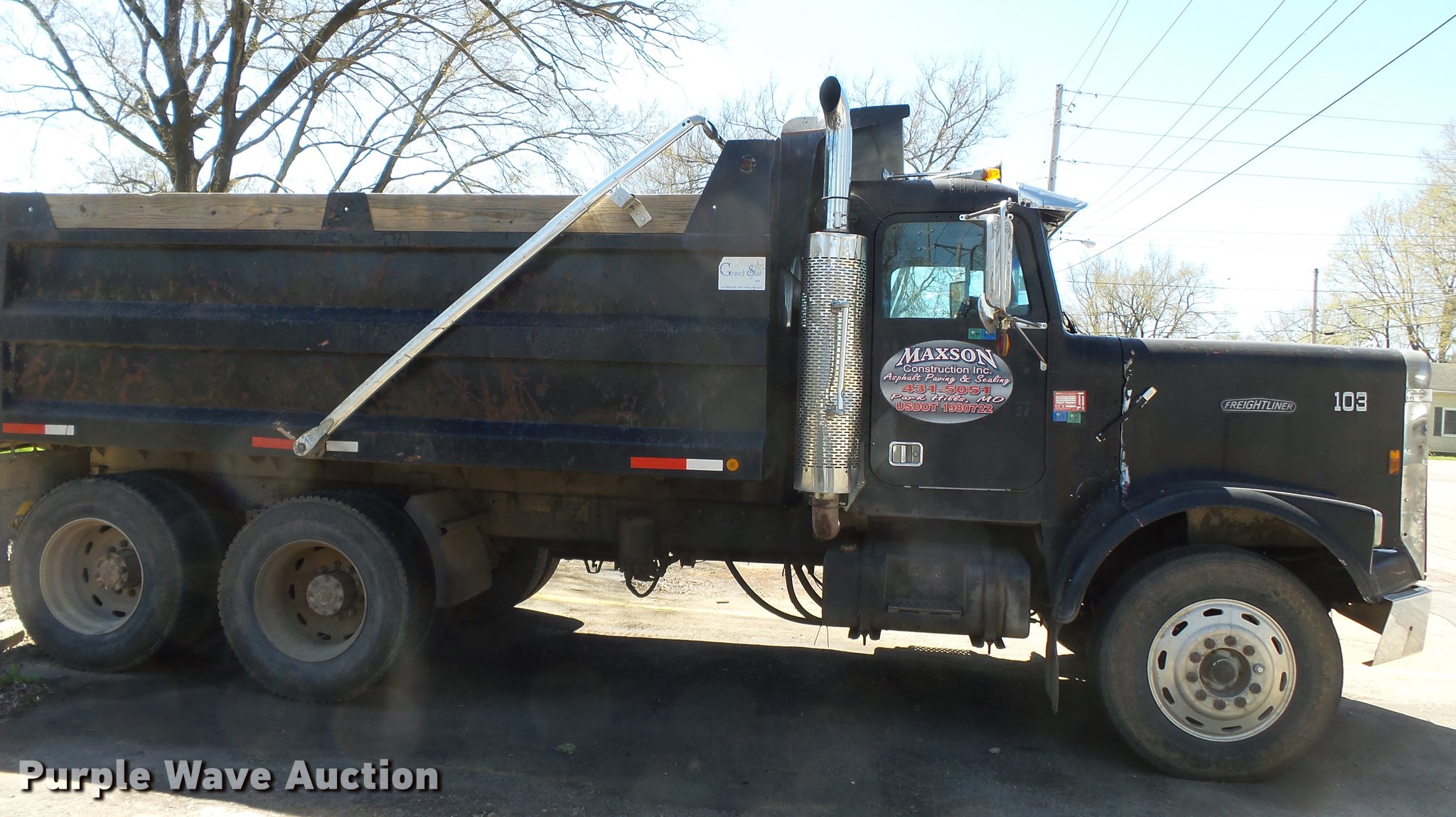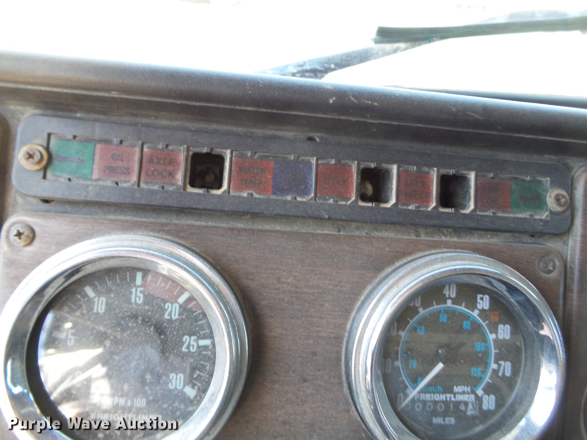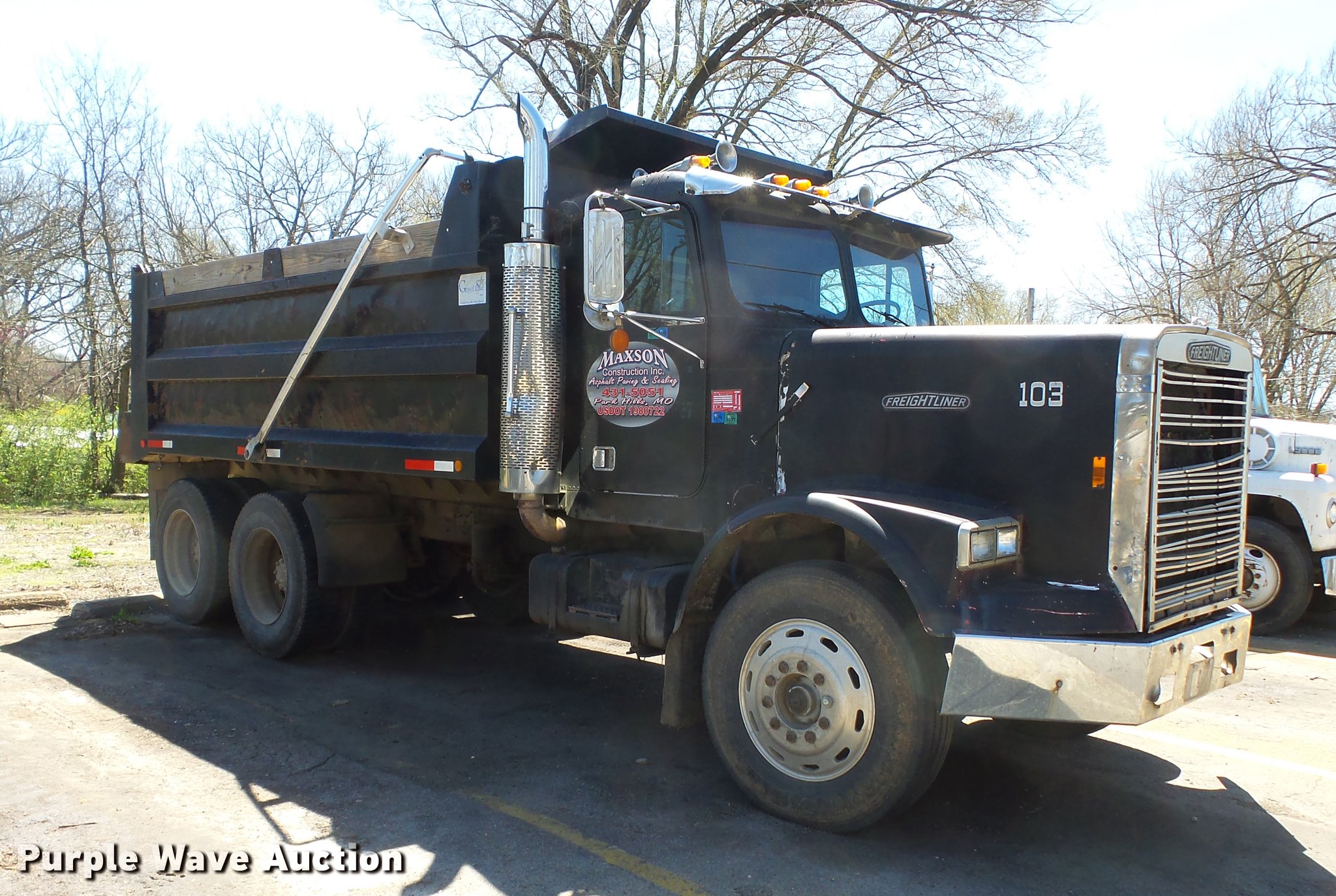 Purple Wave is selling a used Construction Dump Truck in Missouri. This item is a 1987 Freightliner FLC dump truck with the following: 14 miles on odometer, Actual miles unknown, Cummins 14.0L L6 turbo diesel engine, Eight speed manual transmission, Tandem axle, AC and heat, AM/FM/CD, Air suspension seat, PTO, Block heater, Exterior visor, Crown Gravel Star steel dump bed, 15'L x 95"W, 46" side height, 8" side board height, Single ram hoist, Air operated end gate, Roll tarp, Dual fuel tanks, Spring suspension, Air brakes, 200" wheelbase, 11R24.5 tires