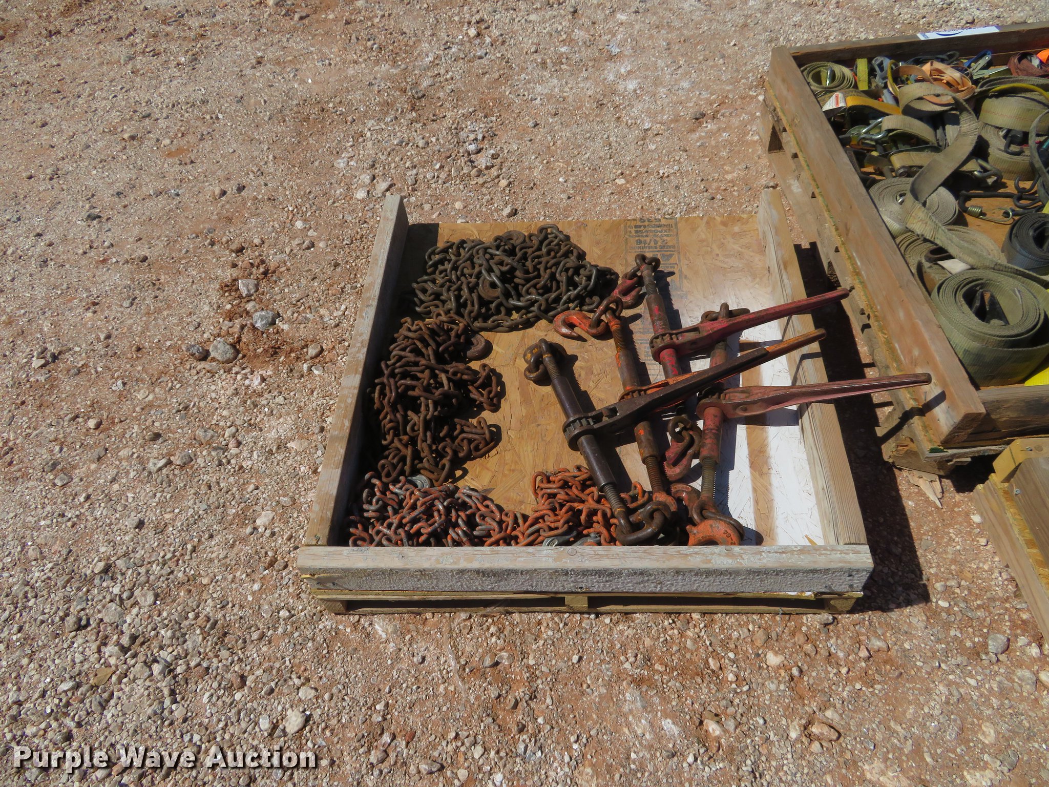 Purple Wave is selling a used Tools in Oklahoma. This item is a Tools with the following: Ratchet straps, Tie downs, Chains/ratchets, Snow chains and more