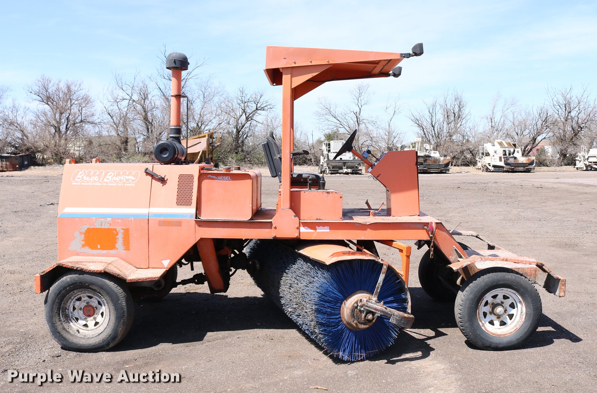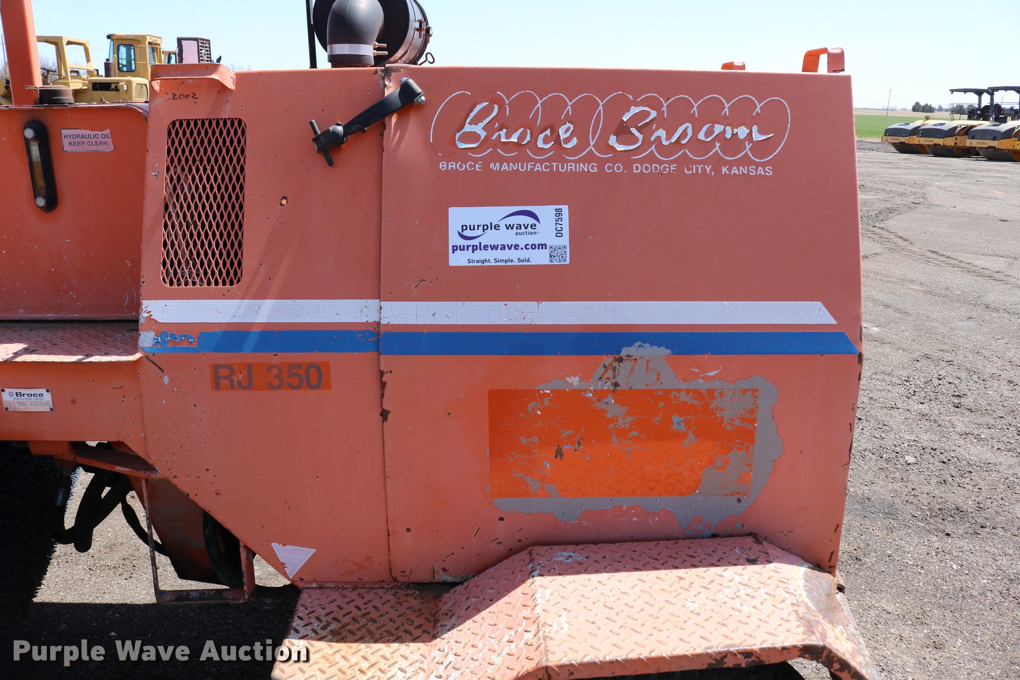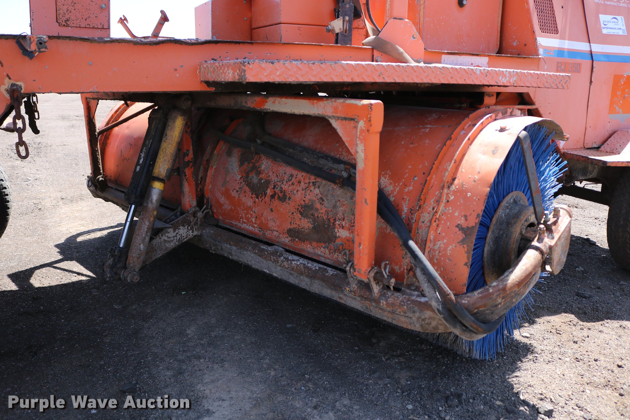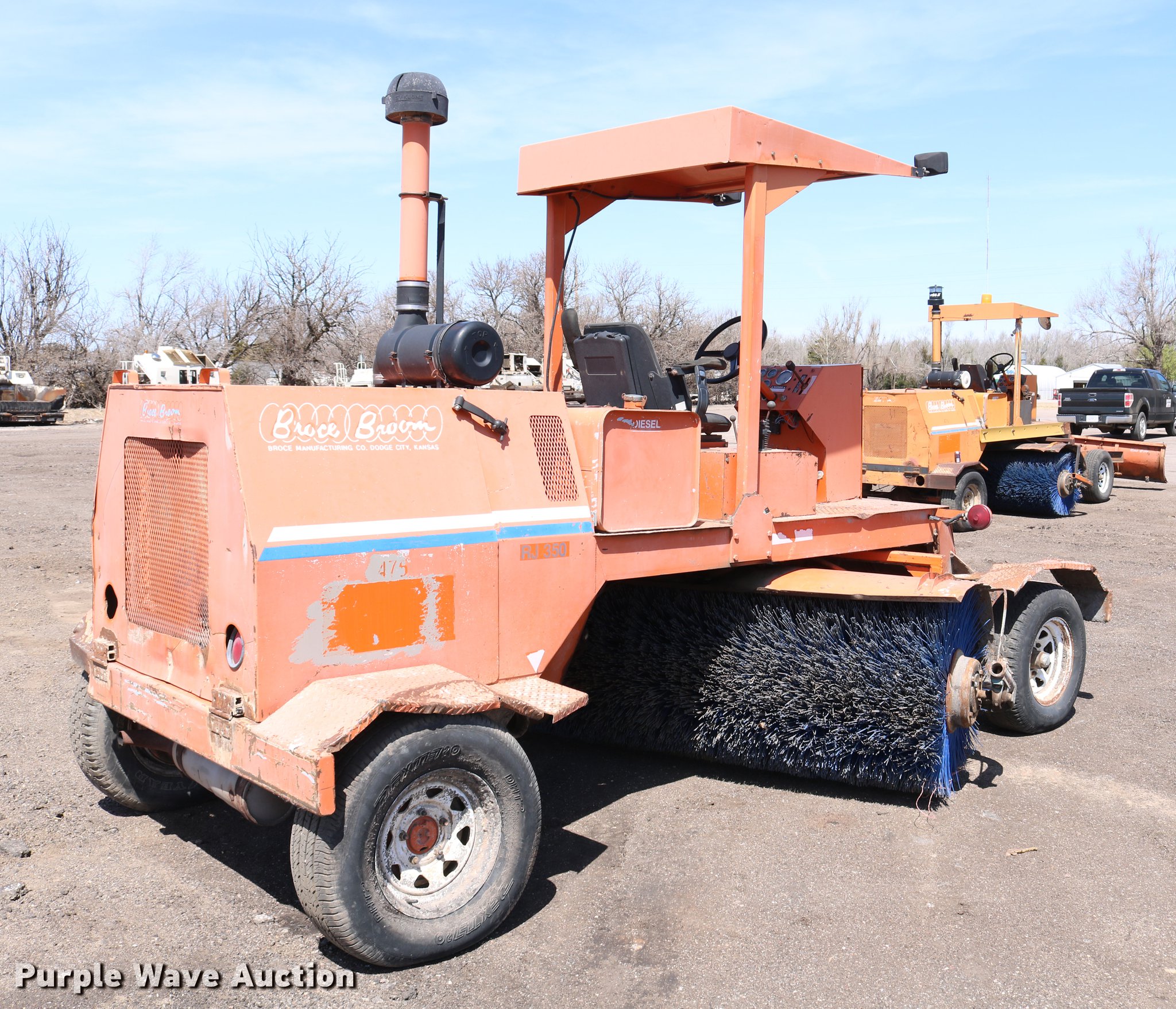 Purple Wave is selling a used Broom in Kansas. This item is a Broce RJ350 broom with the following: 4,210 hours on meter, John Deere 4045DF150 four cylinder diesel engine, 60 kW, Serial PE4045D199333, Two speed hydrostatic transmission, OROPS, Front work lights, 8'W broom, Hydraulic lift, tilt, and rotation, 235/75R15 tires, Lights broken, Serial RJ350402227