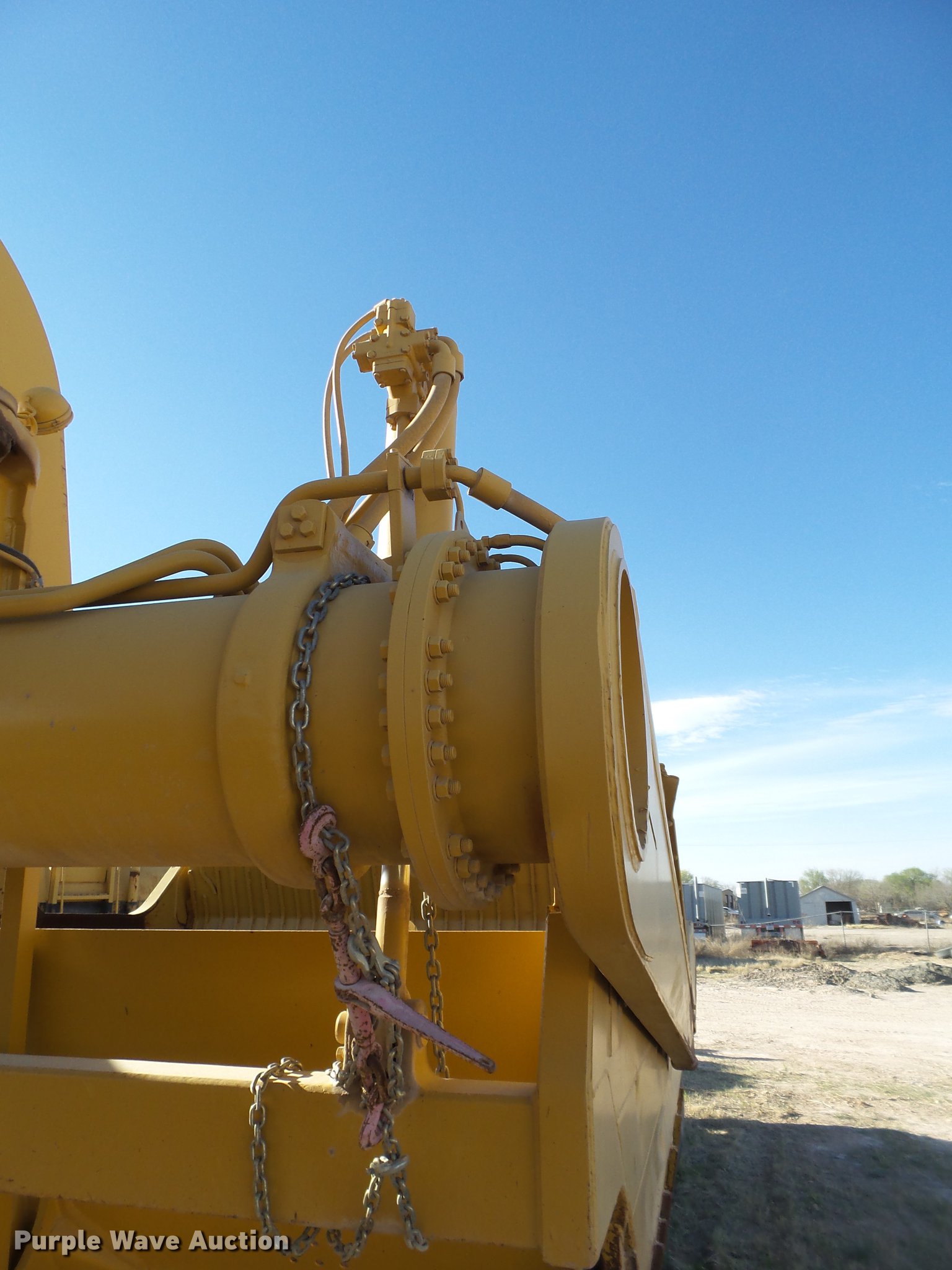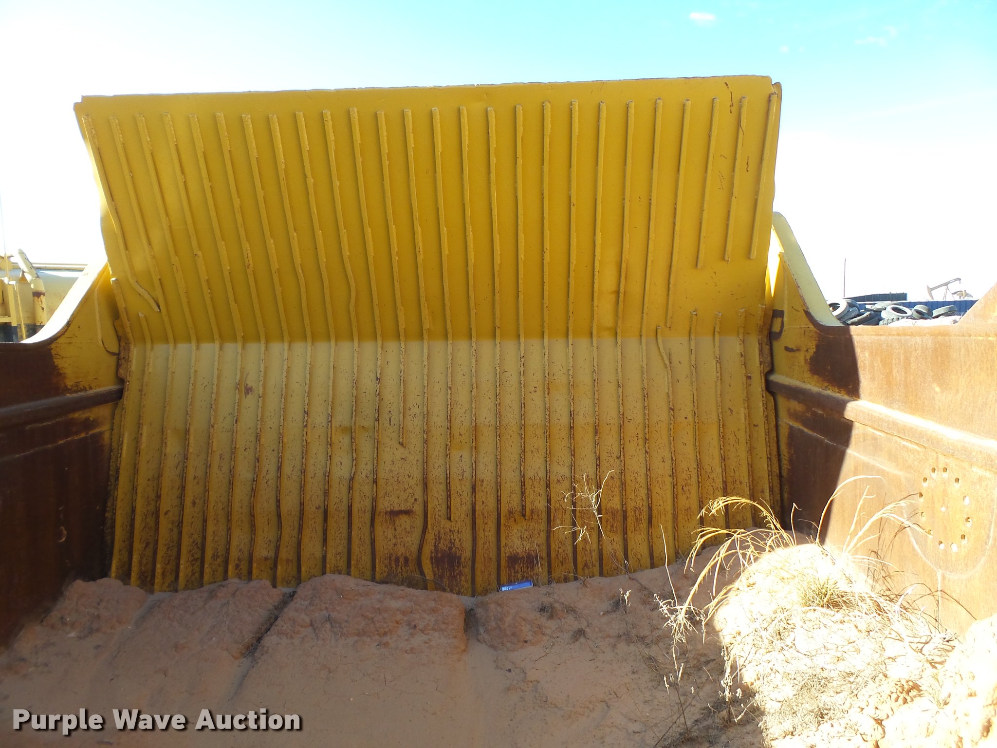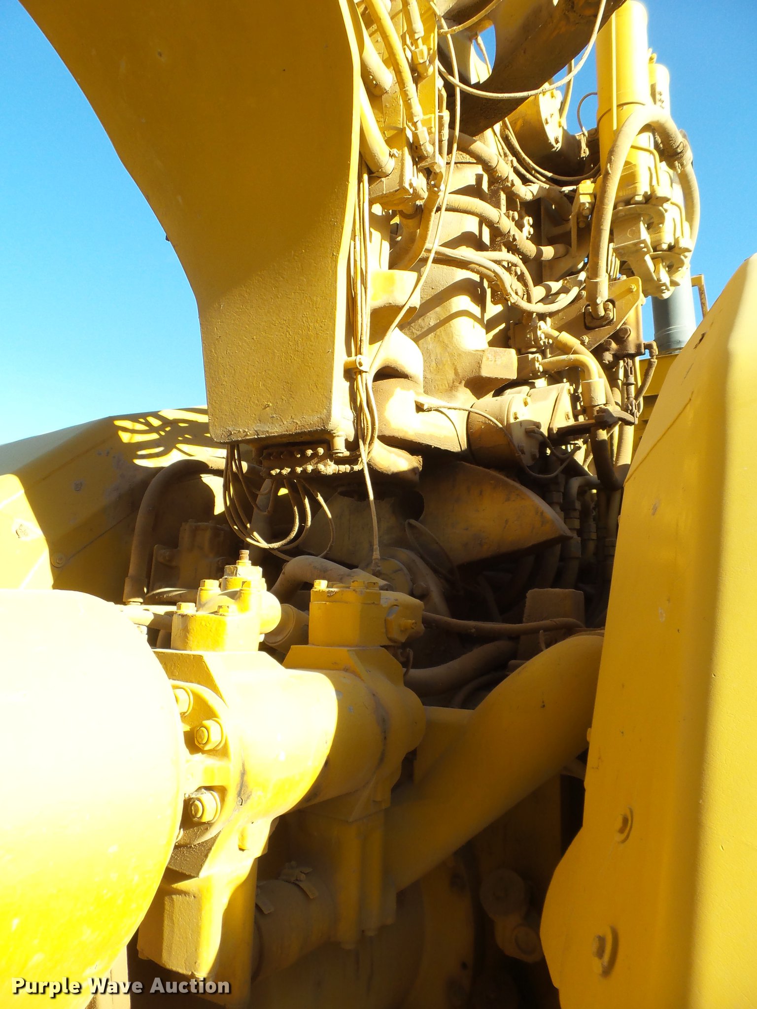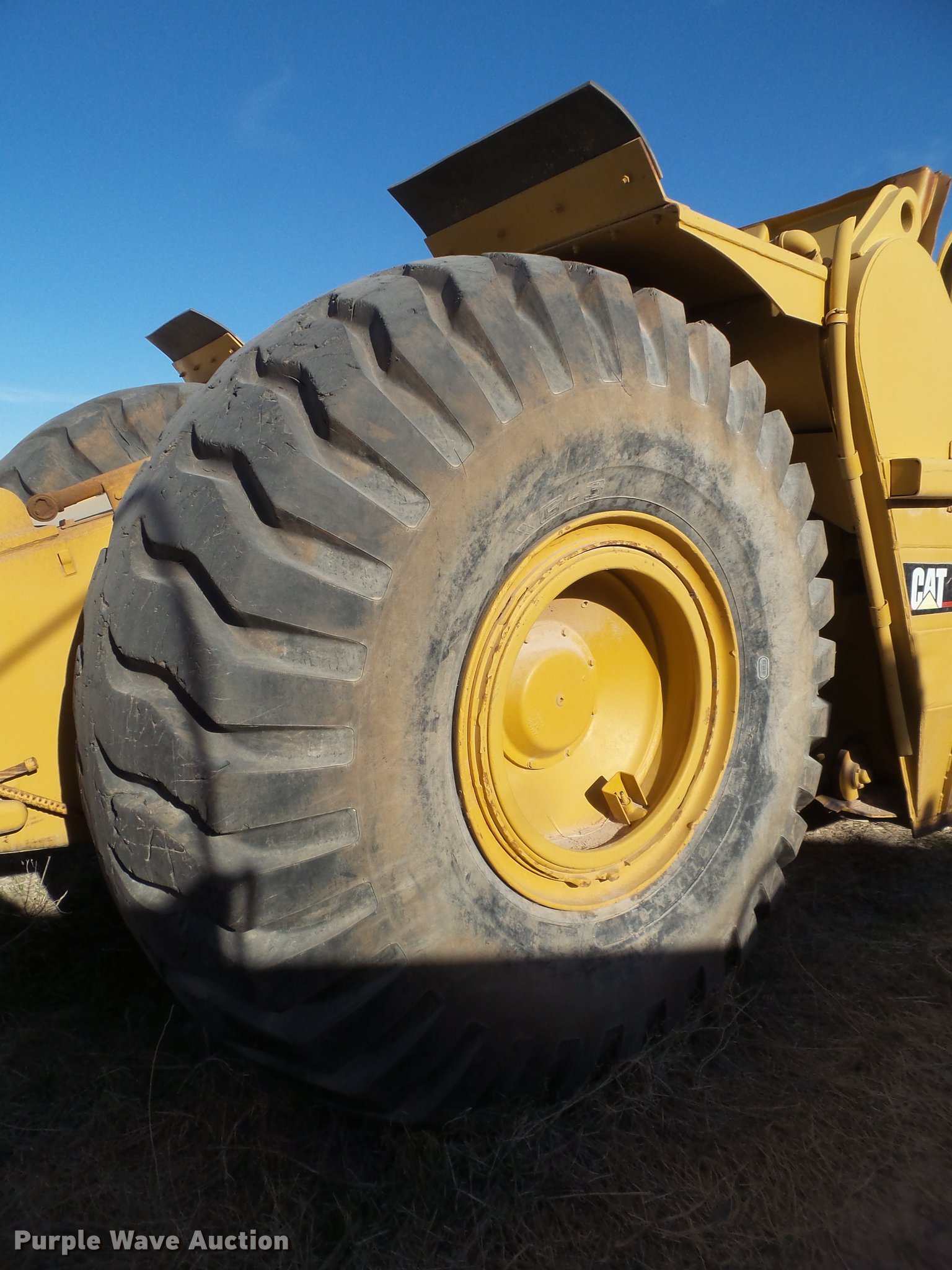 Purple Wave is selling a used Conventional Scraper in Texas. This item is a 1988 Caterpillar 631E conventional scraper with the following: 16,578 hours on meter, Caterpillar 3408 eight cylinder turbo diesel engine, 450 HP, Serial 48W26474, Manual transmission, 7F-1R gears, Enclosed cab, Heat, Suspension seat, 31 cu.yd. bowl capacity, Three lever controls, Hydraulic lift, Elevator reverse, Cushion hitch, 37.25R35 tires, Window broken, Engine needs work, Serial 1AB00987