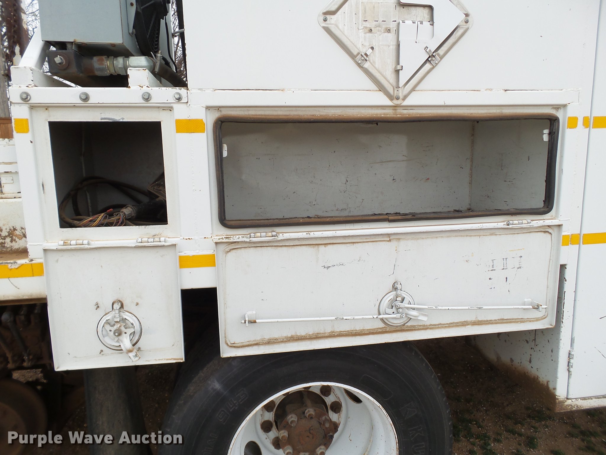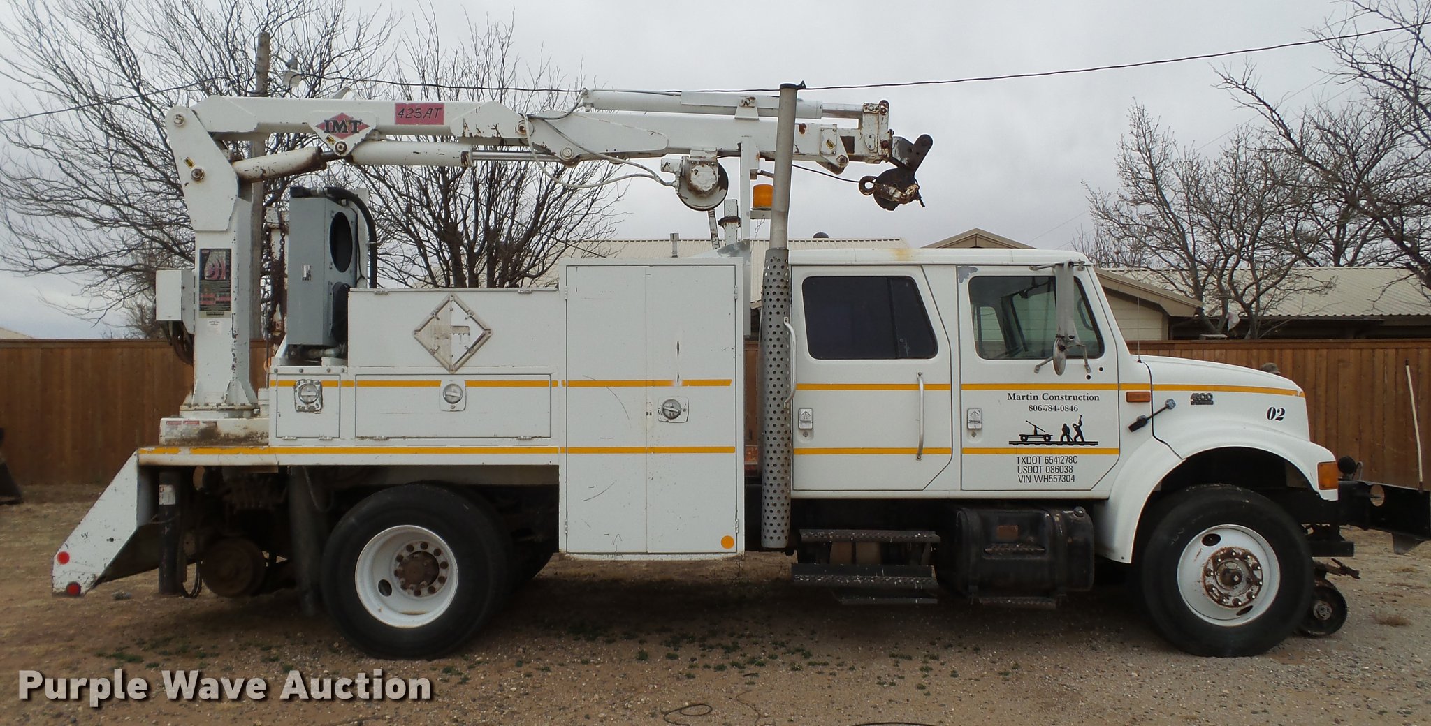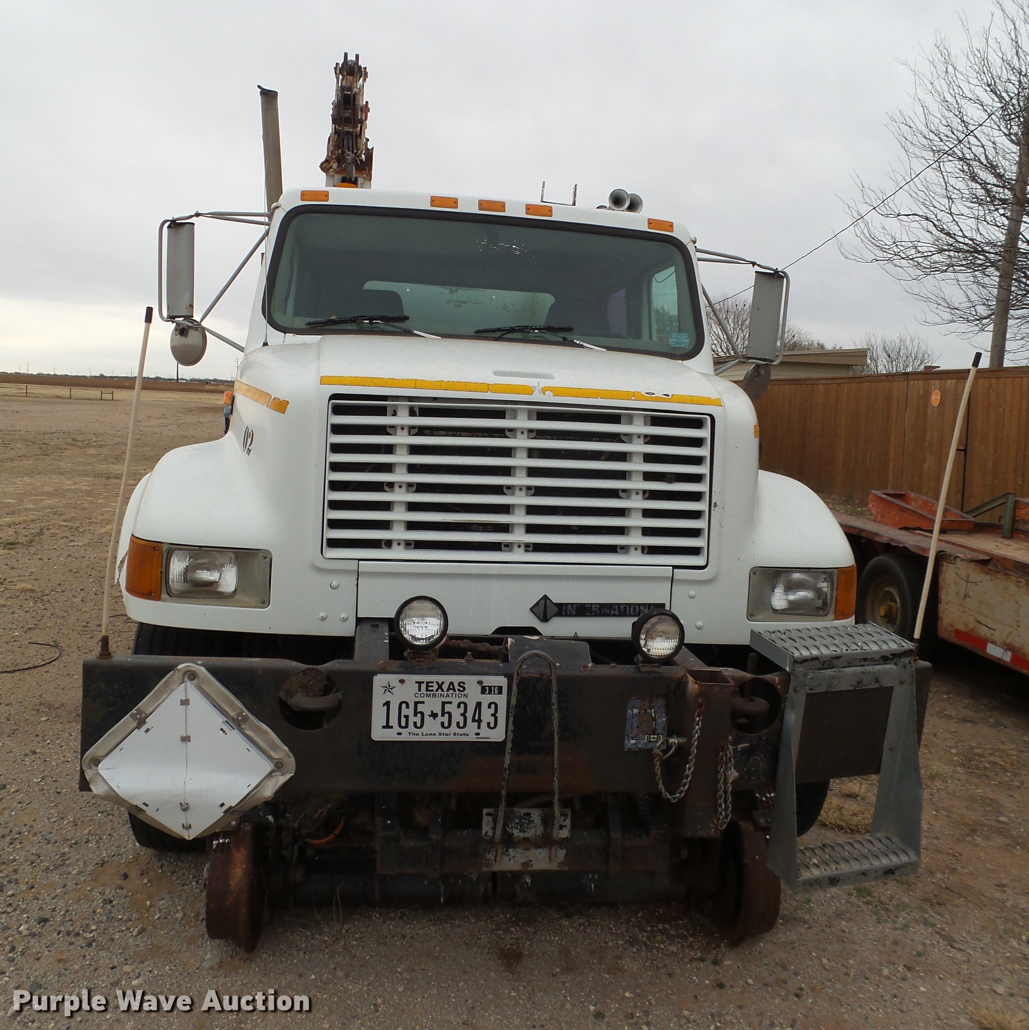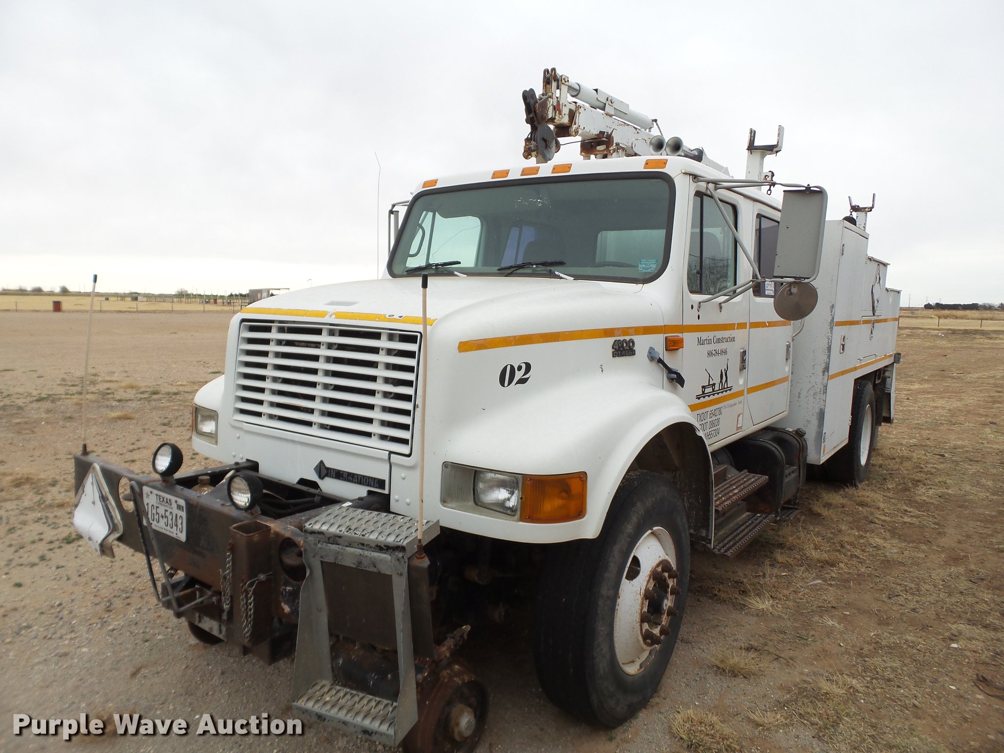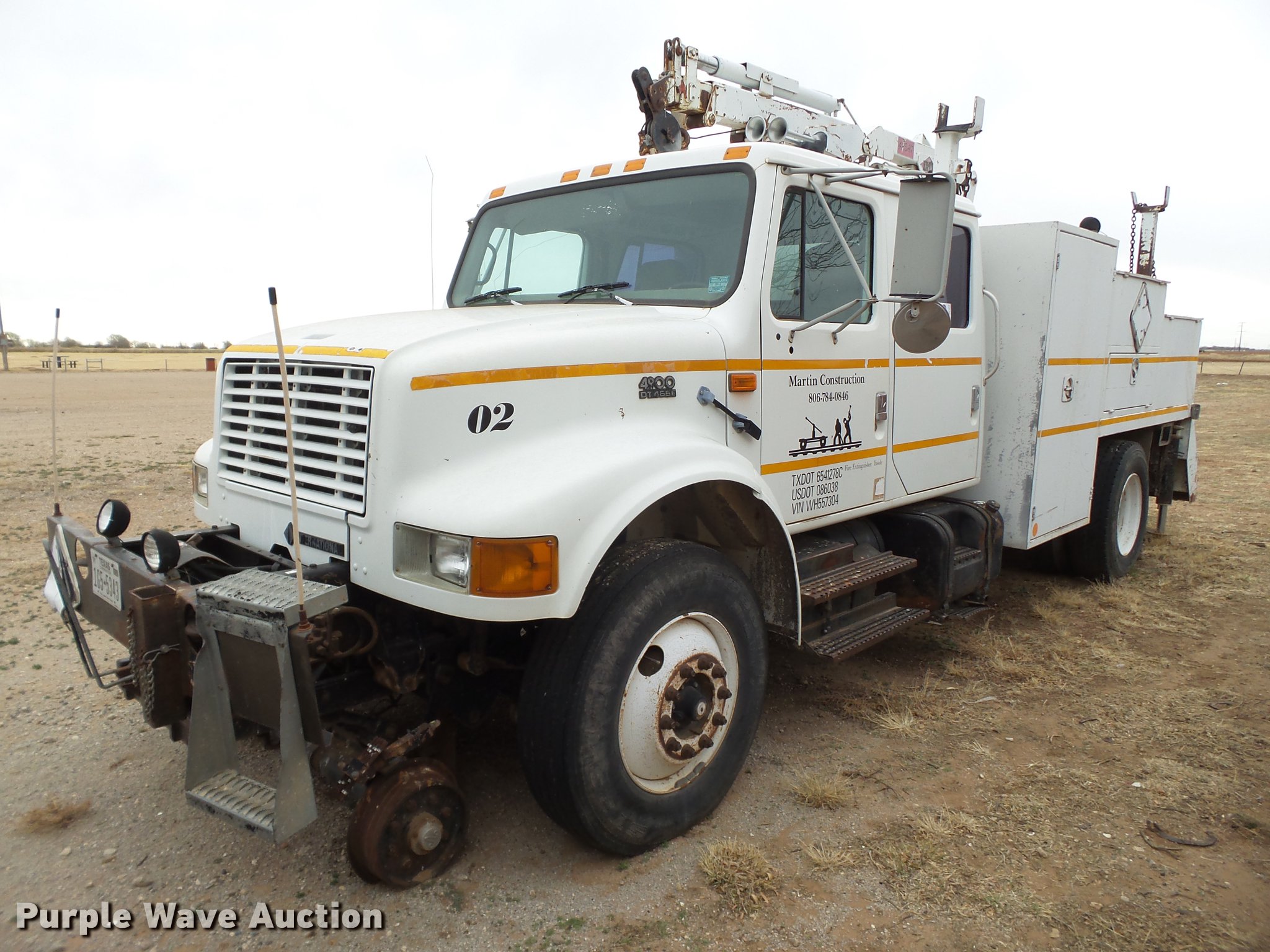 Purple Wave is selling a used Service Truck in Texas. This item is a 1998 International 4900 Crew Cab railroad service truck with crane with the following: 195,211 miles on odometer, 13,251 hours on meter, International DT466 7.6L L6 diesel engine, Single axle, Suspension seat, PTO, Backup alarm, Front tow hooks, Utility bed, Shelving, Hydraulic hoses, Utility rack, Hydraulic operated railroad wheels, Auto Truck 425AT crane, 31' boom length, 4,000 lbs maximum lift capacity, Remote control, Outriggers, Dual fuel tanks, Spring suspension, Air brakes, 11R22.5 tires