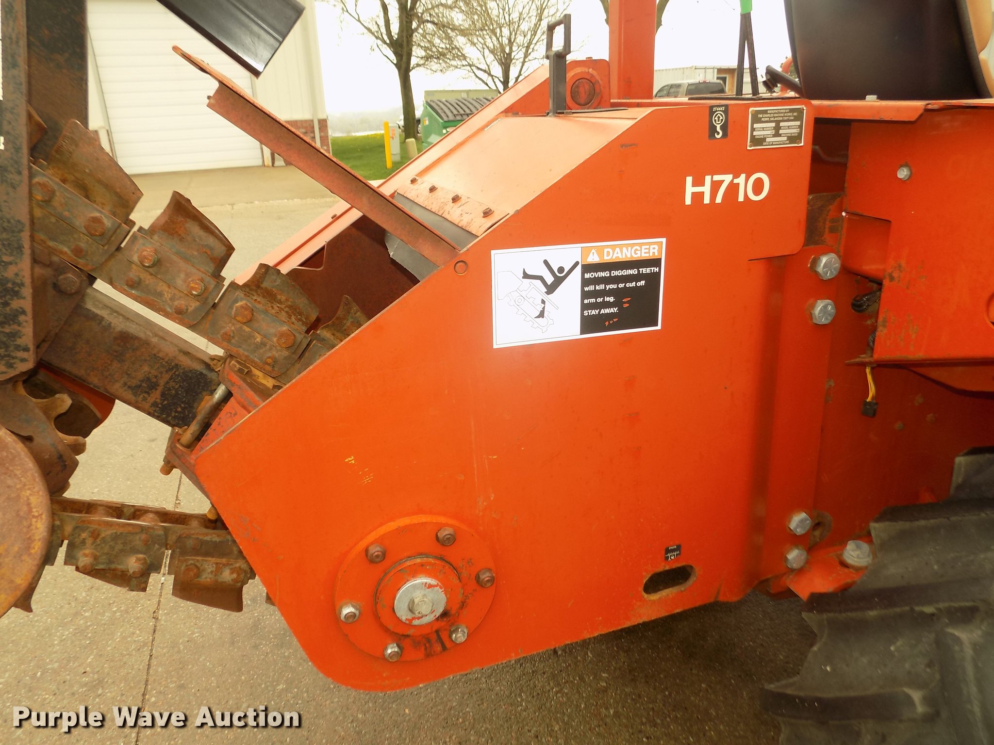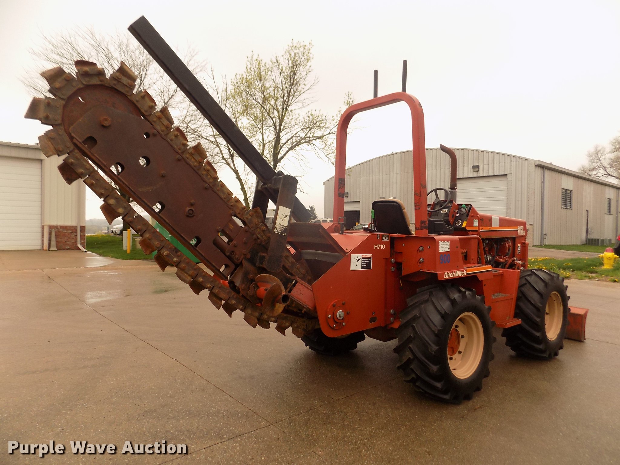 Purple Wave is selling a used Trencher or Rock Saw in Nebraska. This item is a 1998 Ditch Witch 8020T trencher with the following: 2,542 hours on meter, John Deere 4045TF150 turbo diesel engine, Serial T04045T748063, Two speed hydrostatic transmission, Four wheel drive, Four wheel steer, Rear steer, ROPS bar, Suspension seat, Personal restraint bar, Block heater, Trencher model H710, 78" maximum digging depth, 6" cutting width, Serial 2S3773, 72"W six-way backfill blade, Auxiliary hydraulics, 38 x 18.00-20 tires, Serial 5R0280, Unit# 900
