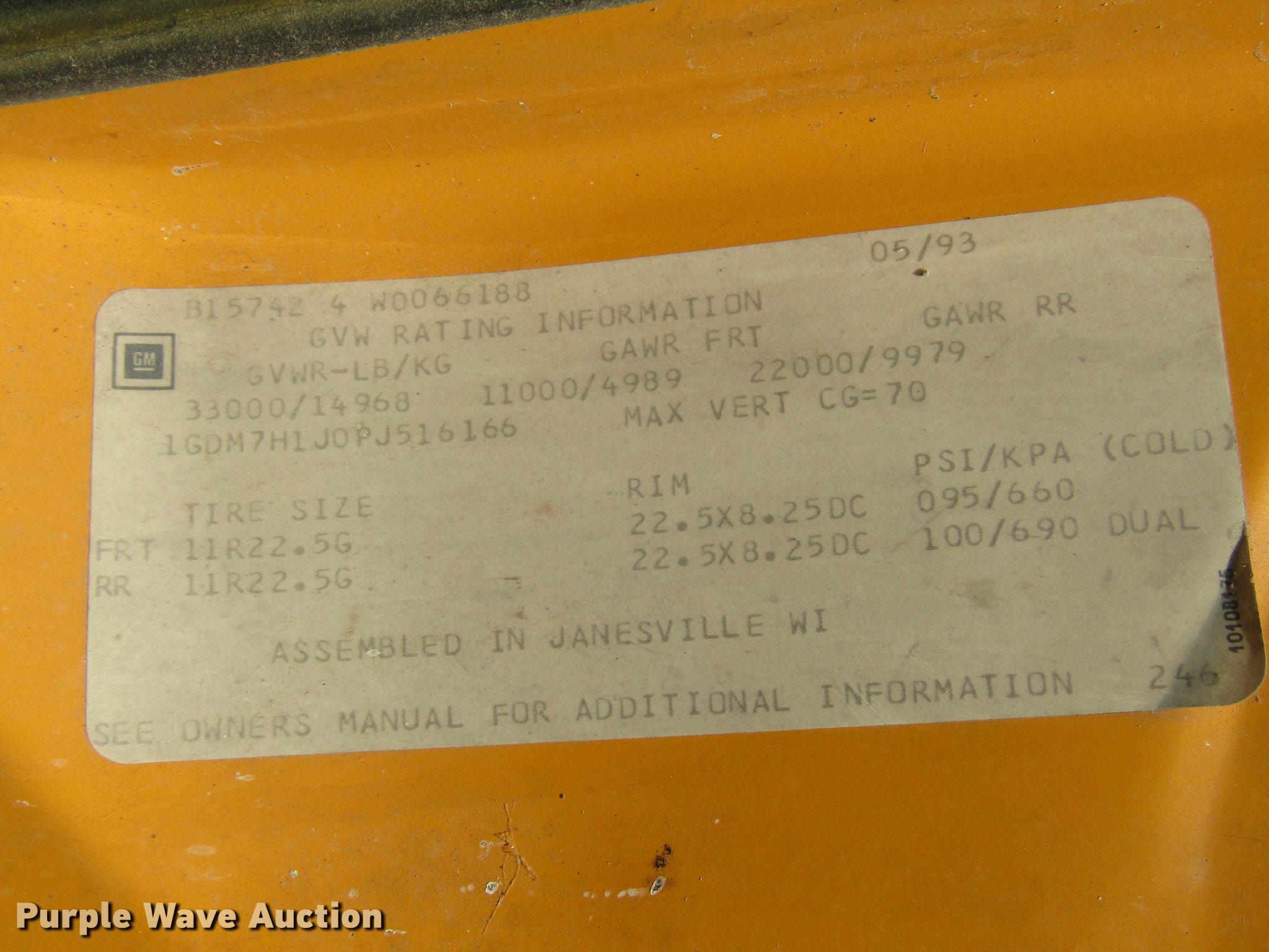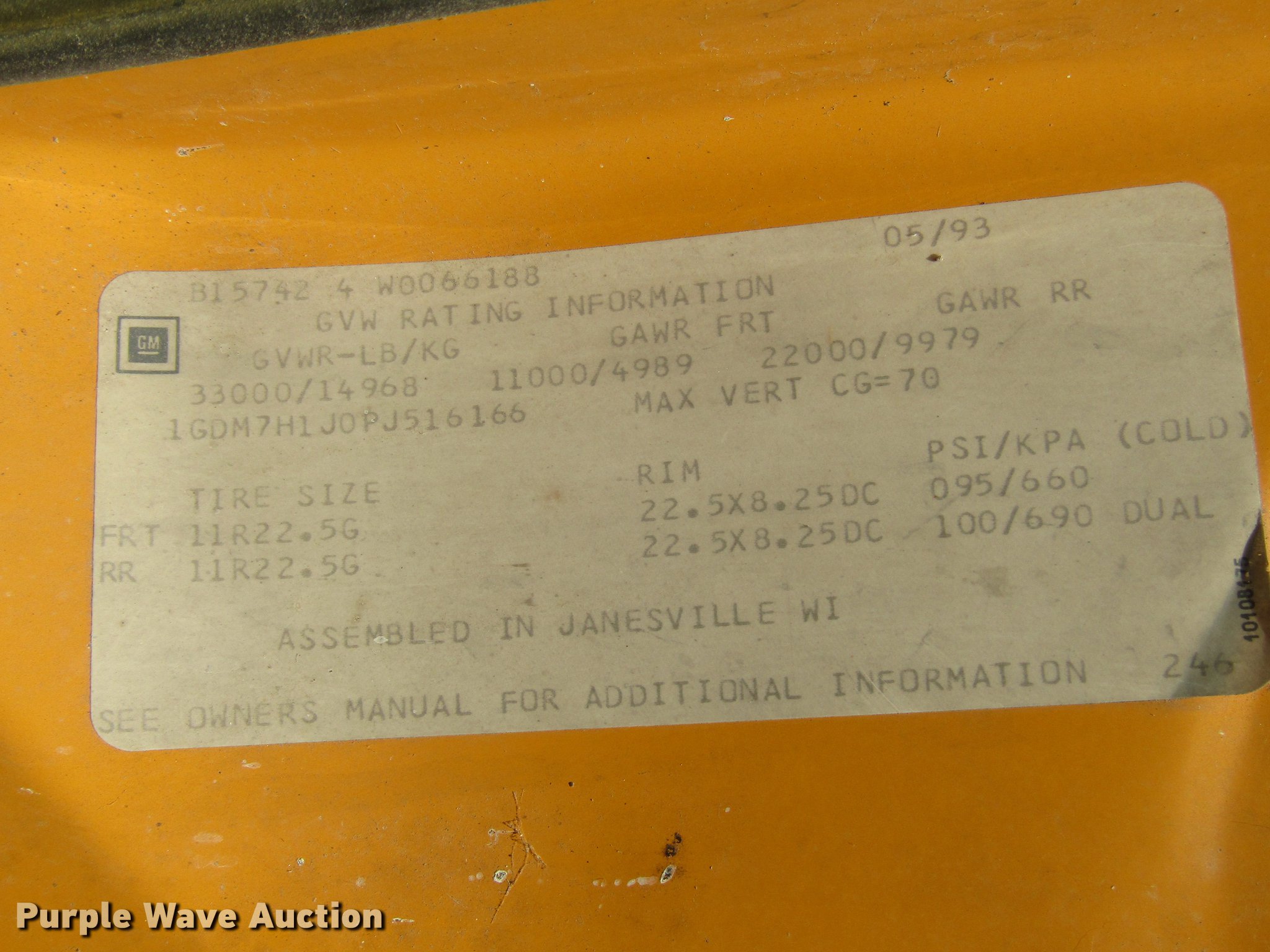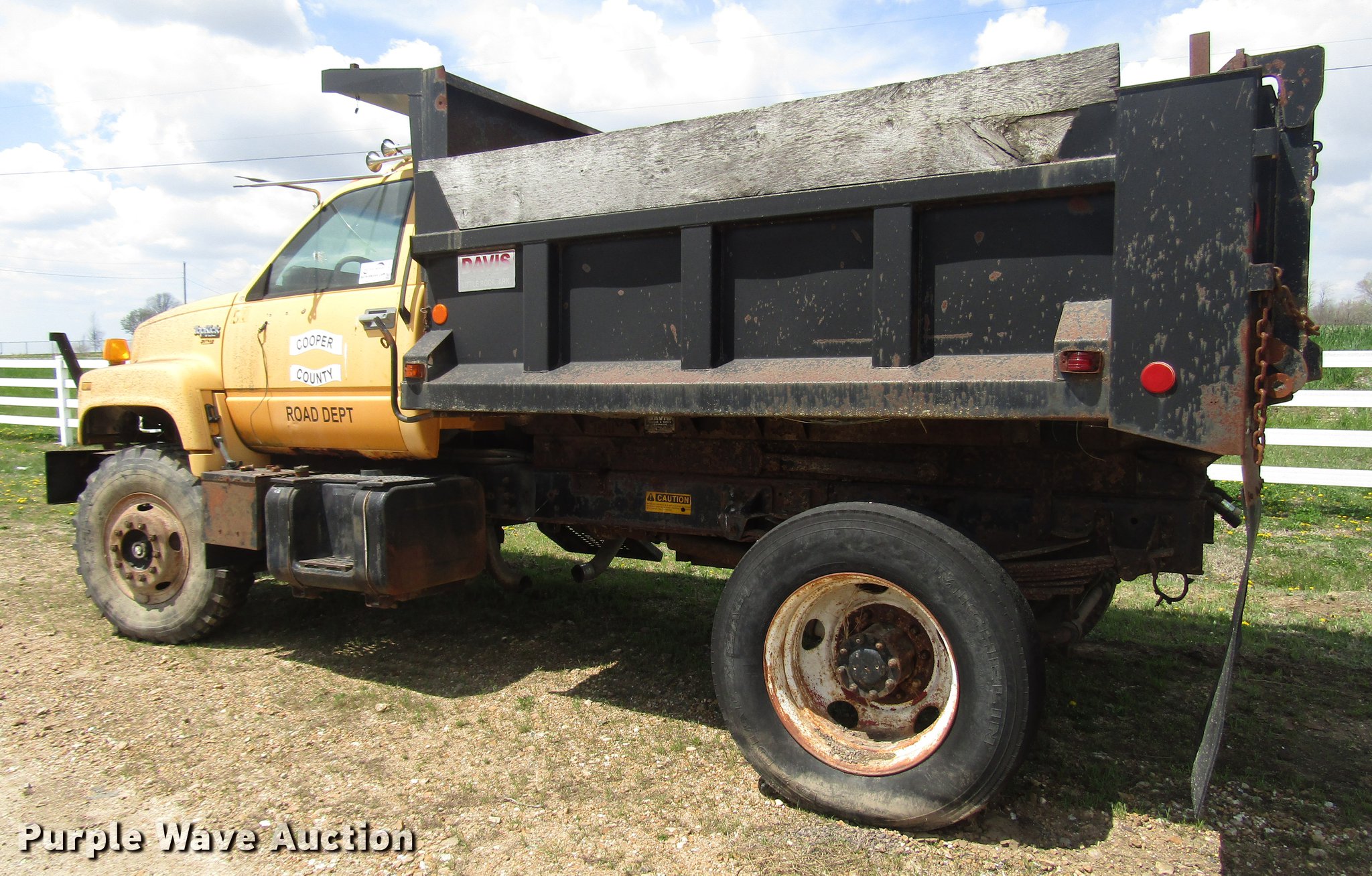 Purple Wave is selling a used Construction Dump Truck in Missouri. This item is a 1993 GMC TopKick dump truck with the following: 36,370 miles on odometer, 938 hours on meter, Caterpillar 3116 6.6L L6 turbo diesel engine, Allison automatic transmission, Single axle, Heat, AM/FM, In-cab plow controls, PTO, 9'10"L x 7'7"W steel dump bed, 28" side height, 12" side board height, Manual operated end gate, Front snow plow bracket, Single fuel tank, Spring suspension, Air brakes, 11.00R20XL tires, GVWR 33,000 lbs, No drivers seat, Non-operational unit