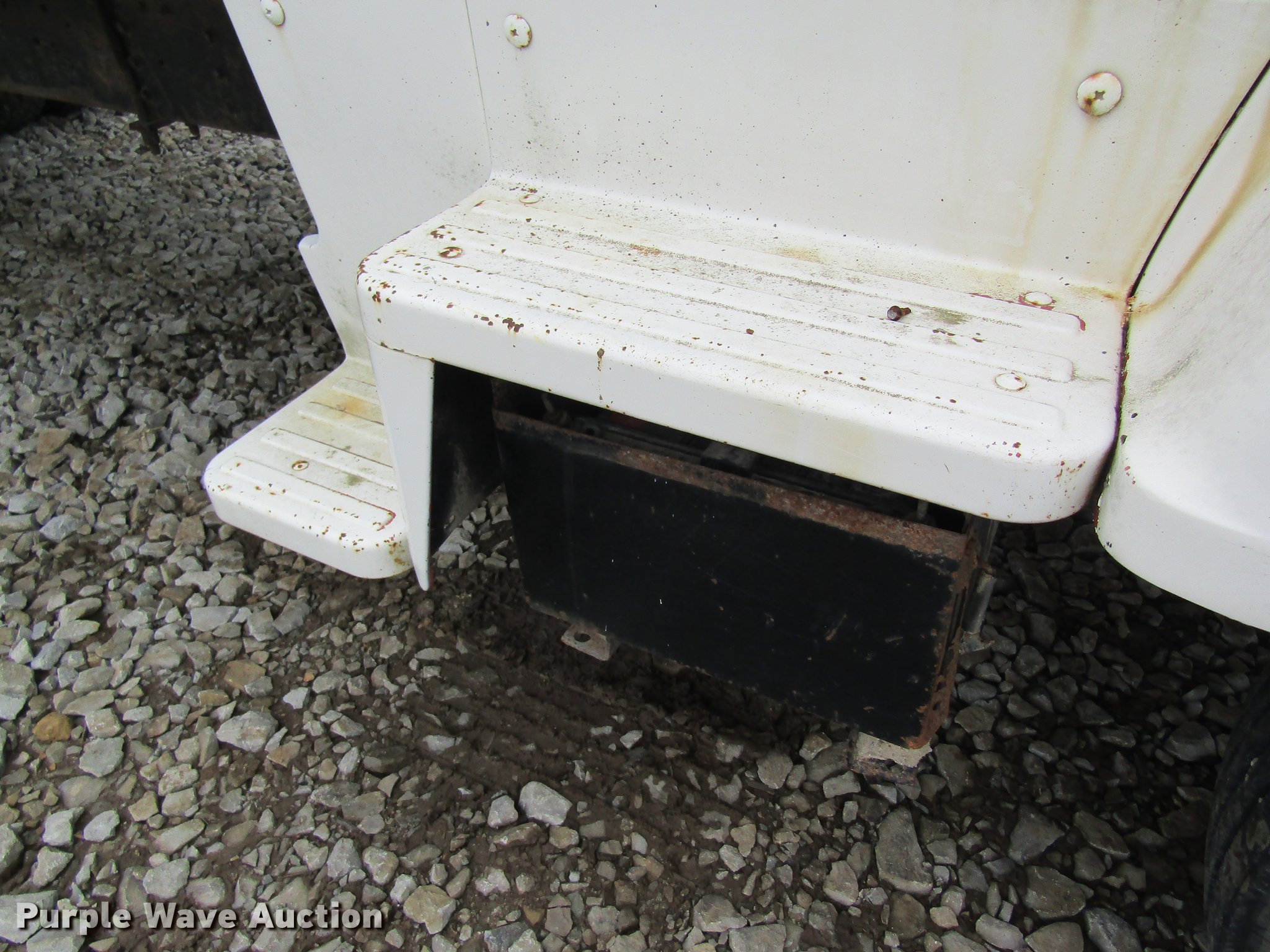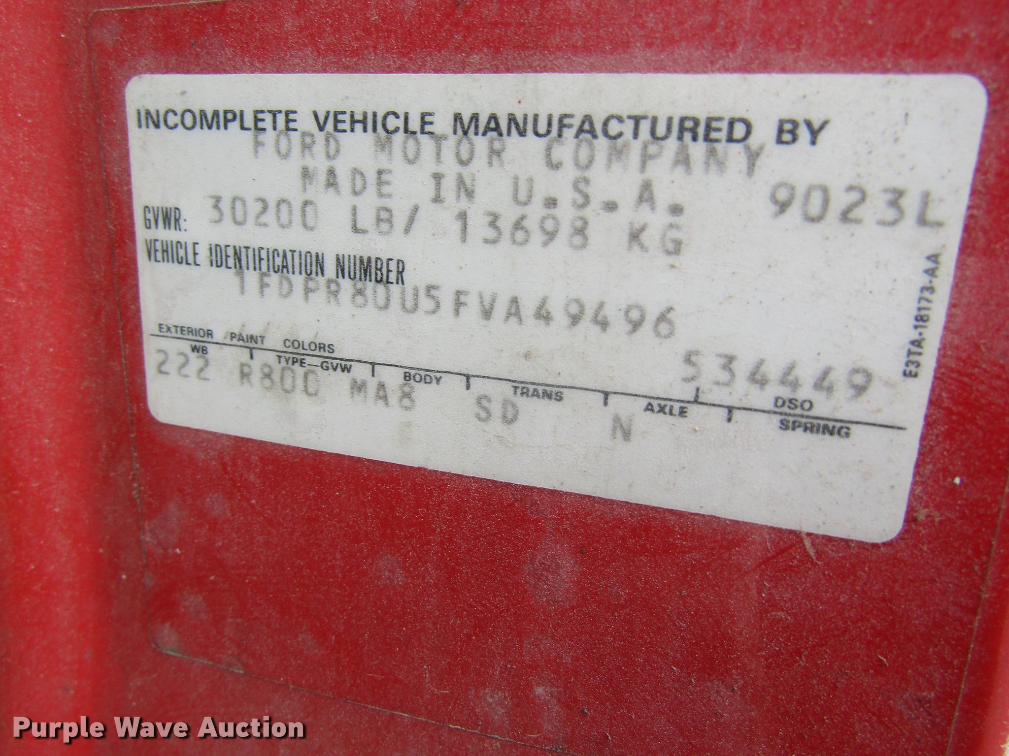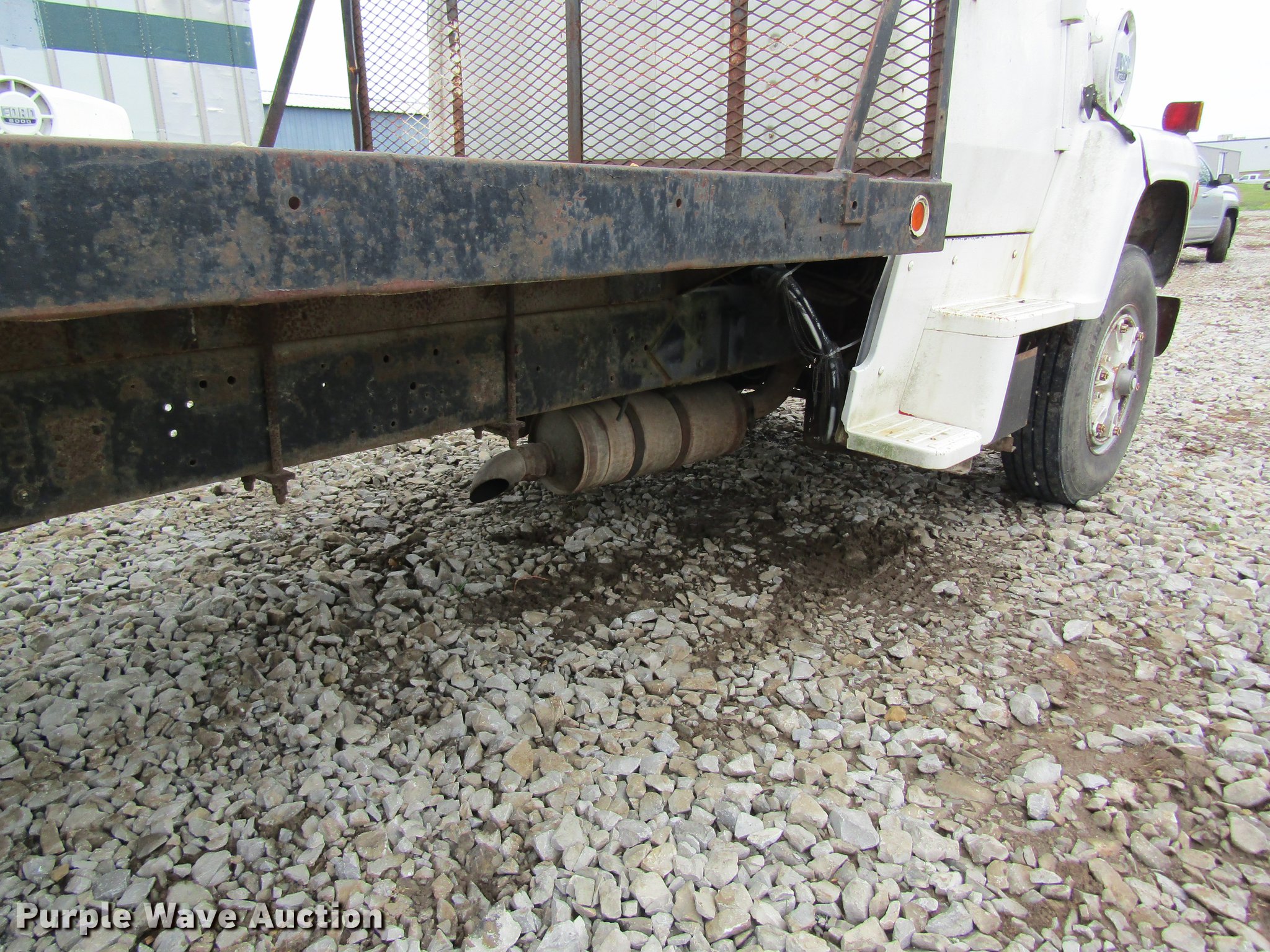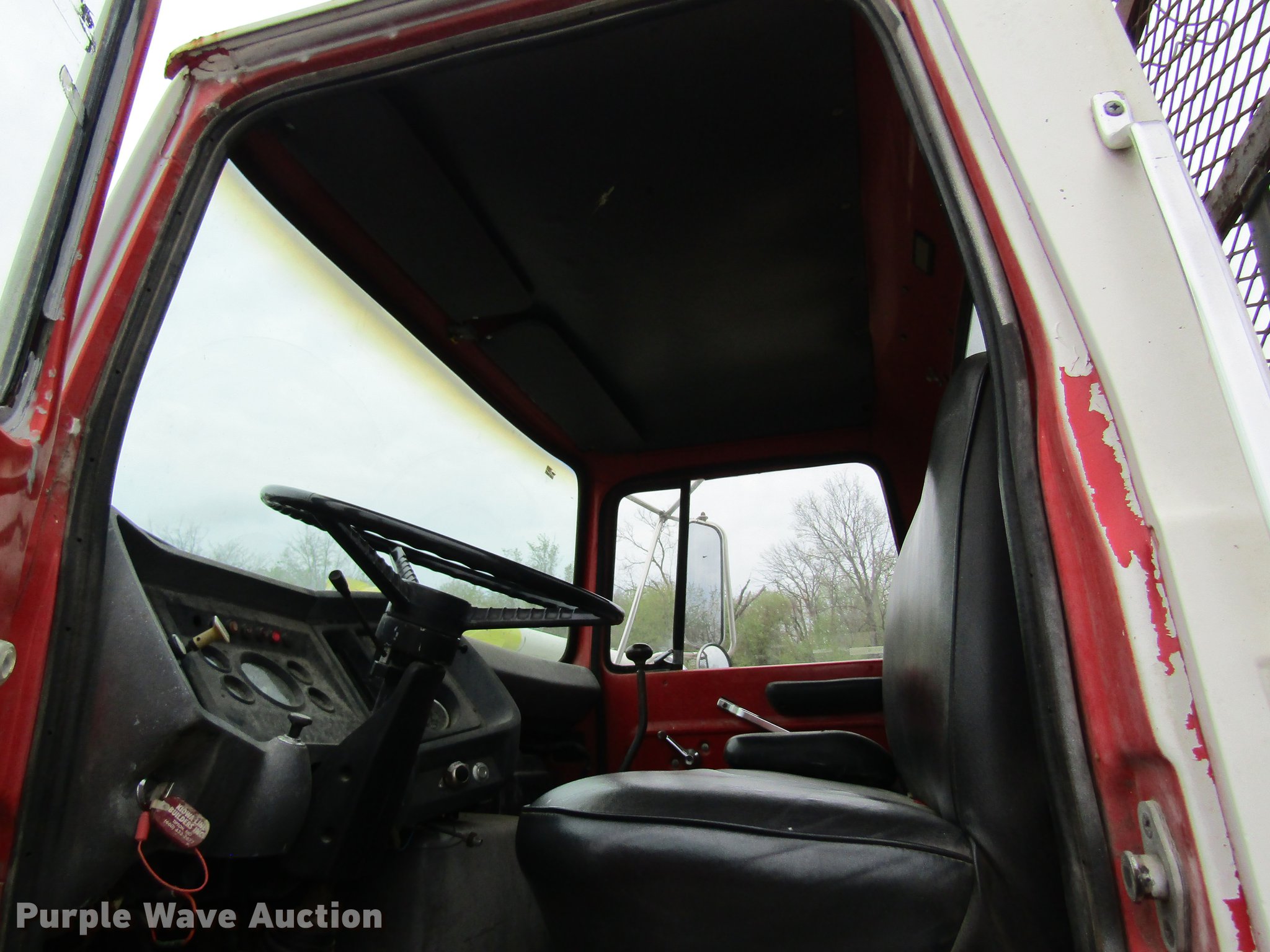 1985 Ford 8000 flatbed truck. 187,270 miles on odometer, Caterpillar 3208 10.4L V8 diesel engine, Five speed manual transmission, Heat, Suspension seat, 14'L x 8'W flatbed Steel floor, Single fuel tank, Spring suspension, Hydraulic brakes, 11R22.5 front tires, 295/75R22.5 rear tires, GVWR 30,200 lbs. Missouri title. 1FDPR80U5FVA49496. Kiowa Line Builders. 801 MO-5. Tipton, MO 65081