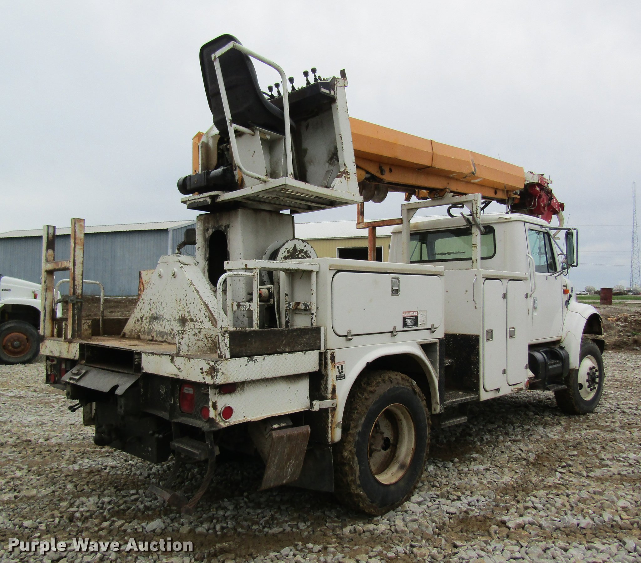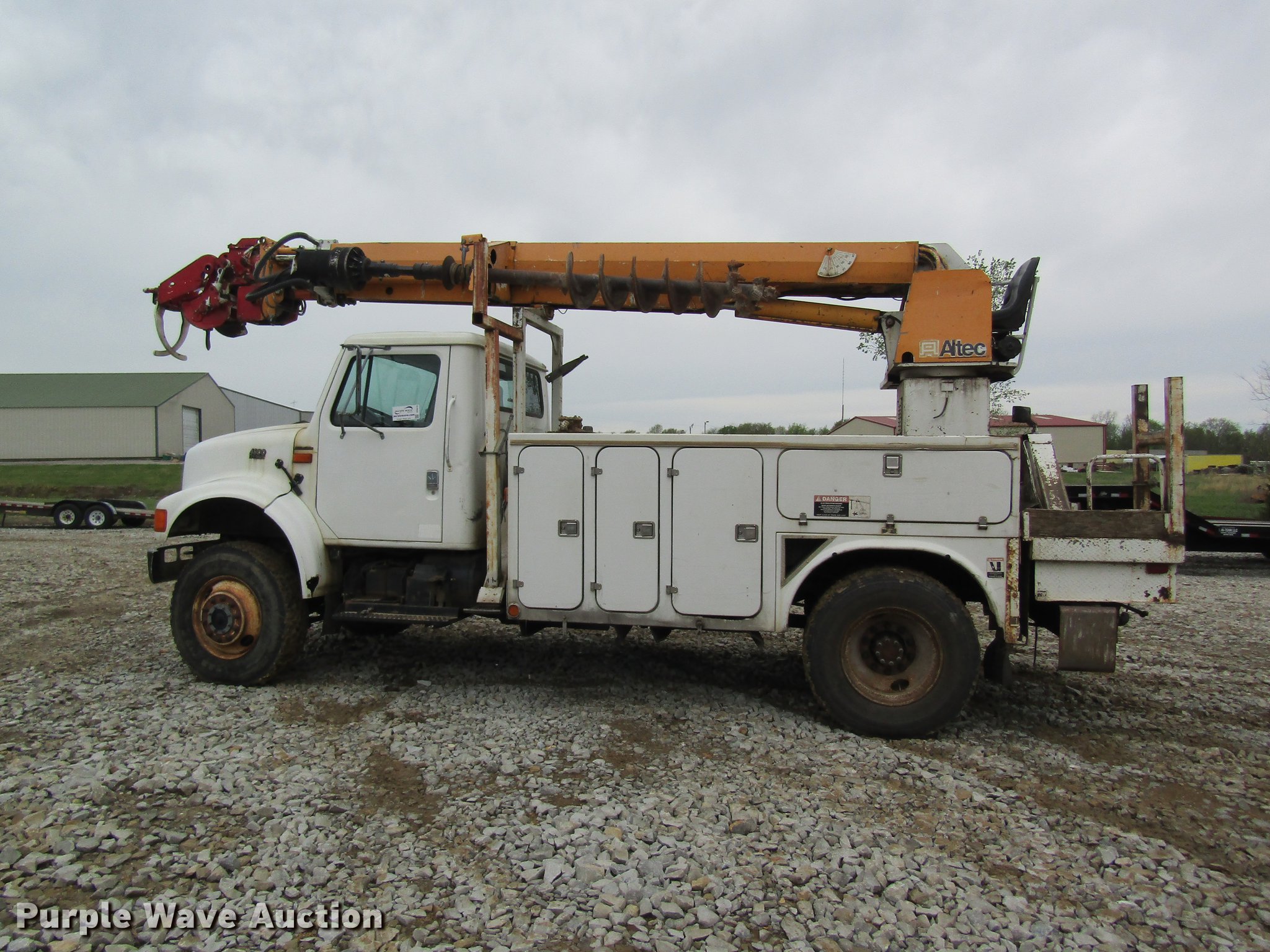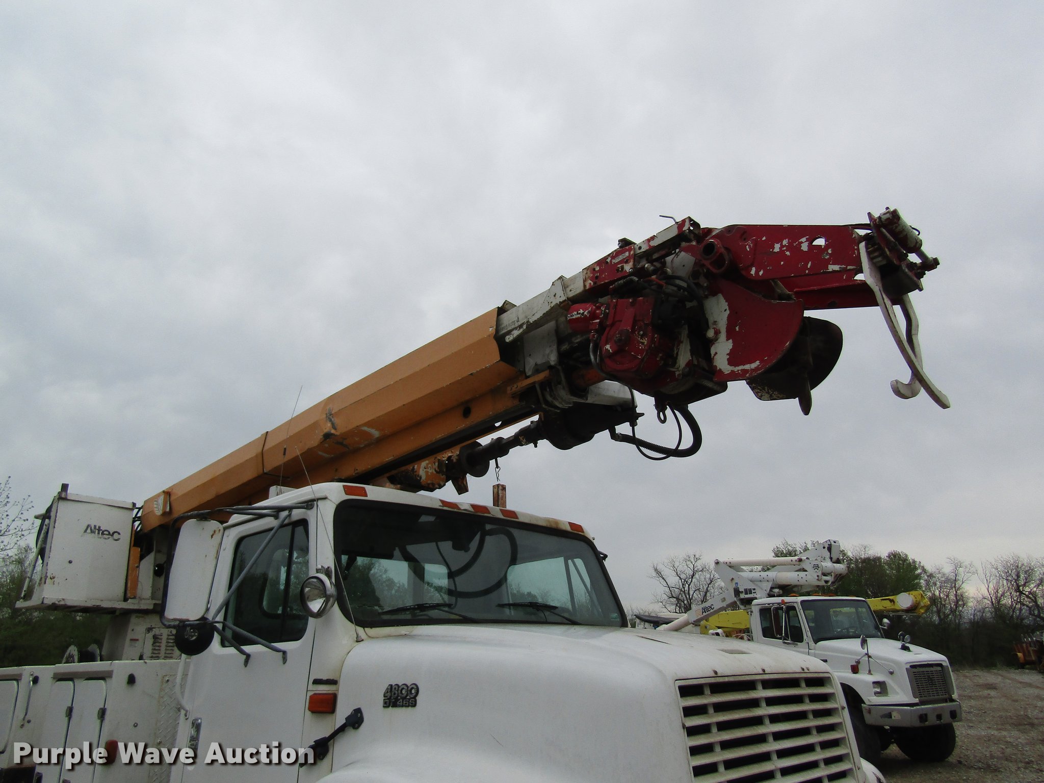 Purple Wave is selling a used Digger Derrick Truck in Missouri. This item is a 1996 International 4800 digger derrick truck with the following: 168,824 miles on odometer, 7,378 hours on meter, International DT466 7.6L L6 turbo diesel engine, Eaton Fuller six speed manual transmission, Four wheel drive, Single axle, AC and heat, AM/FM, Suspension seat, PTO, 10'L utility bed, Shelving, 3'L platform, Altec D842-BR digger derrick, 21,450 lbs max lift capacity, 42' max lift height, Platform boom controls, Pole guide, Telescopic boom, Serial 1289-T0890, Single fuel tank, Pintle hitch, Trailer wiring, Spring suspension, Air brakes, 11R22.5 tires, GVWR 33,000 lbs, No auger bit included