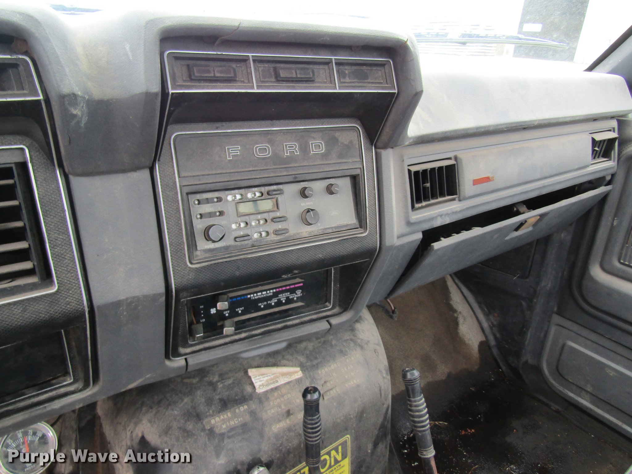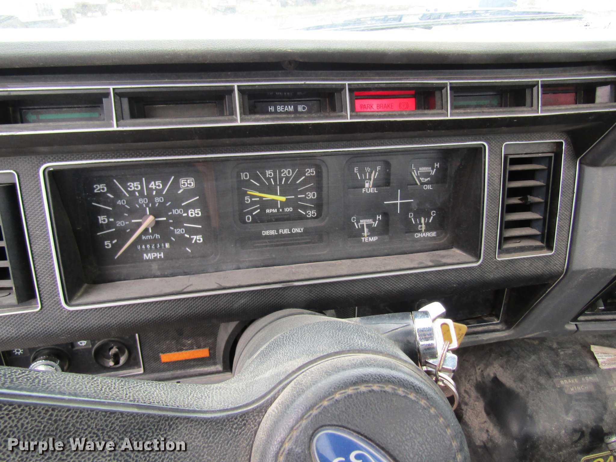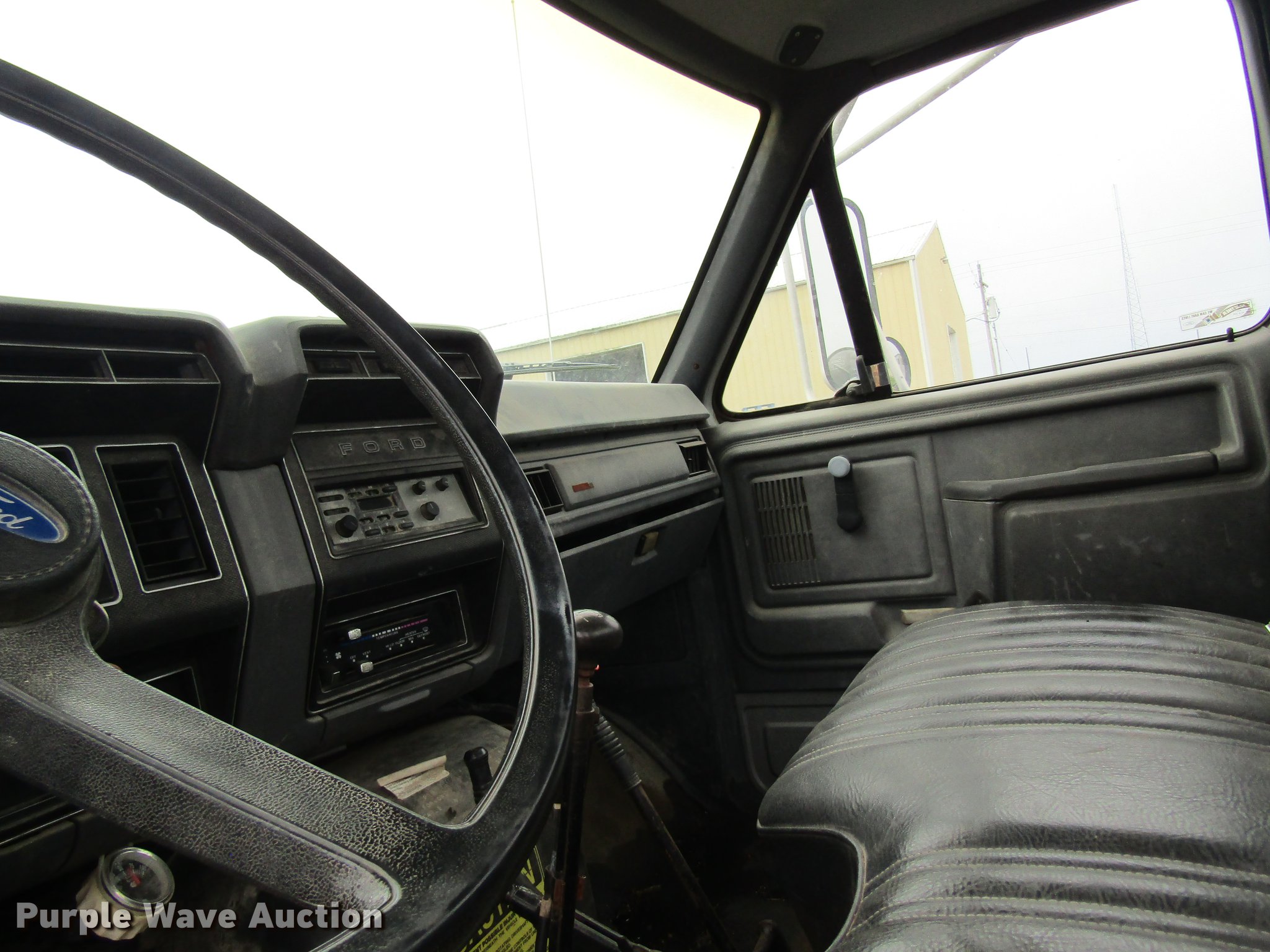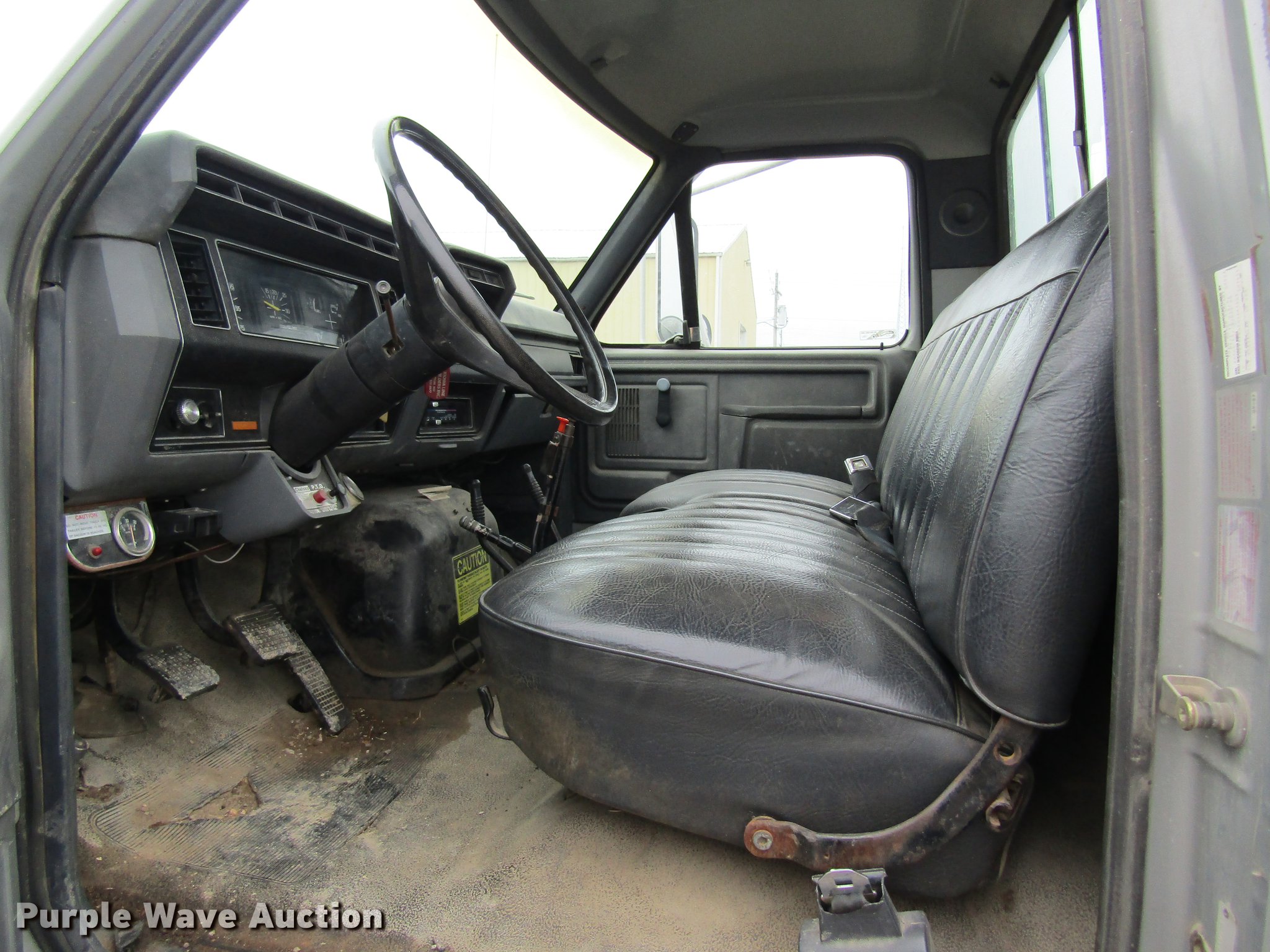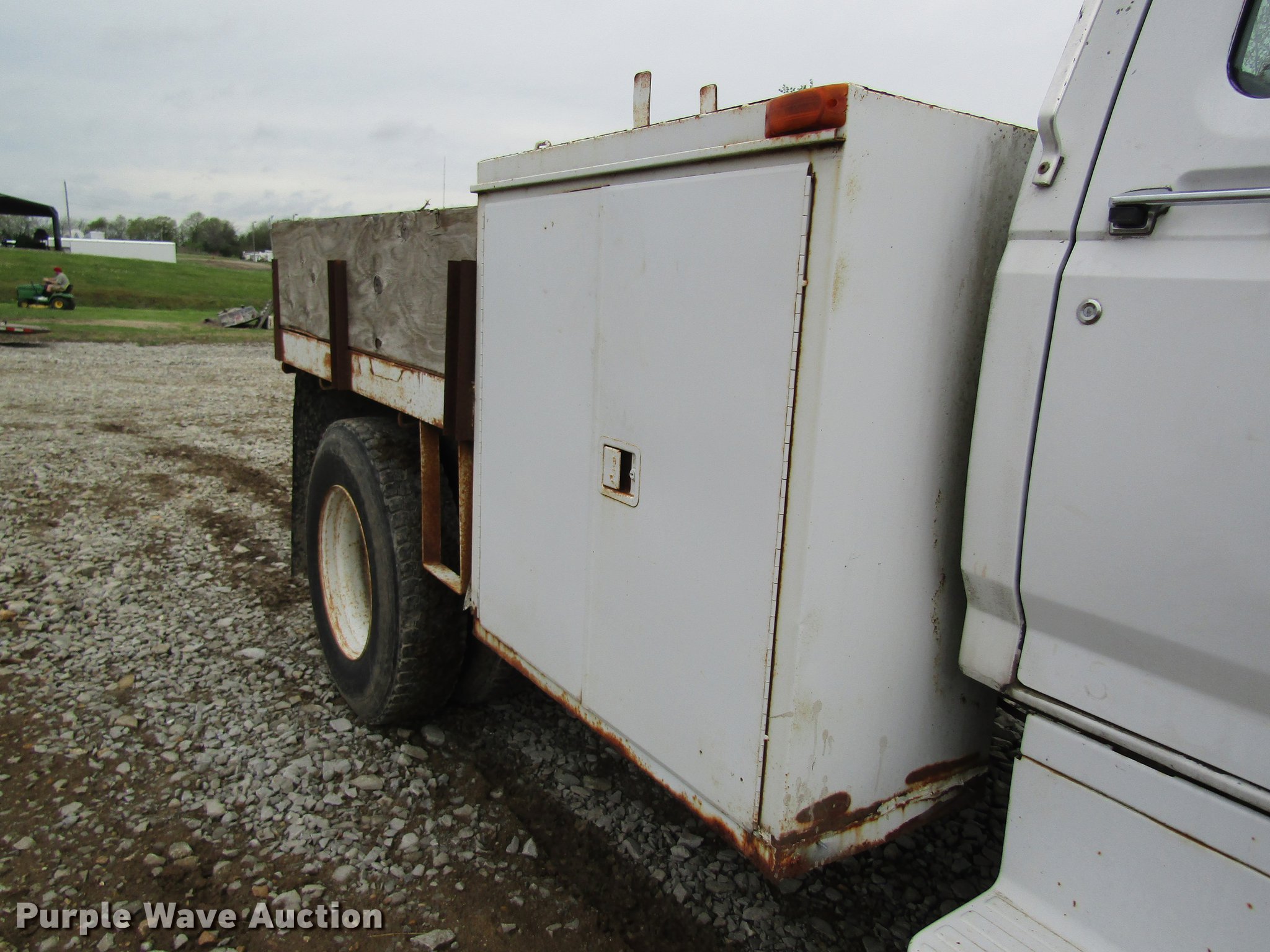 Purple Wave is selling a used Flat Bed Truck in Missouri. This item is a 1987 Ford F700 flatbed truck with the following: 48,231 miles on odometer, 7.8L L6 turbo diesel engine, Five speed manual transmission, Two speed rear end, Heat, AM/FM, Manual locks, Vinyl interior, Flatbed, 10'L x 8'W, 16" side height, Toolbox, Pintle hitch, Trailer wiring, Spring suspension, Hydraulic brakes, 10R22.5 tires