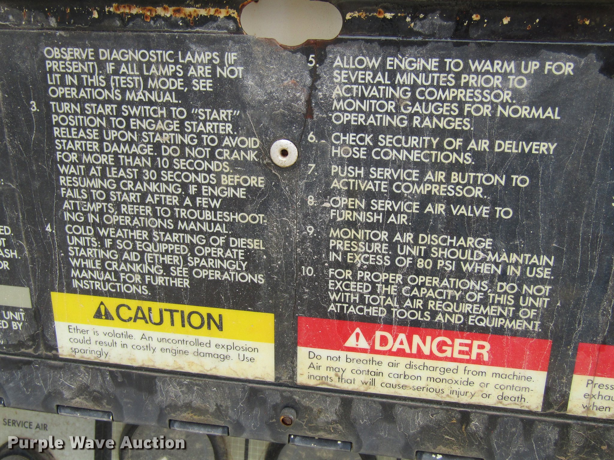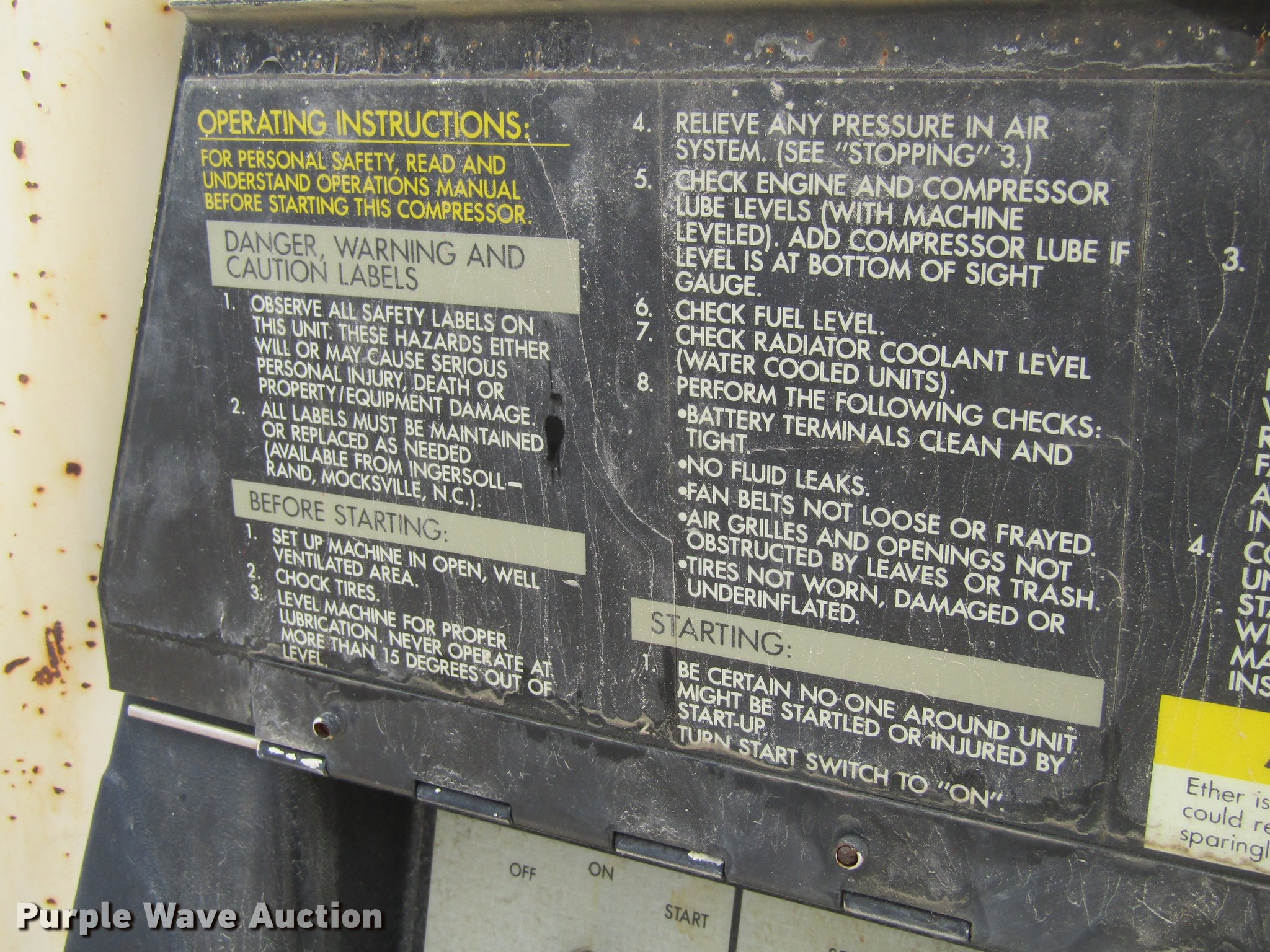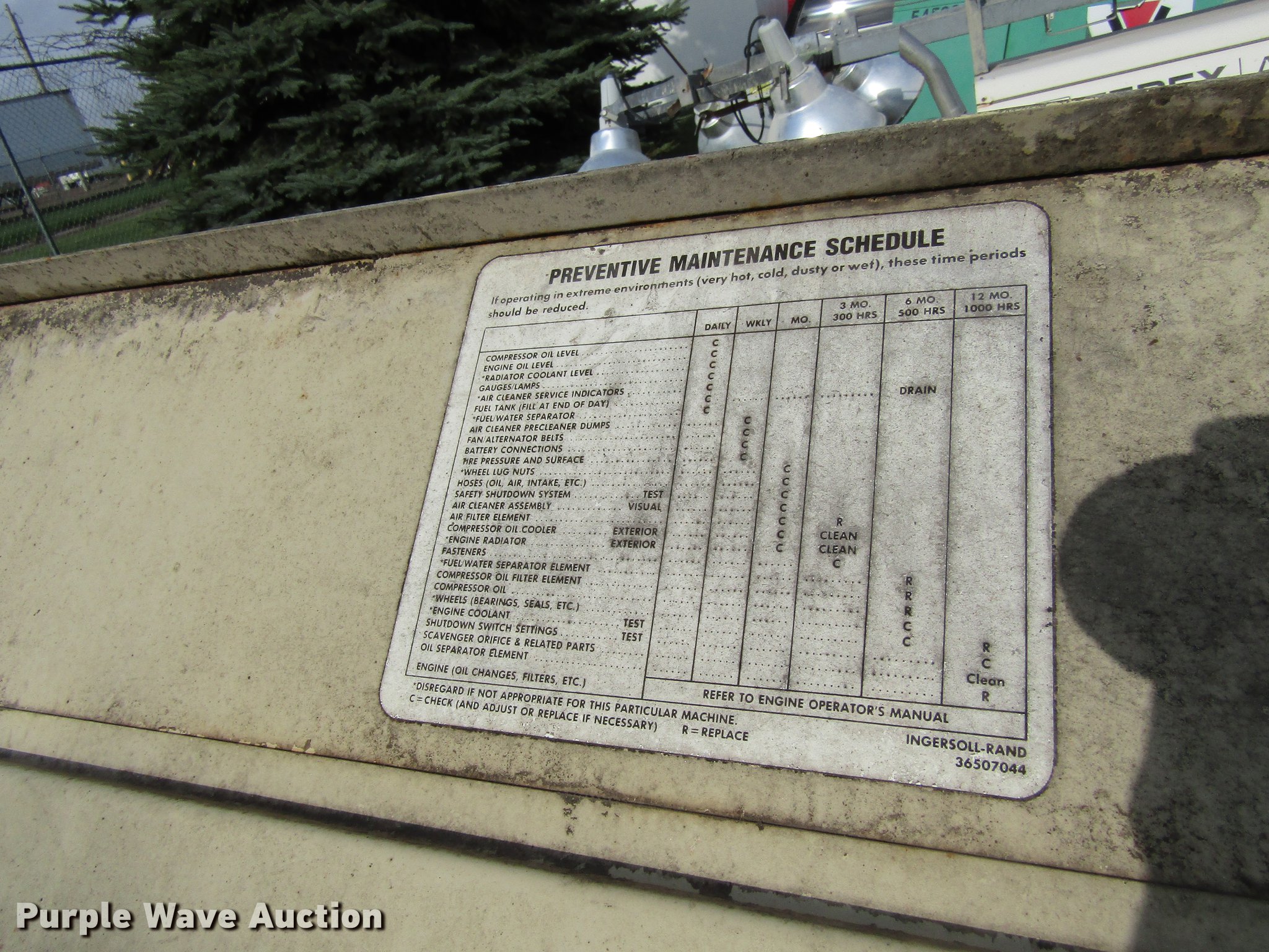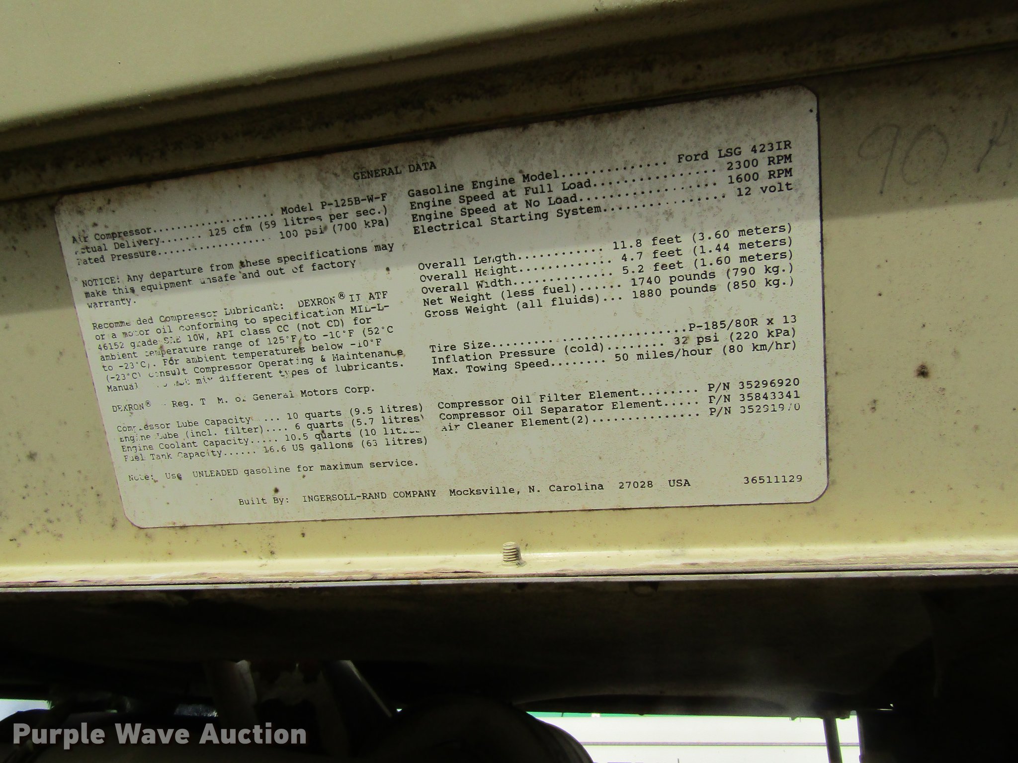Purple Wave is selling a used Air Compressor in Iowa. This item is a (2) air compressors with the following: 1990 Ingersoll Rand P125B-W-F, 273 hours on meter, Ford LSG4231R gas engine, 125 cfm, 100 psi, Ball hitch, P185/80R13 tires, Serial 186572490197, 1990 Ingersoll Rand P-125B-W-F, 1,456 hours on meter, Ford LSG423IR gas engine, 125 cfm, 100 psi, 175/80R13 tires, Serial 186575U90197, ICN DF3781