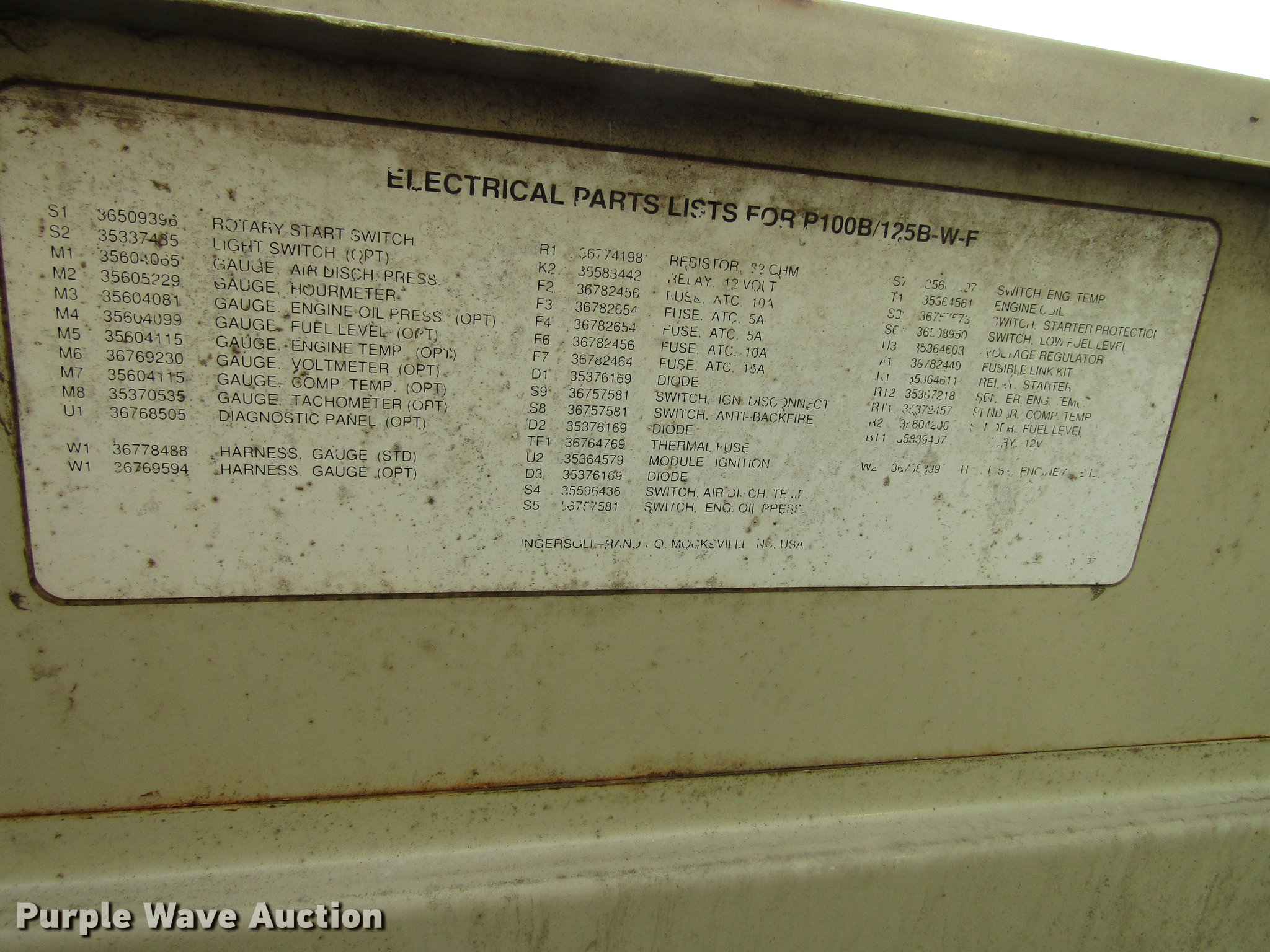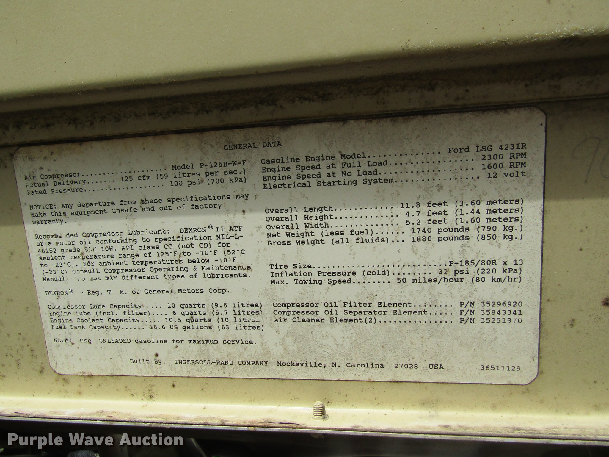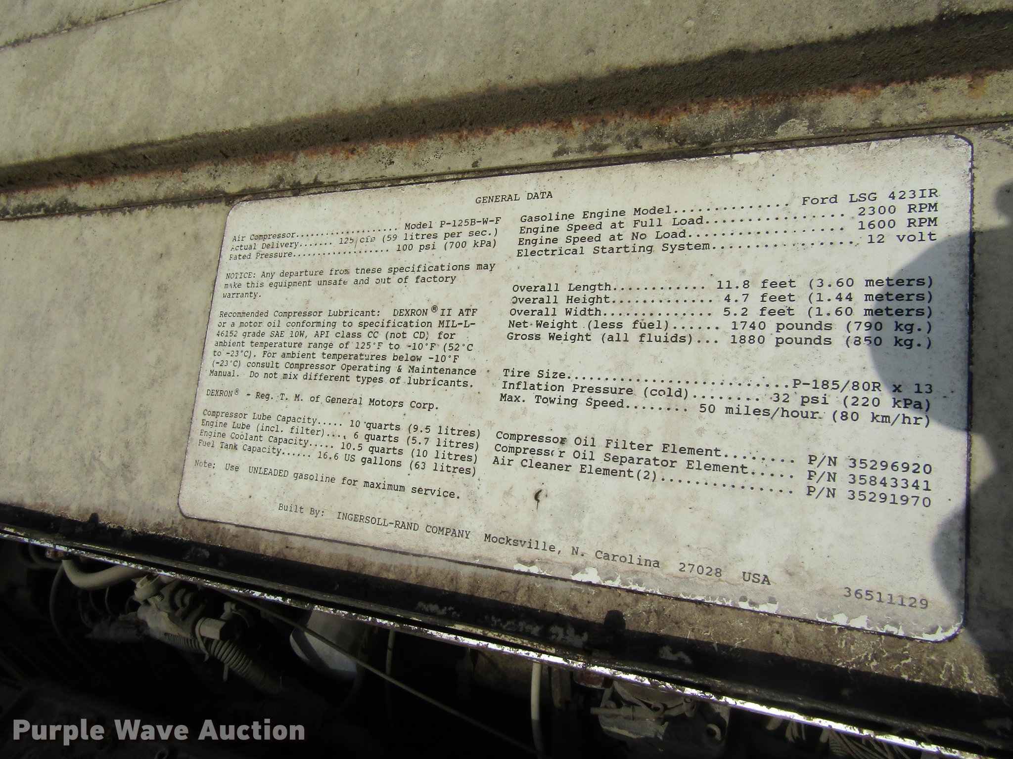 (2) air compressors. 1990 Ingersoll Rand P125B-W-F 273 hours on meter, Ford LSG4231R gas engine, 125 cfm, 100 psi, Ball hitch, P185/80R13 tires, Serial 186572490197, 1990 Ingersoll Rand P-125B-W-F 1,456 hours on meter, Ford LSG423IR gas engine, 125 cfm, 100 psi, 175/80R13 tires, Serial 186575U90197, ICN DF3781. Transfer of ownership documentation will be a bill of sale. Croell, Inc.. 300 50th Ave SW. Cedar Rapids, IA 52404