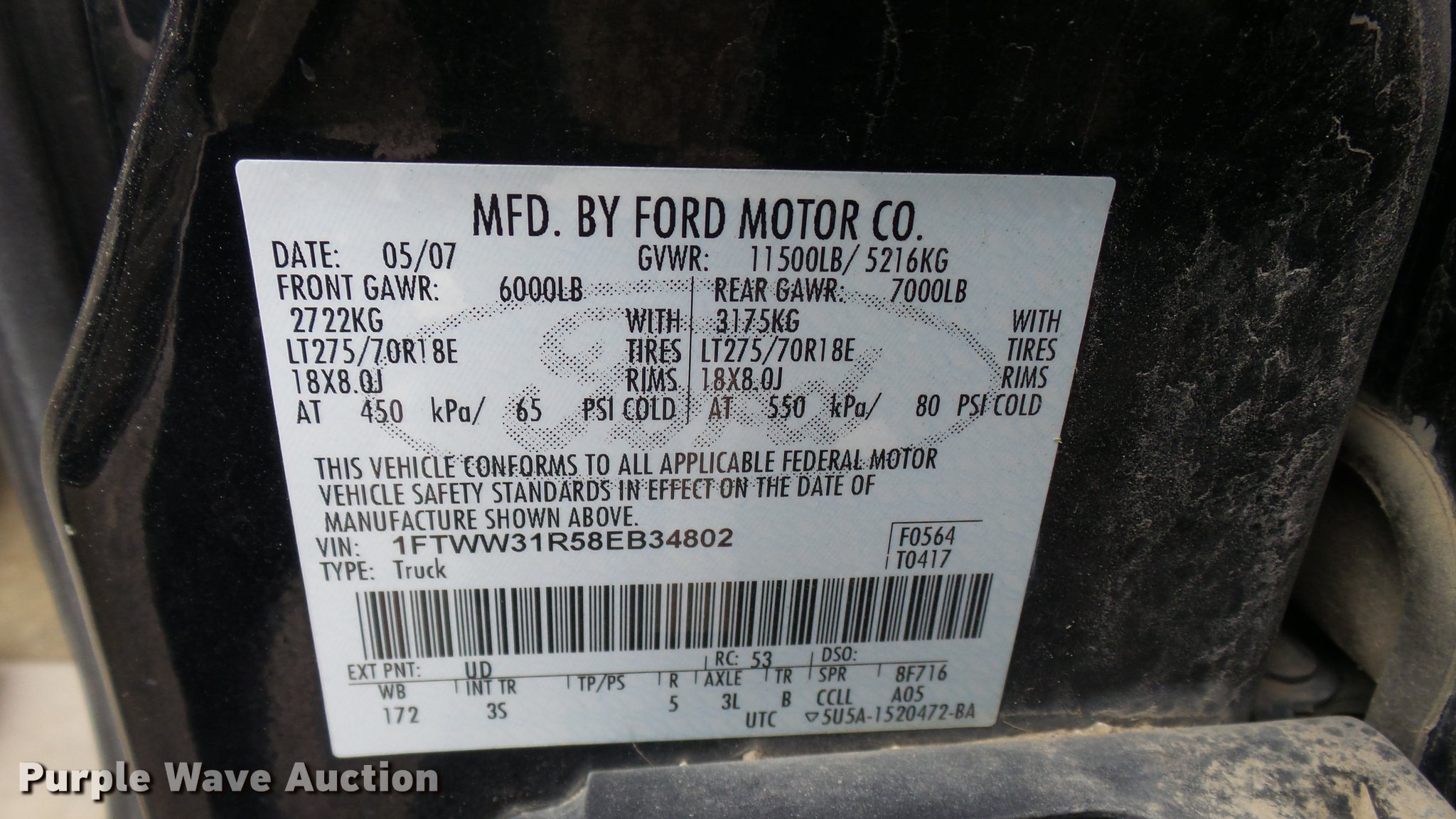 Purple Wave is selling a used 3/4 or 1 Ton Pickup or Van in Missouri. This item is a 2008 Ford F350 Super Duty Crew Cab pickup truck with the following: 257,371 miles on odometer, 6.4L V8 OHV 32V turbo diesel engine, Automatic transmission, Four wheel drive, AC and heat, Tilt, Cruise, AM/FM/CD, Power windows, locks, mirrors, and seat, Cloth interior, Trailer brake controller, Front tow hook, Spray-in bed liner, Receiver hitch, Trailer wiring, Trail Grappler MT 295/70R18 tires