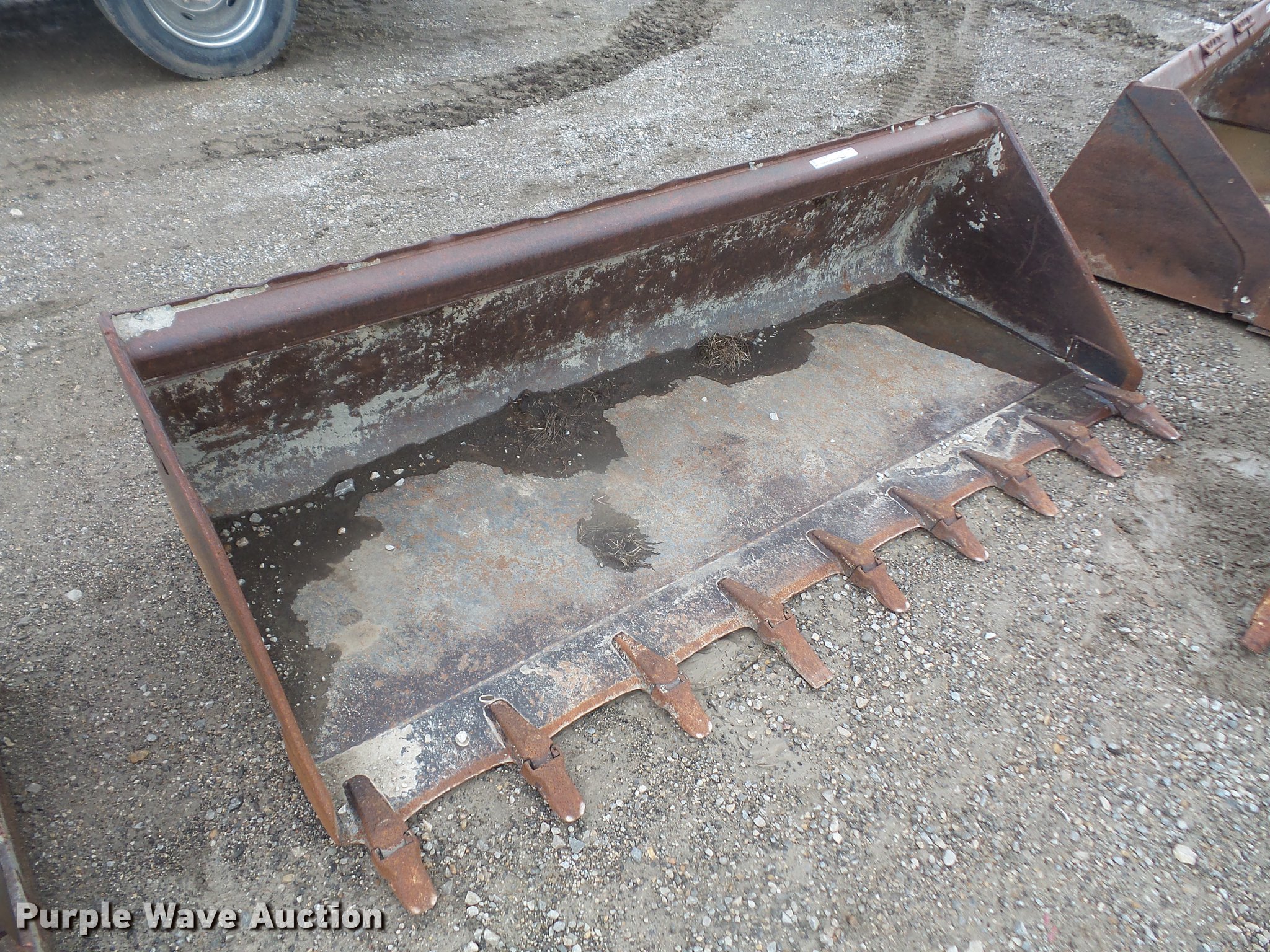 Purple Wave is selling a used Skid Steer Attach. in Kansas. This item is a Dymax skid steer bucket with the following: 86"W, (9) teeth