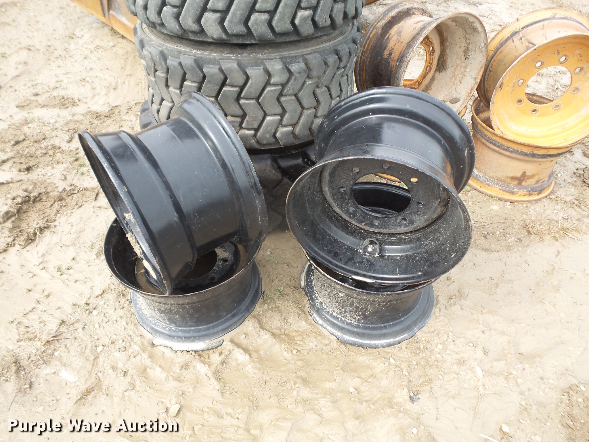 Purple Wave is selling a used Industrial Tires or Tracks in Kansas. This item is a Tires and wheels with the following: (3) 12-16.5 tires, 14 x 17.5 tire, (8) 16.5" wheels, 20 x 26" wheel, DW20AX26 ten lug wheel