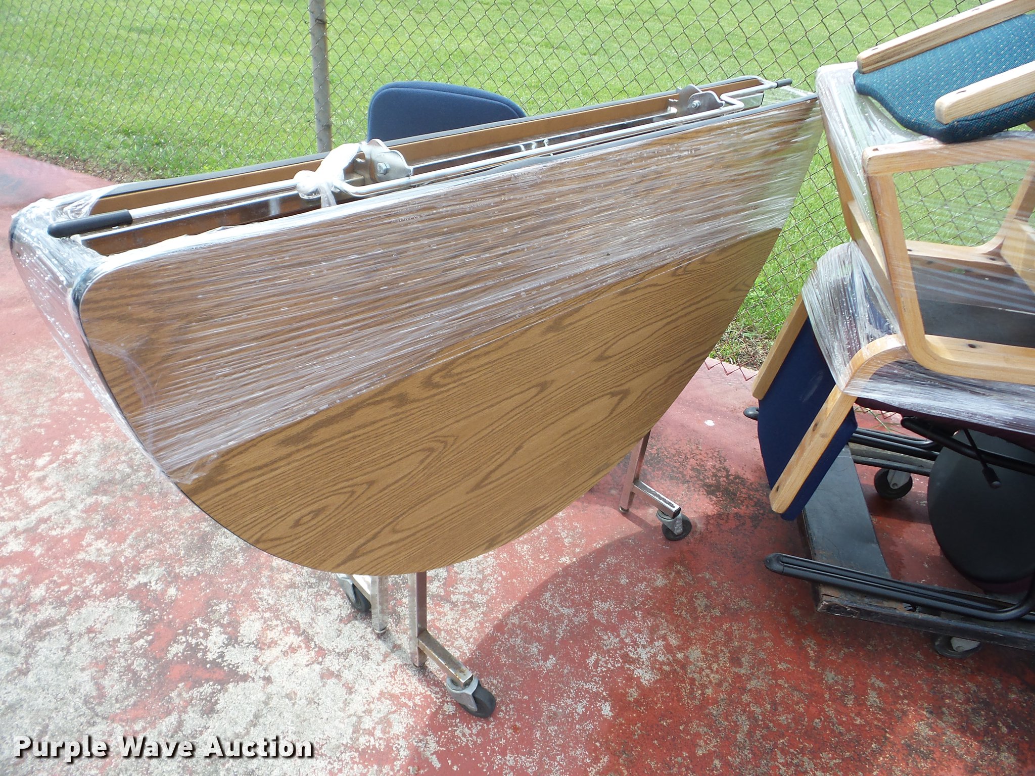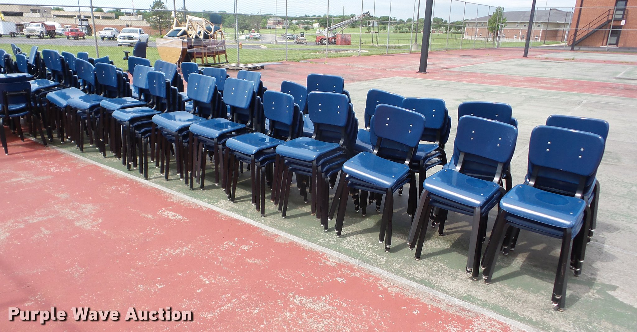 Purple Wave is selling a used Furniture in Kansas. This item is a Furniture with the following: Approx. 260 slope back chairs, Approx. 55 straight back chairs, Approx. 80 padded chairs, Approx. 114 lunchroom chairs, Approx. 10 wood chairs, Round table, Approx. 43 rectangular tables, Some chairs may have water damage