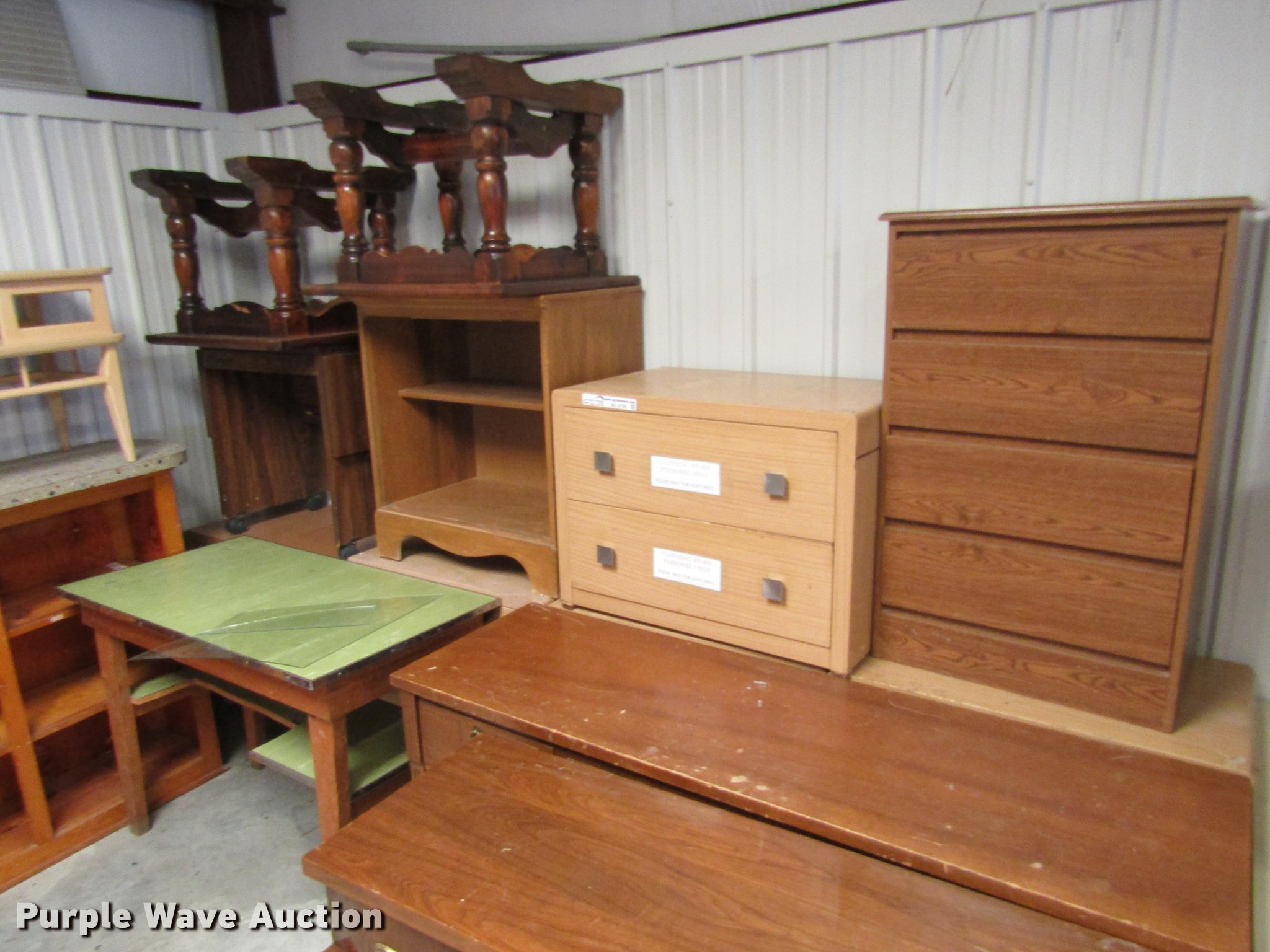 Purple Wave is selling a used Furniture in Kansas. This item is a Furniture with the following: Dressers, Night stands, End tables, Book shelves, 12'L x 3'W fabric table