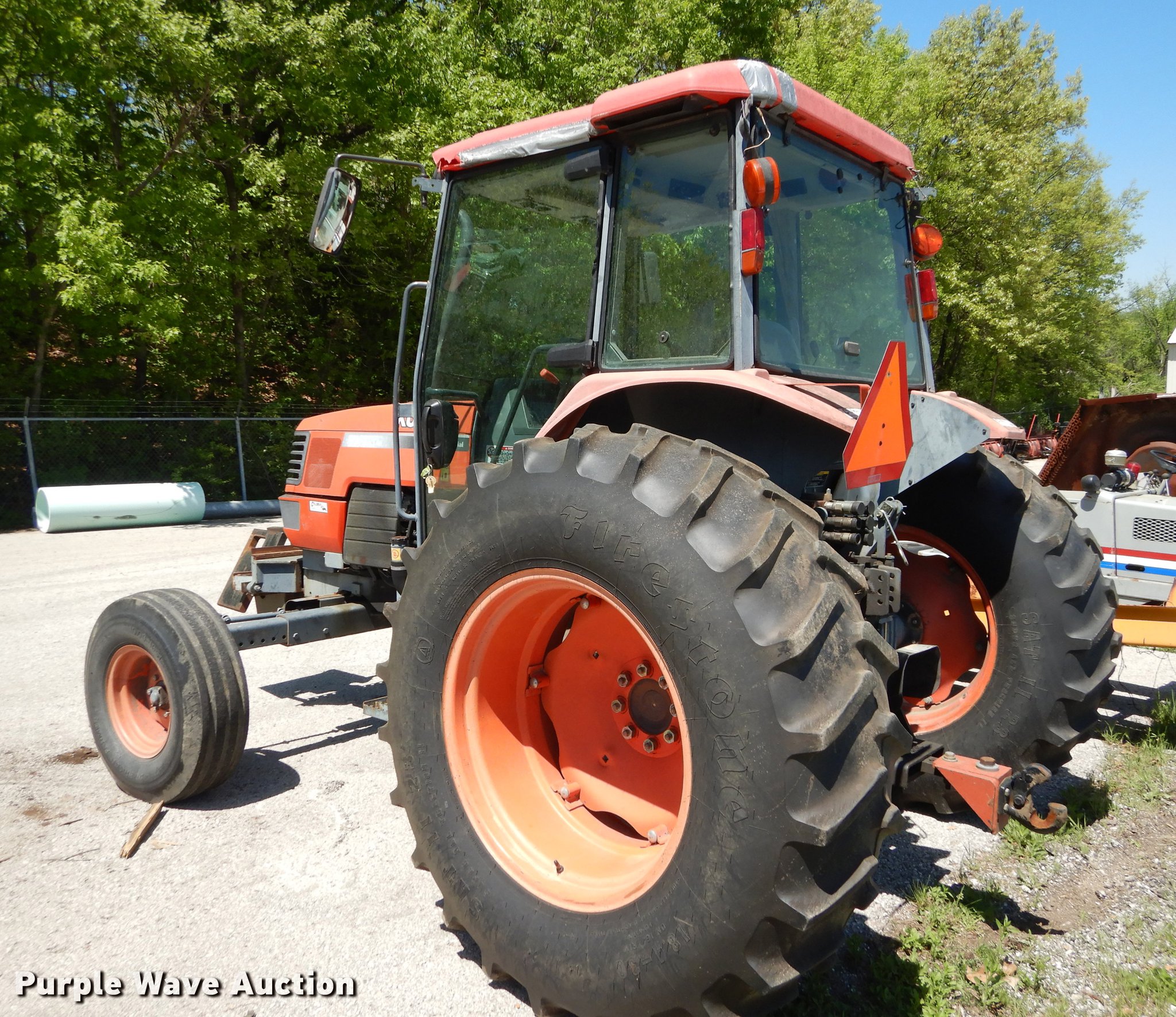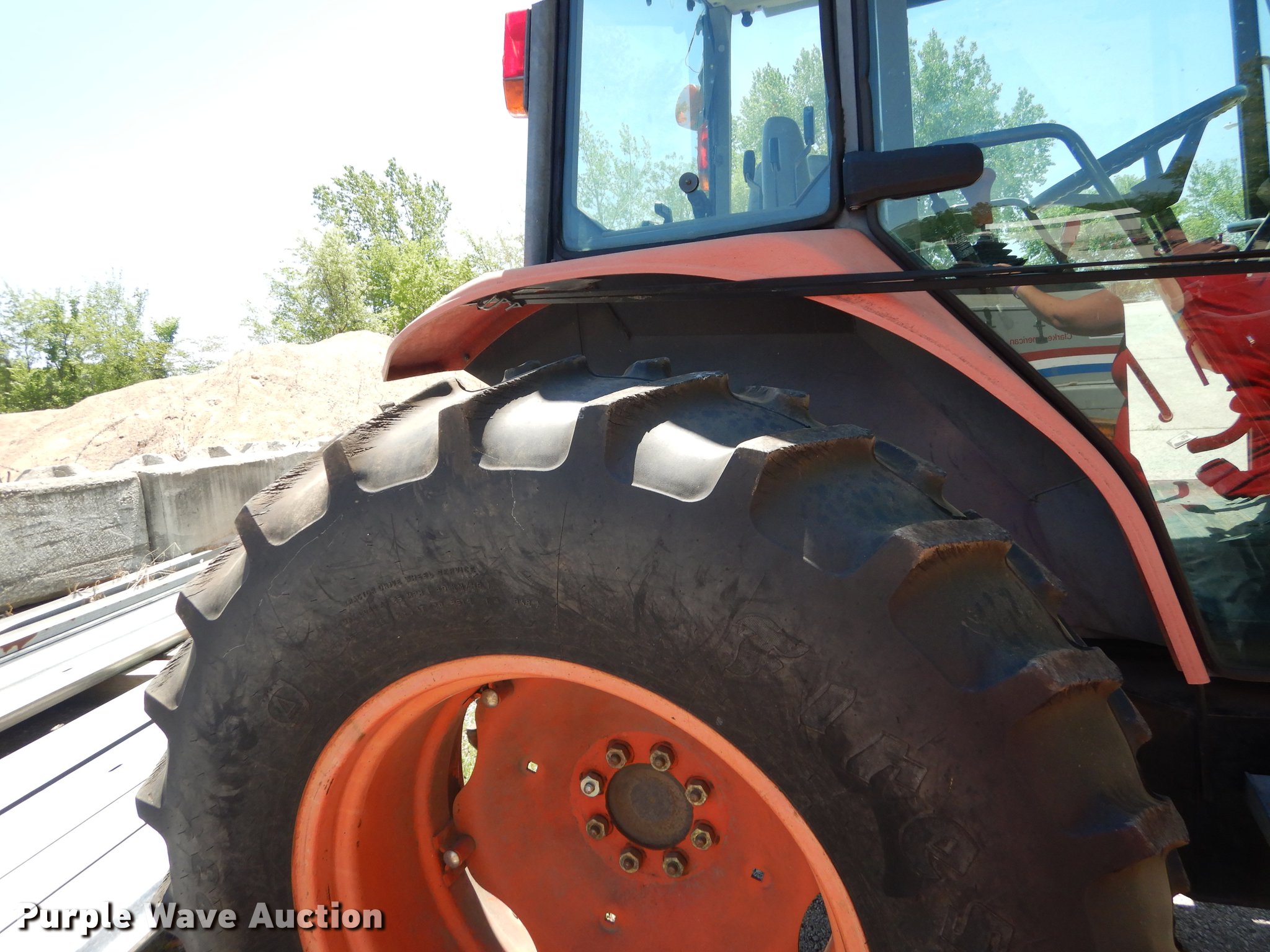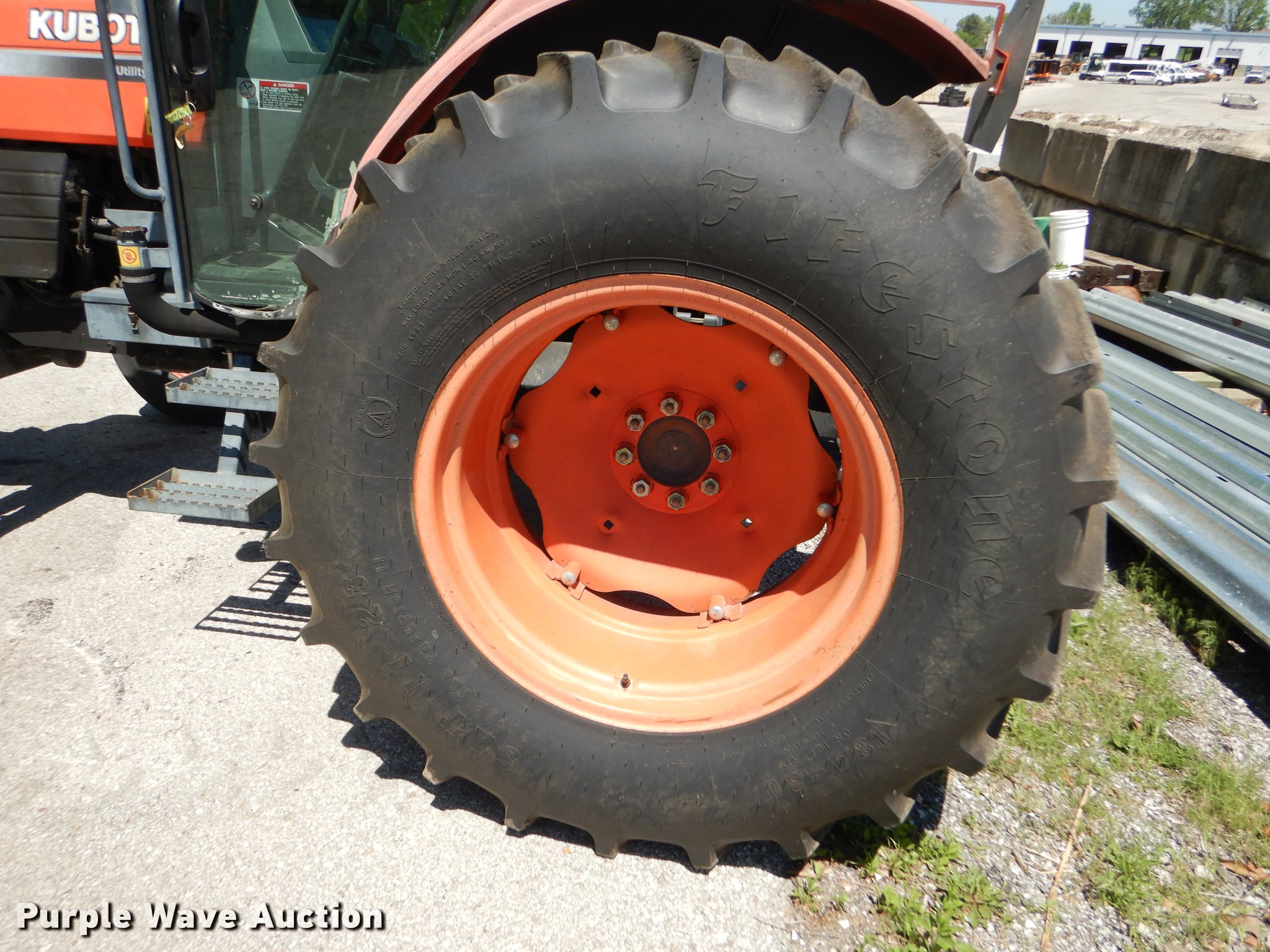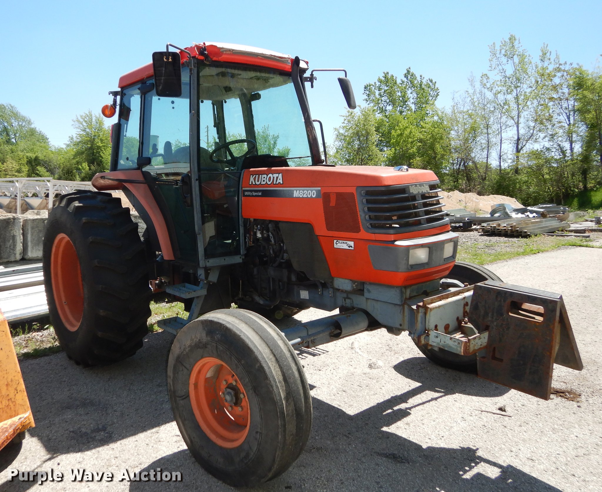 Purple Wave is selling a used Tractor in Kansas. This item is a 1999 Kubota M8200 Utility Special tractor with the following: 5,384 hours on meter, Kubota 3.3L four cylinder diesel engine, 85 HP, 8F-1R gears, Heat, Headlights, Flashers, Three point, 540 PTO, (3) rear hydraulic remote sets, (4) suitcase weights, 18.4-30 front tires, 10.00-16 rear tires, Roof damage, Dead battery, Serial M820-10509, Unit# 215