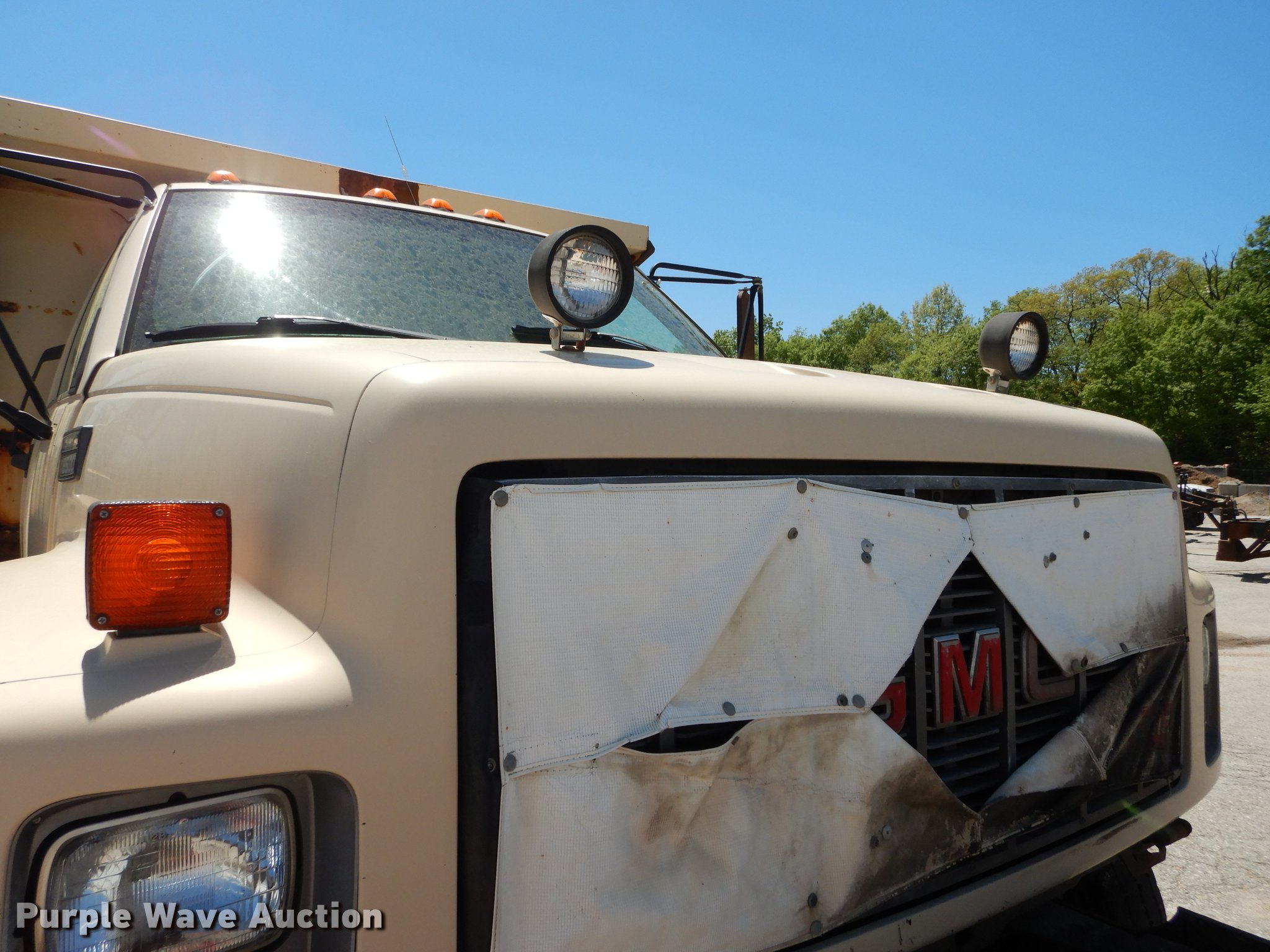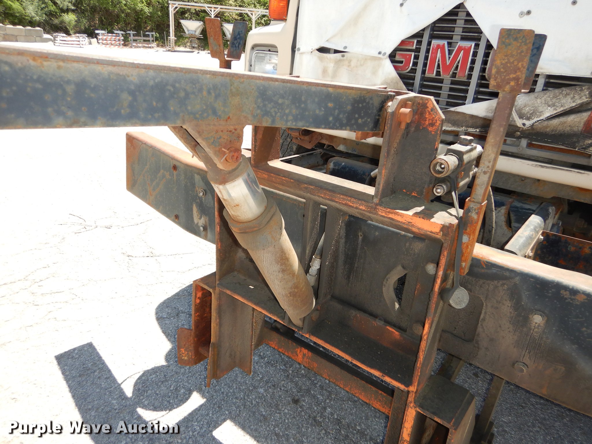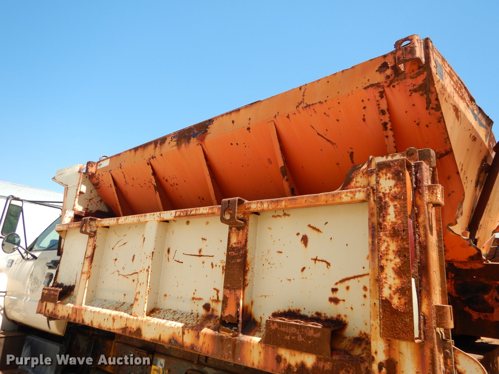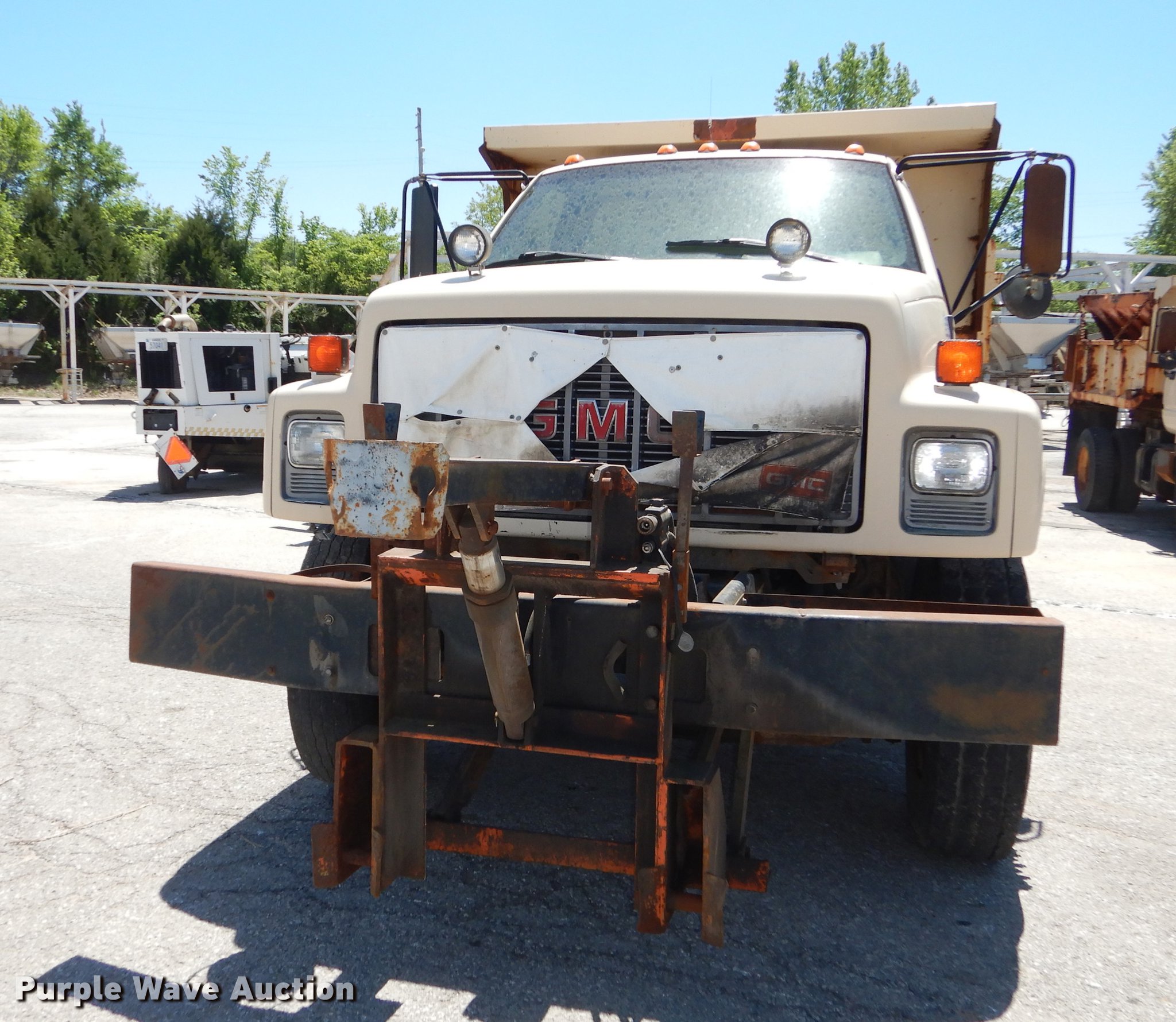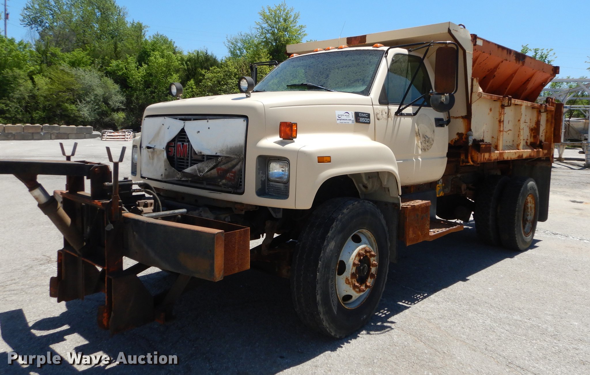 Purple Wave is selling a used Construction Dump Truck in Kansas. This item is a 1997 GMC C8500 dump truck with the following: 84,468 miles on odometer, Caterpillar 3116 6.6L L6 turbo diesel engine, 230 HP, Six speed manual transmission, Single axle, Heat, Front mounted PTO, Knapheide steel dump bed, 10'L x 95"W, 25" side height, Single ram hoist, Manual operated end gate, Snow plow mount, Swenson 10' spreader, Single fuel tank, Pintle hitch, Spring suspension, Air brakes, 11R22.5 tires, GVWR 35,050 lbs, FAWR 12,350 lbs, RAWR 22,700 lbs