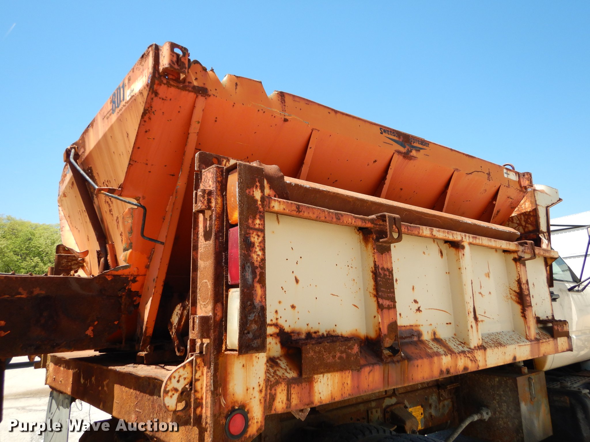 1997 GMC C8500 dump truck. 84,468 miles on odometer, Caterpillar 3116 6.6L L6 turbo diesel engine 230 HP, Six speed manual transmission, Single axle, Heat, Front mounted PTO, Knapheide steel dump bed 10'L x 95"W, 25" side height, Single ram hoist, Manual operated end gate, Snow plow mount, Swenson 10' spreader, Single fuel tank, Pintle hitch, Spring suspension, Air brakes, 11R22.5 tires, GVWR 35,050 lbs, FAWR 12,350 lbs, RAWR 22,700 lbs. Hydraulic leak Unit# 804. Kansas title. 1GDP7H1JXVJ501300. Unified Government of Wyandotte County. 5033 State Ave. Kansas City, KS 66102