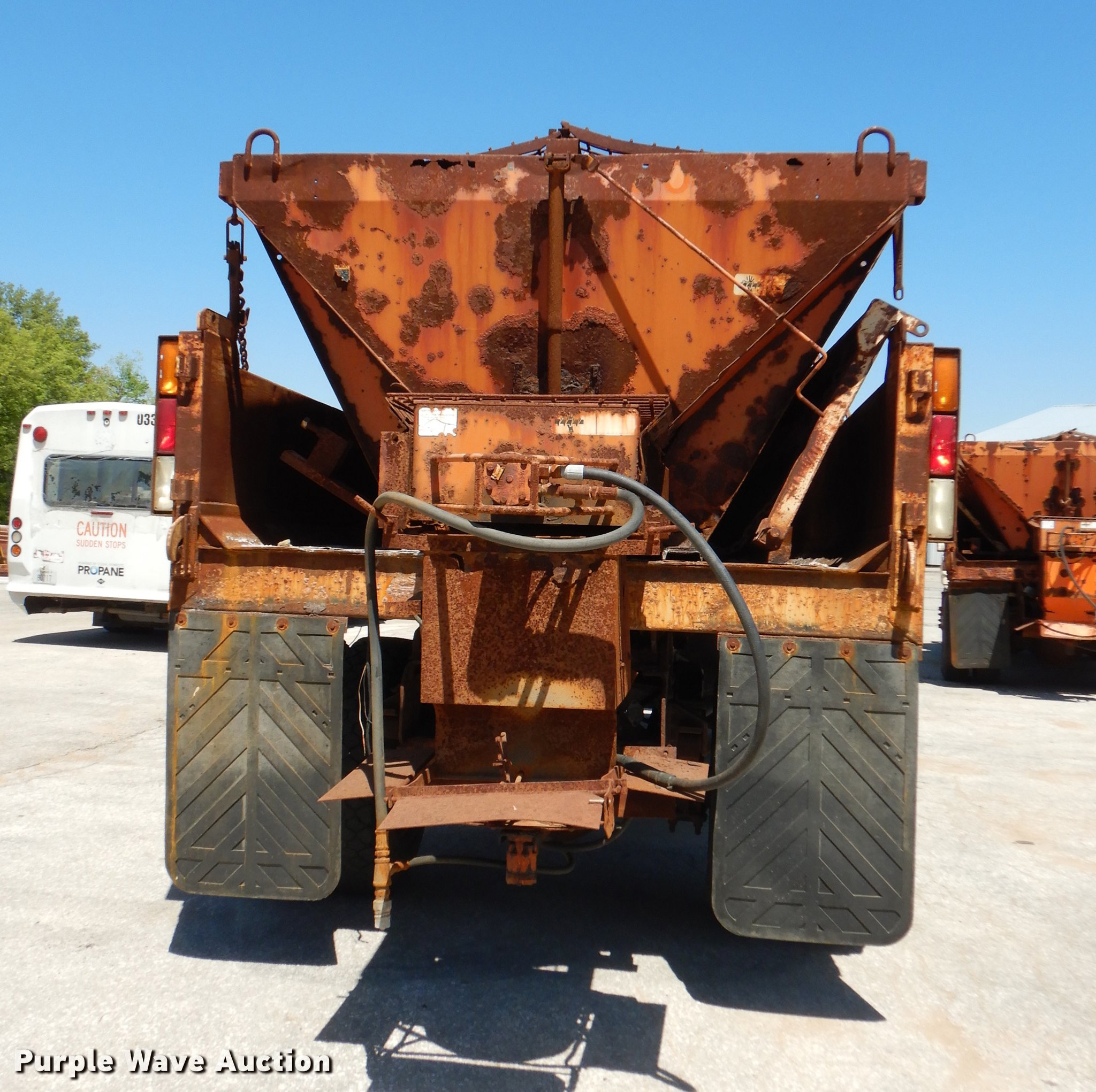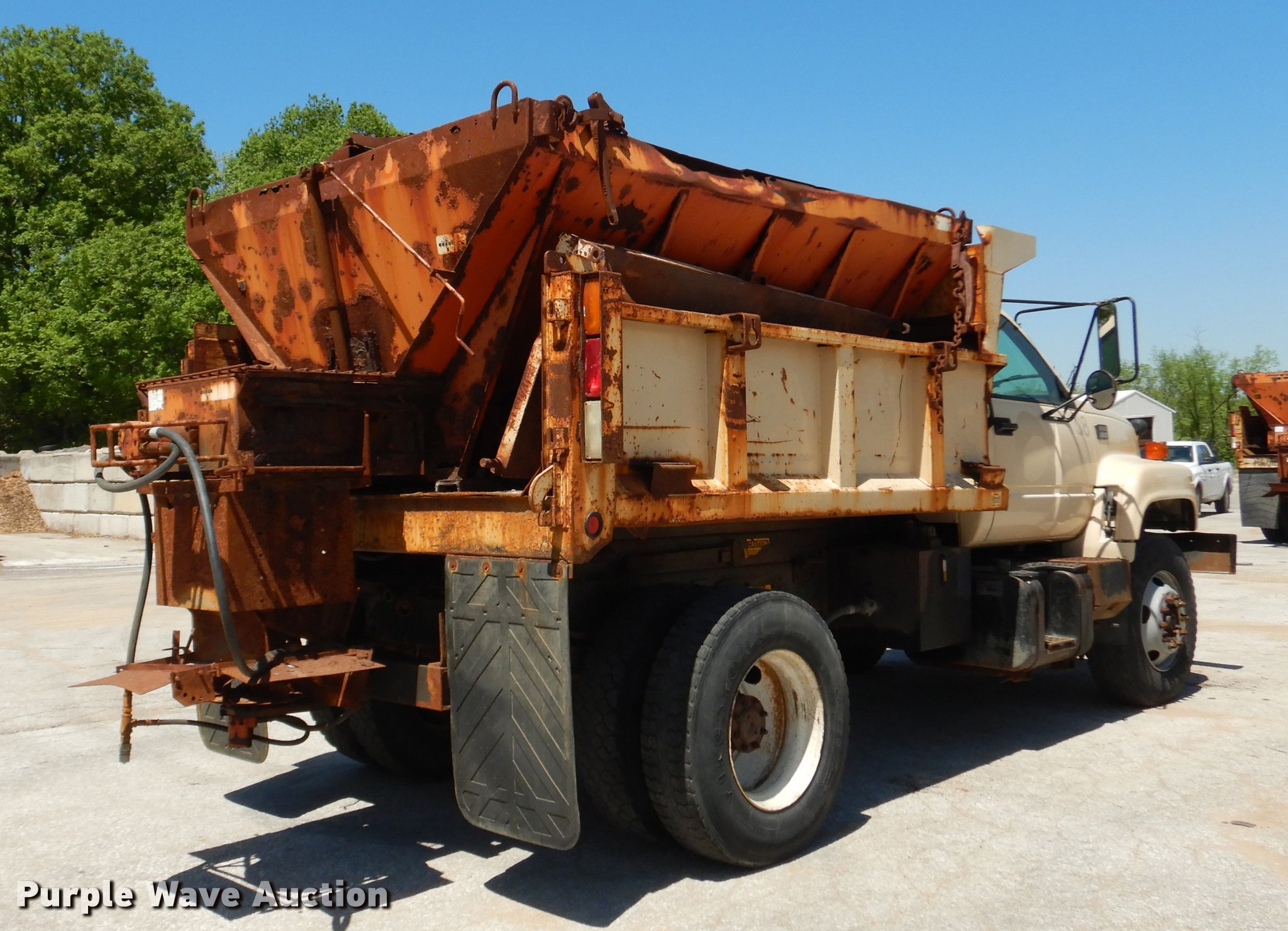 1997 GMC C8500 dump truck. 75,750 miles on odometer, Caterpillar 3116 6.6L L6 turbo diesel engine 230 HP, Six speed manual transmission, Single axle, Heat, Front mounted PTO, Knapheide steel dump bed 10'L x 95"W, 25" side height, Single ram hoist, Manual end gate, Snow plow mount, Swenson 10' spreader, Single fuel tank, Pintle hitch, Spring suspension, Air brakes, 11R22.5 tires, GVWR 35,050 lbs, FAWR 12,350 lbs, RAWR 22,700 lbs, Unit# 508. Kansas title. 1GDP7H1J9VJ501479. Unified Government of Wyandotte County. 5033 State Ave. Kansas City, KS 66102