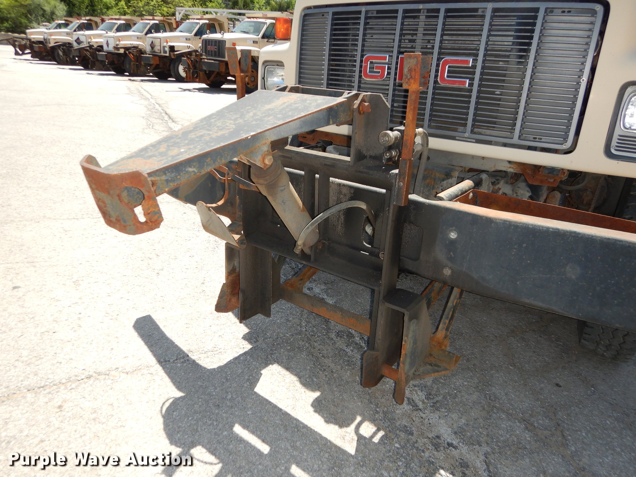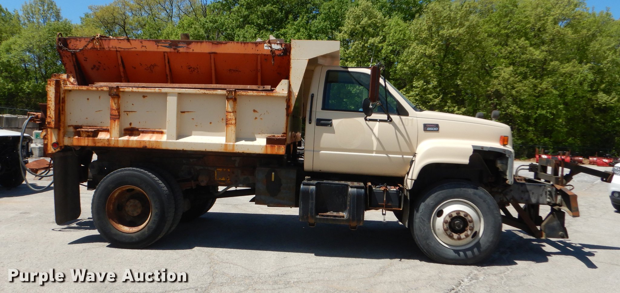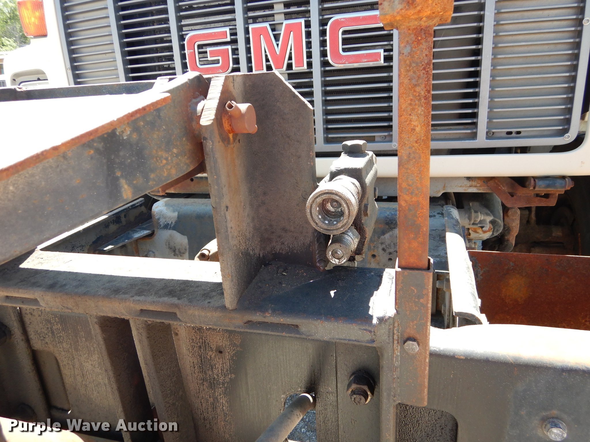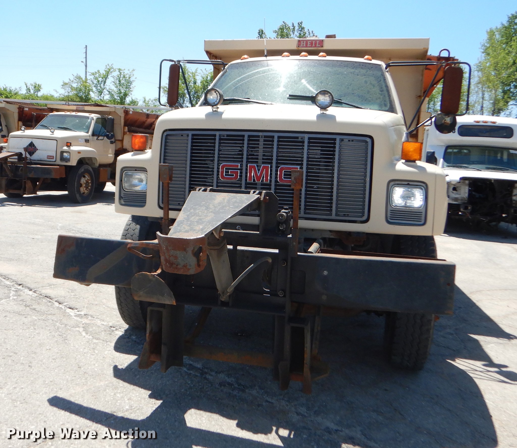 Purple Wave is selling a used Construction Dump Truck in Kansas. This item is a 1997 GMC C8500 dump truck with the following: 70,375 miles on odometer, Caterpillar 3116 6.6L L6 turbo diesel engine, 230 HP, Six speed manual transmission, Single axle, Heat, Front mounted PTO, Knapheide steel dump bed, 10'L x 95"W, 25" side height, Single ram hoist, Manual end gate, Snow plow mount, Swenson 10' spreader, Spinner is stuck, Single fuel tank, Pintle hitch, Spring suspension, Air brakes, 11R22.5 tires, GVWR 35,050 lbs, FAWR 12,350 lbs, RAWR 22,700 lbs, Engine oil leak, Unit# 801