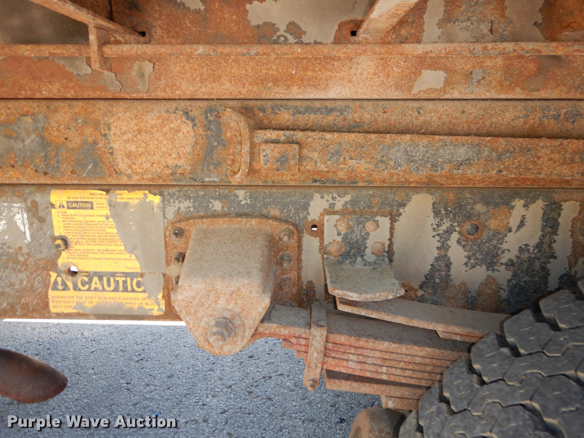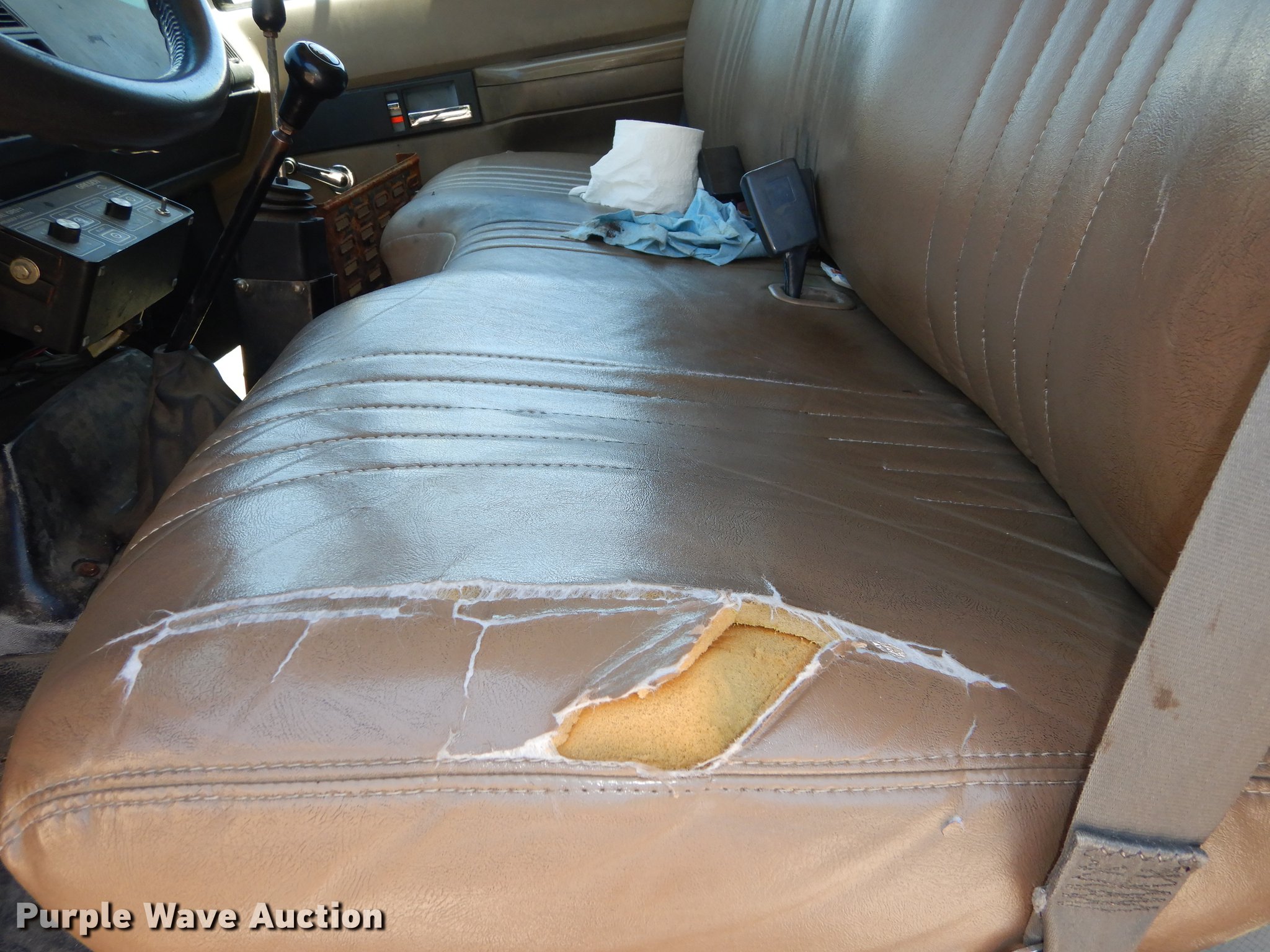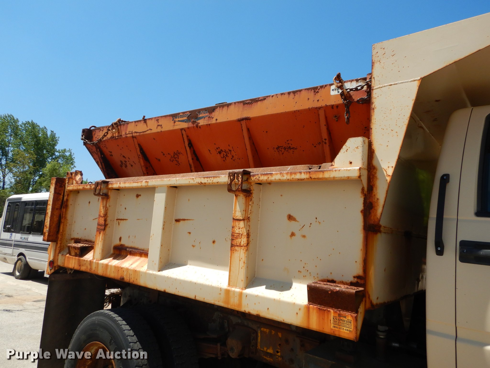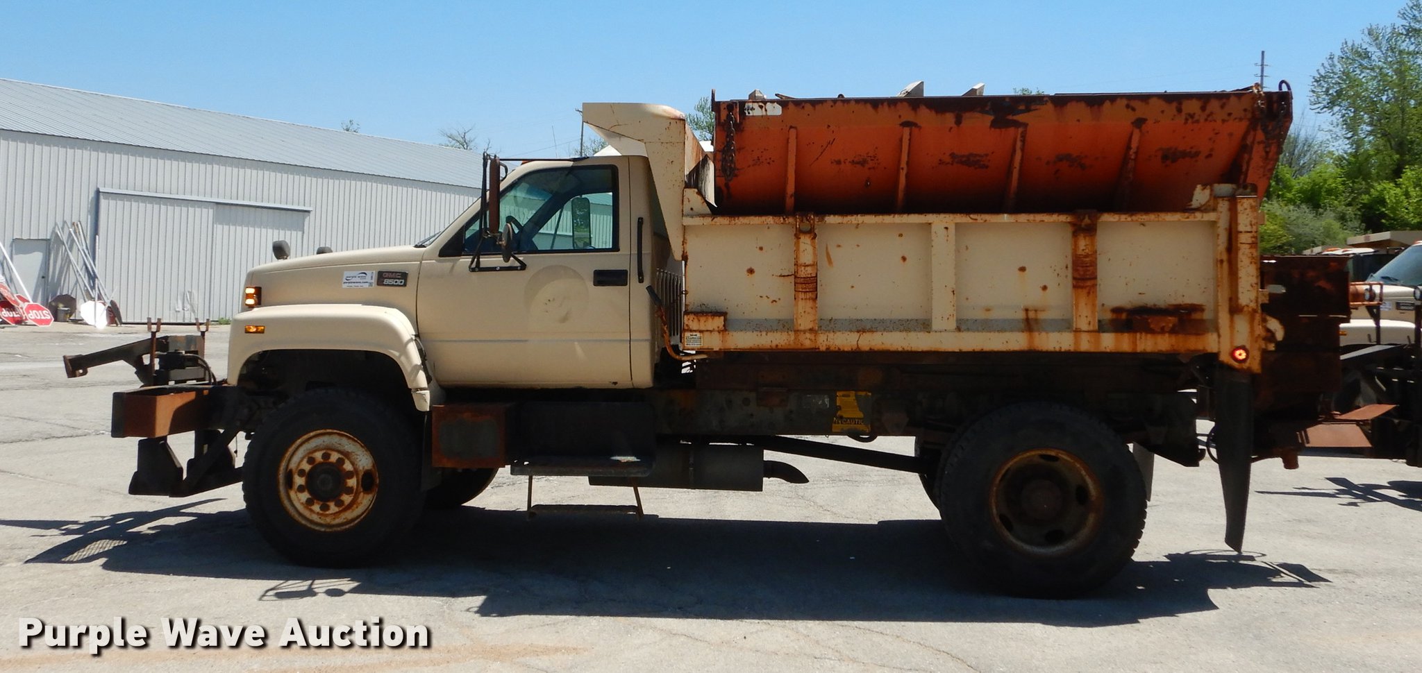 Purple Wave is selling a used Construction Dump Truck in Kansas. This item is a 1997 GMC C8500 dump truck with the following: 70,375 miles on odometer, Caterpillar 3116 6.6L L6 turbo diesel engine, 230 HP, Six speed manual transmission, Single axle, Heat, Front mounted PTO, Knapheide steel dump bed, 10'L x 95"W, 25" side height, Single ram hoist, Manual end gate, Snow plow mount, Swenson 10' spreader, Spinner is stuck, Single fuel tank, Pintle hitch, Spring suspension, Air brakes, 11R22.5 tires, GVWR 35,050 lbs, FAWR 12,350 lbs, RAWR 22,700 lbs, Engine oil leak, Unit# 801