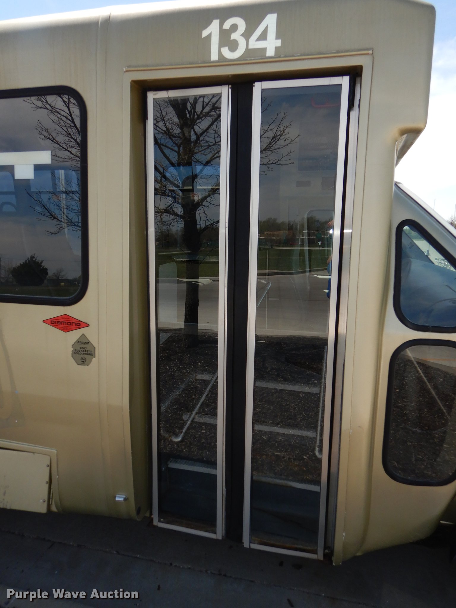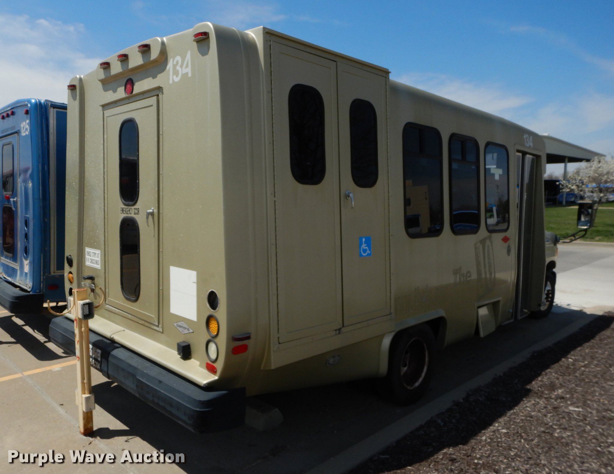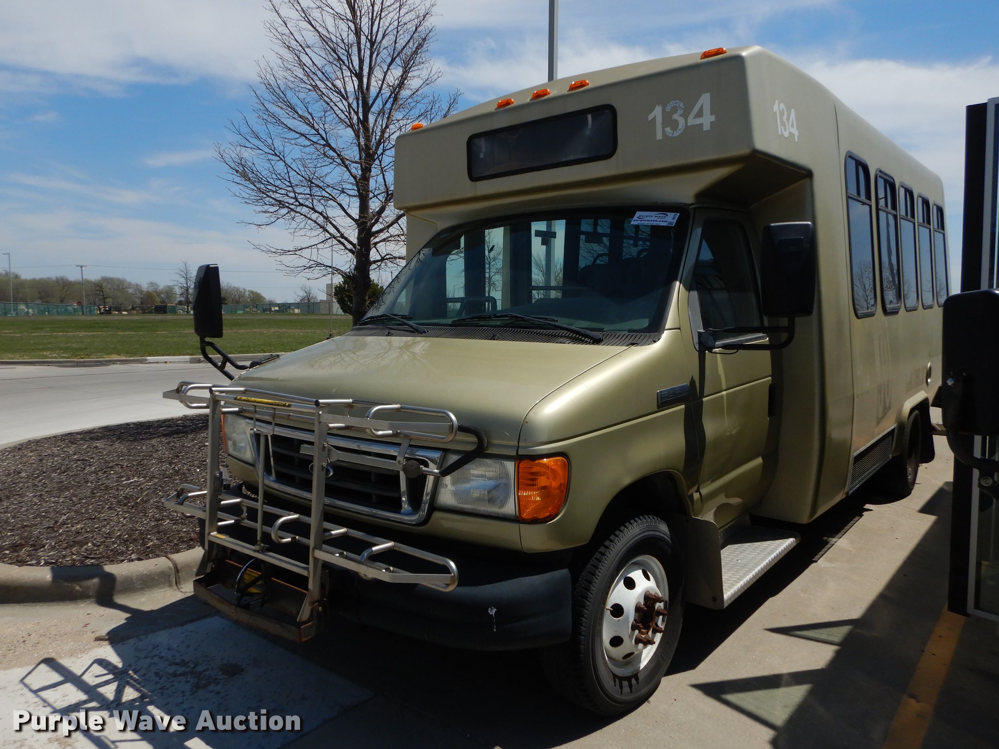 Purple Wave is selling a used Bus in Kansas. This item is a 2006 Ford E450 shuttle bus with the following: 180,203 miles on odometer, 6.0L V8 OHV 32V turbo diesel engine, Automatic transmission, Single axle, AC and heat, AM/FM, Suspension seat, 14 passenger capacity, Braun wheelchair lift, Wheelchair tie down area, Bicycle rack, Ceiling, front, and rear emergency exits, Spring suspension, Hydraulic brakes, 225/75R16 tires, Parts missing, Non-operational unit, Unit# JCT134