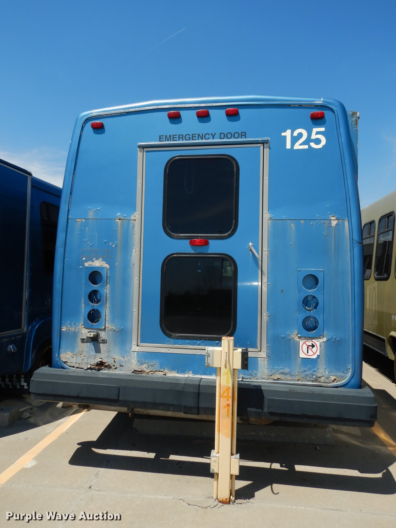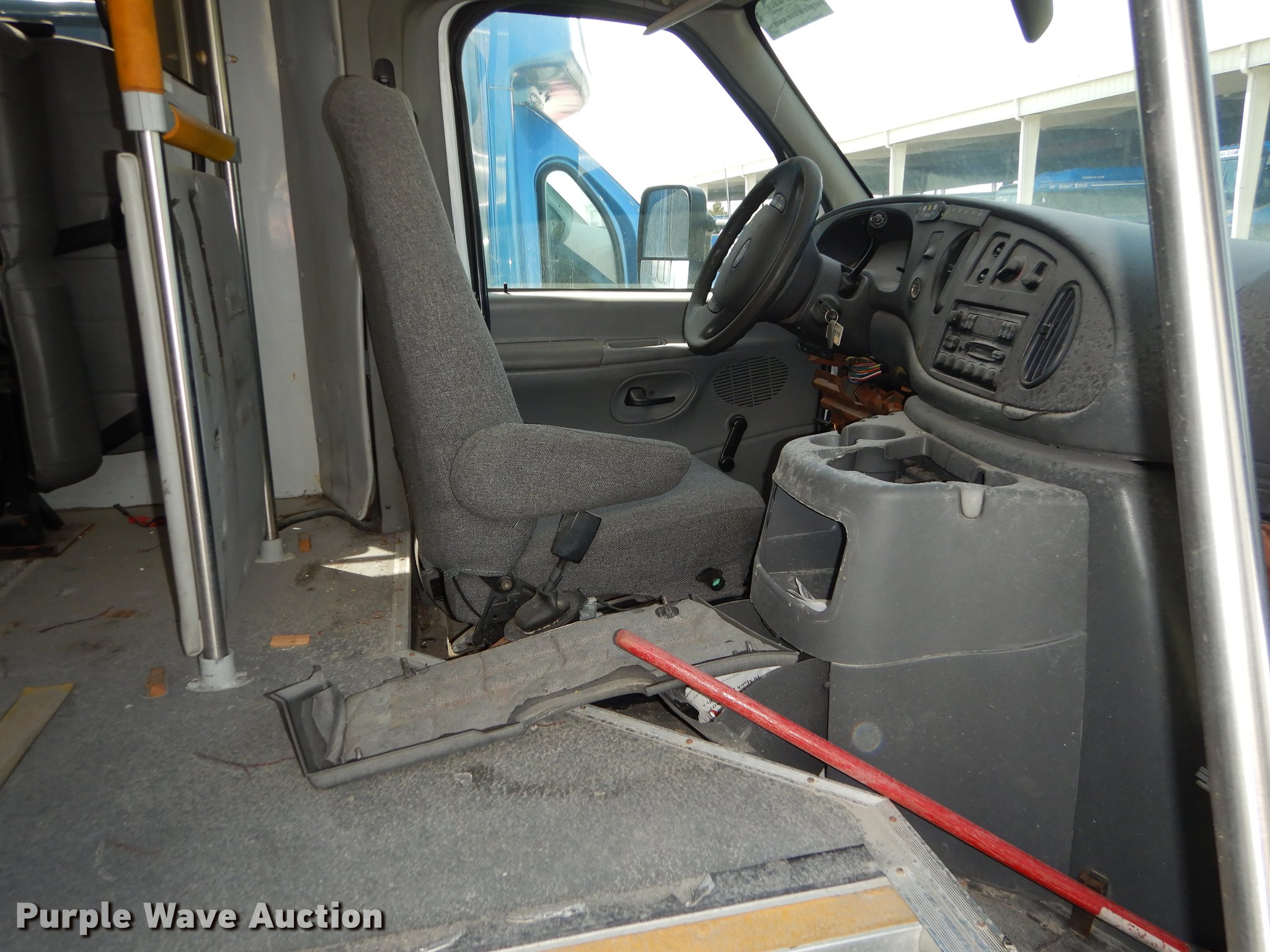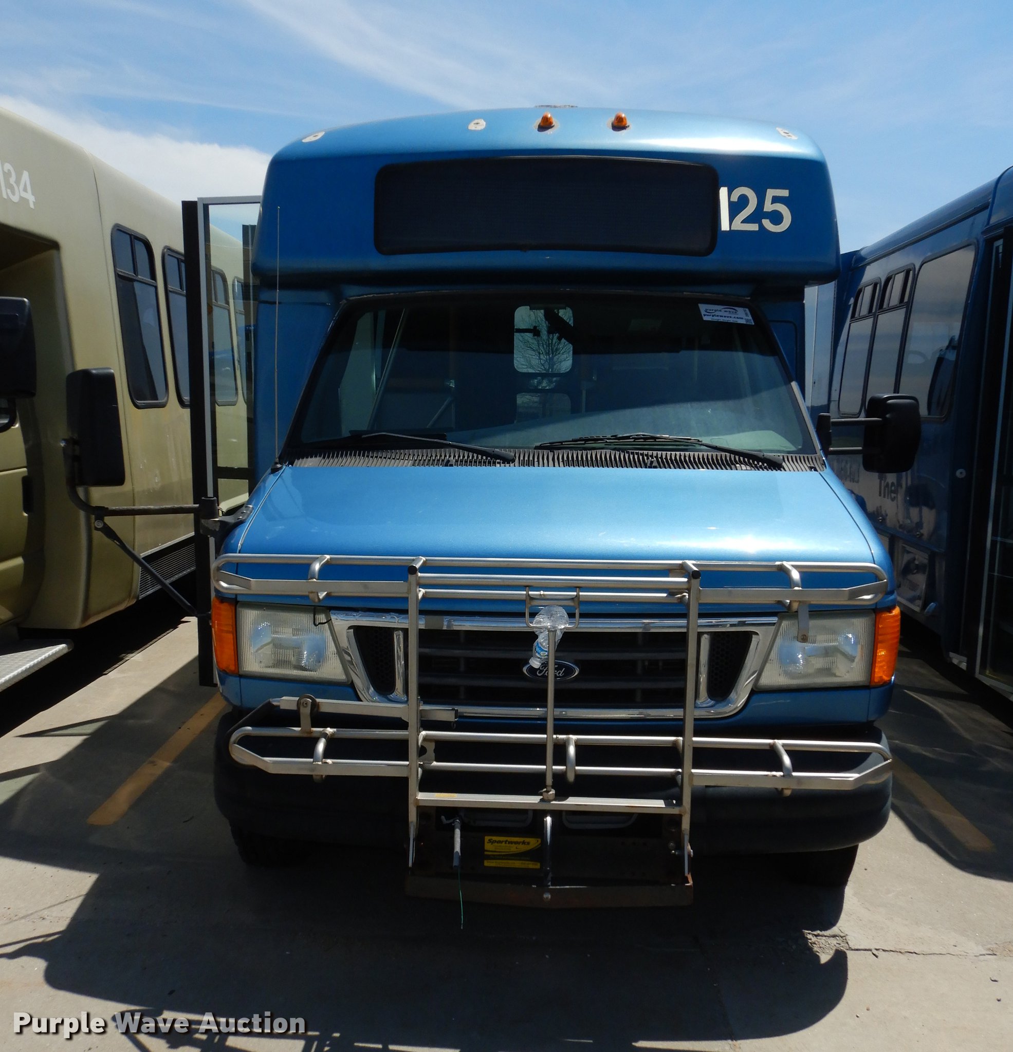 Purple Wave is selling a used Bus in Kansas. This item is a 2005 Ford E450 shuttle bus with the following: 224,801 miles on odometer, 6.0L V8 OHV 32V turbo diesel engine, Automatic transmission, Single axle, AC and heat, AM/FM, Suspension seat, Ceiling handrail, 14 passenger capacity, Braun wheelchair lift, Wheelchair tie down area, Ceiling, front, and rear emergency exits, Spring suspension, Hydraulic brakes, 225/75R16 tires, Dead batteries, Flat tires, Unit# JCT125
