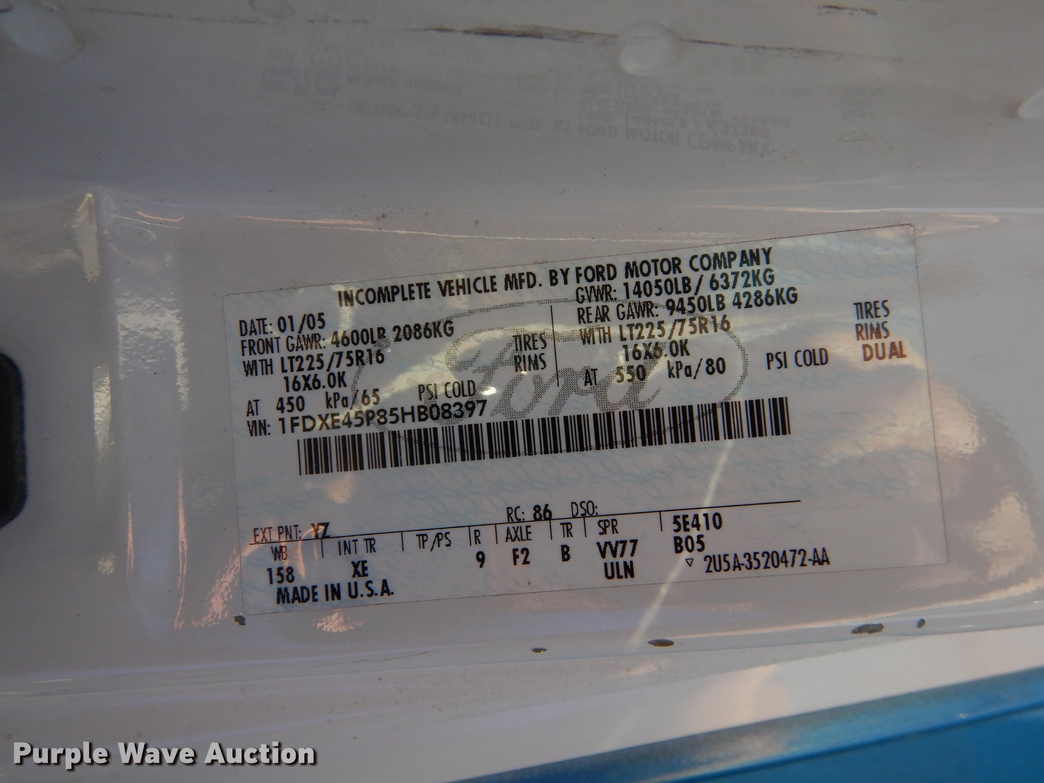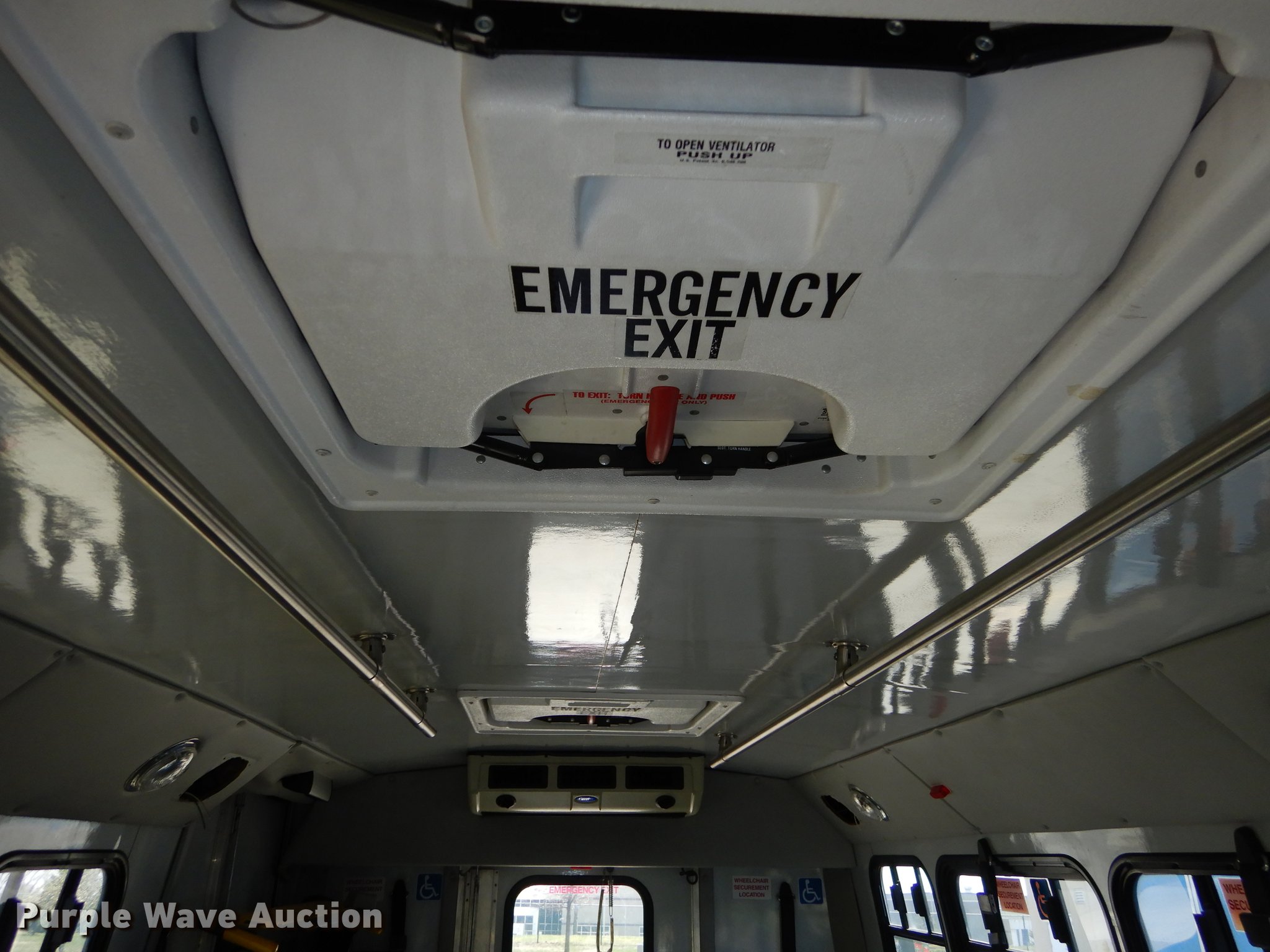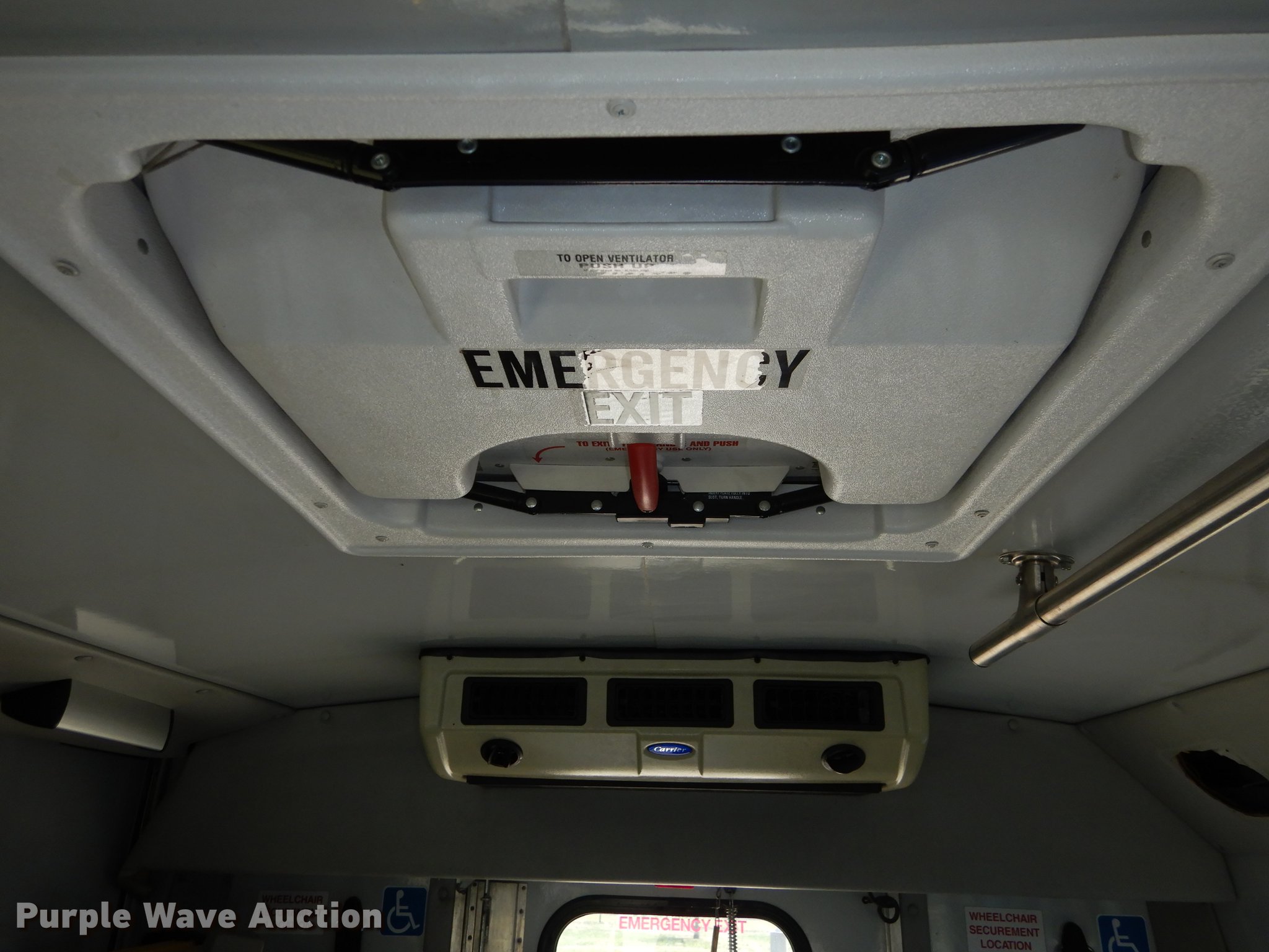 Purple Wave is selling a used Bus in Kansas. This item is a 2005 Ford E450 shuttle bus with the following: 224,801 miles on odometer, 6.0L V8 OHV 32V turbo diesel engine, Automatic transmission, Single axle, AC and heat, AM/FM, Suspension seat, Ceiling handrail, 14 passenger capacity, Braun wheelchair lift, Wheelchair tie down area, Ceiling, front, and rear emergency exits, Spring suspension, Hydraulic brakes, 225/75R16 tires, Dead batteries, Flat tires, Unit# JCT125