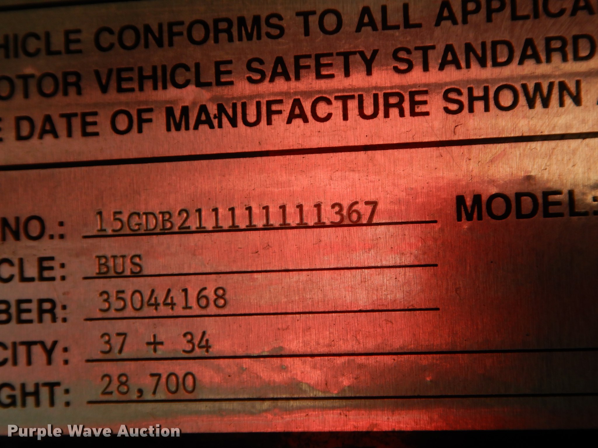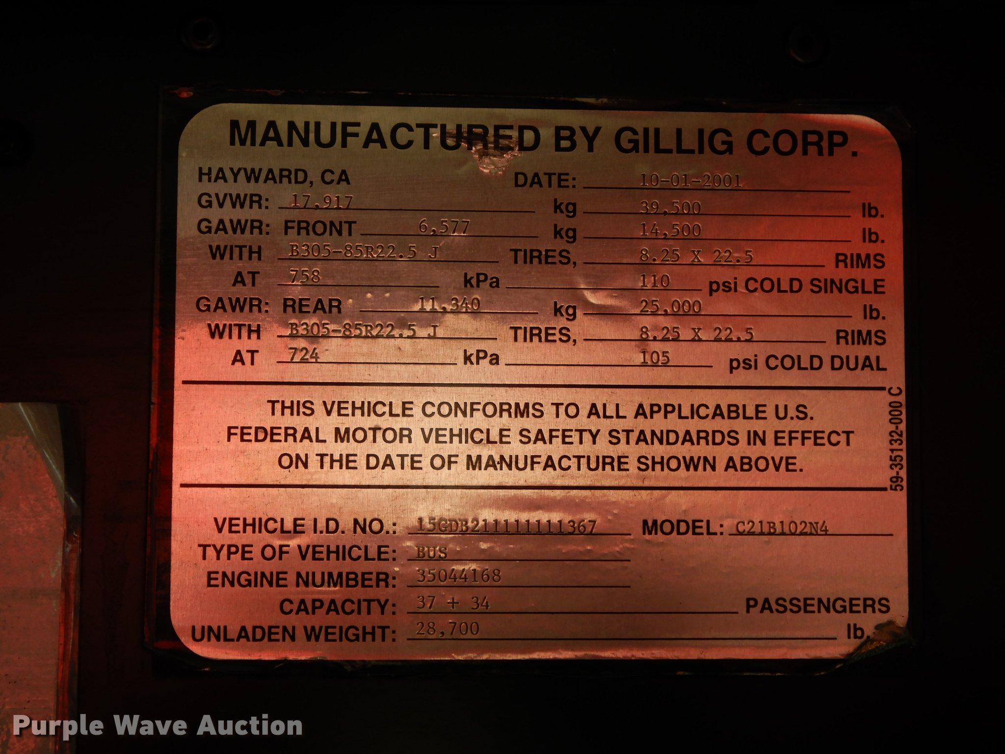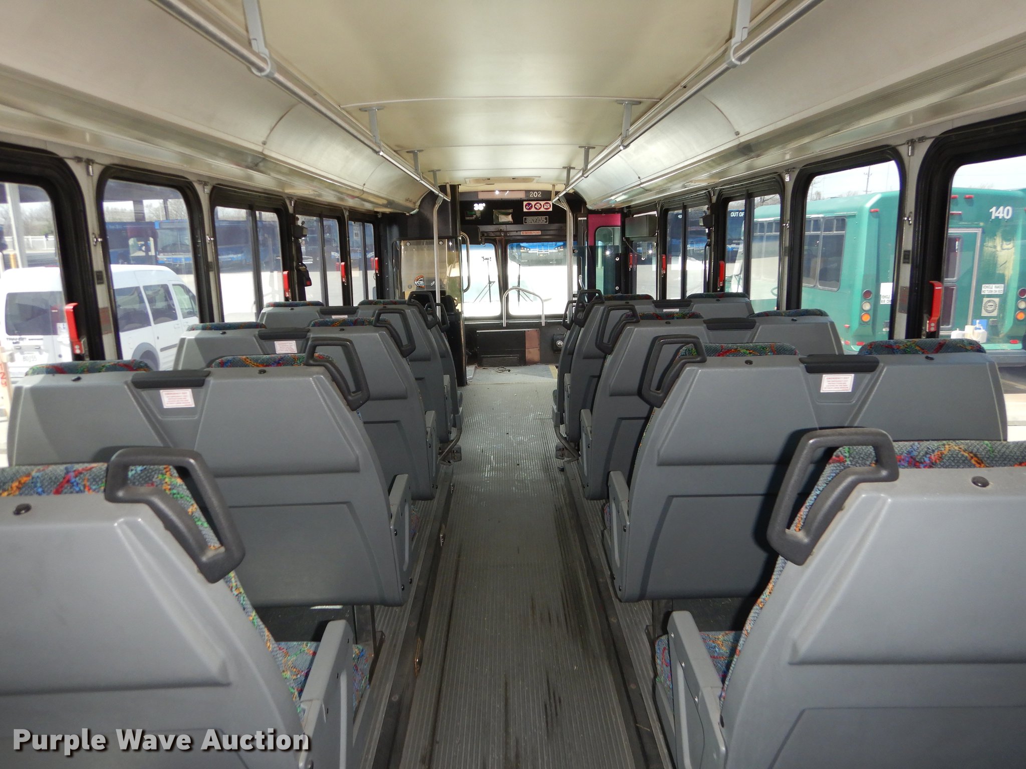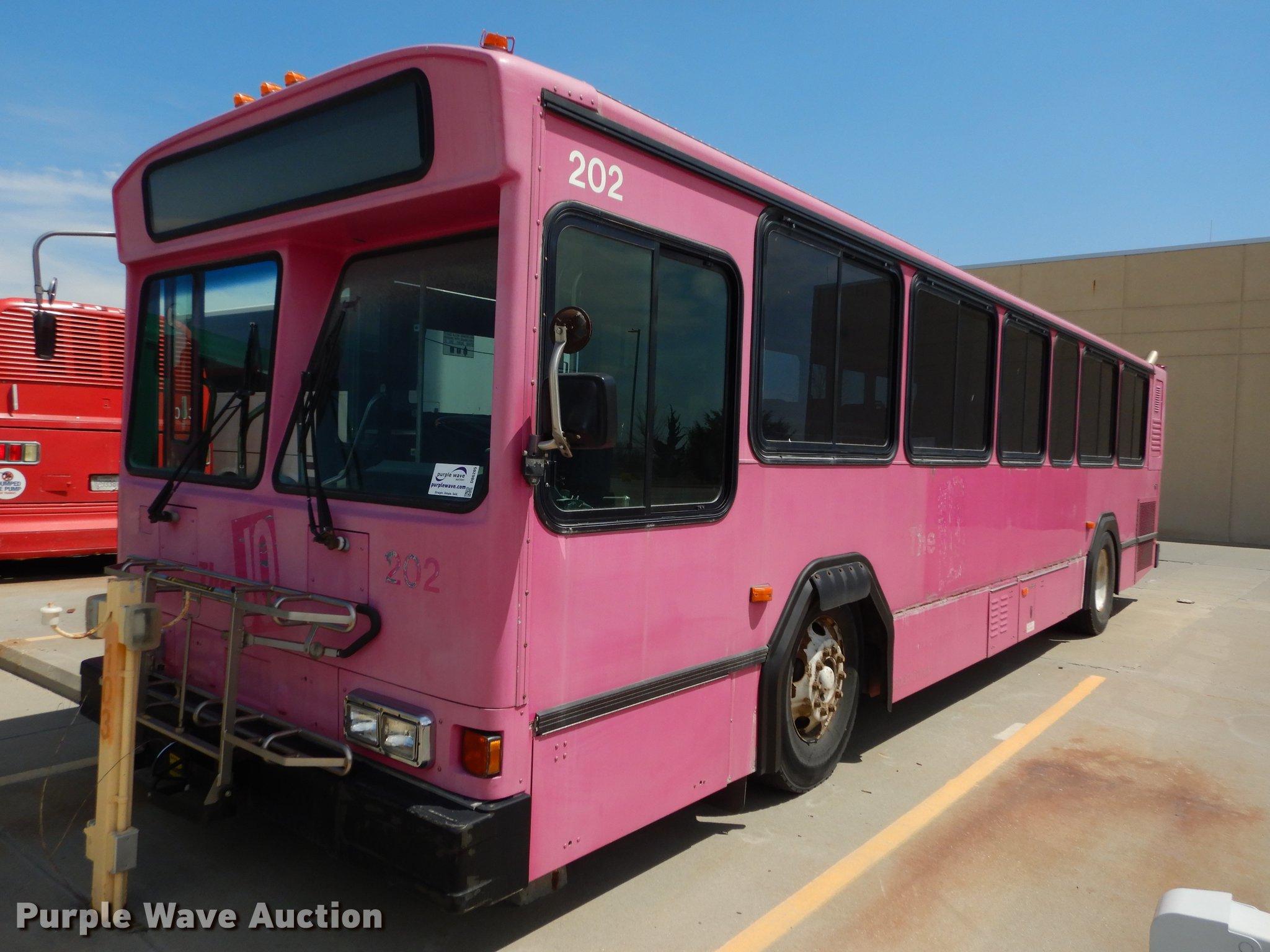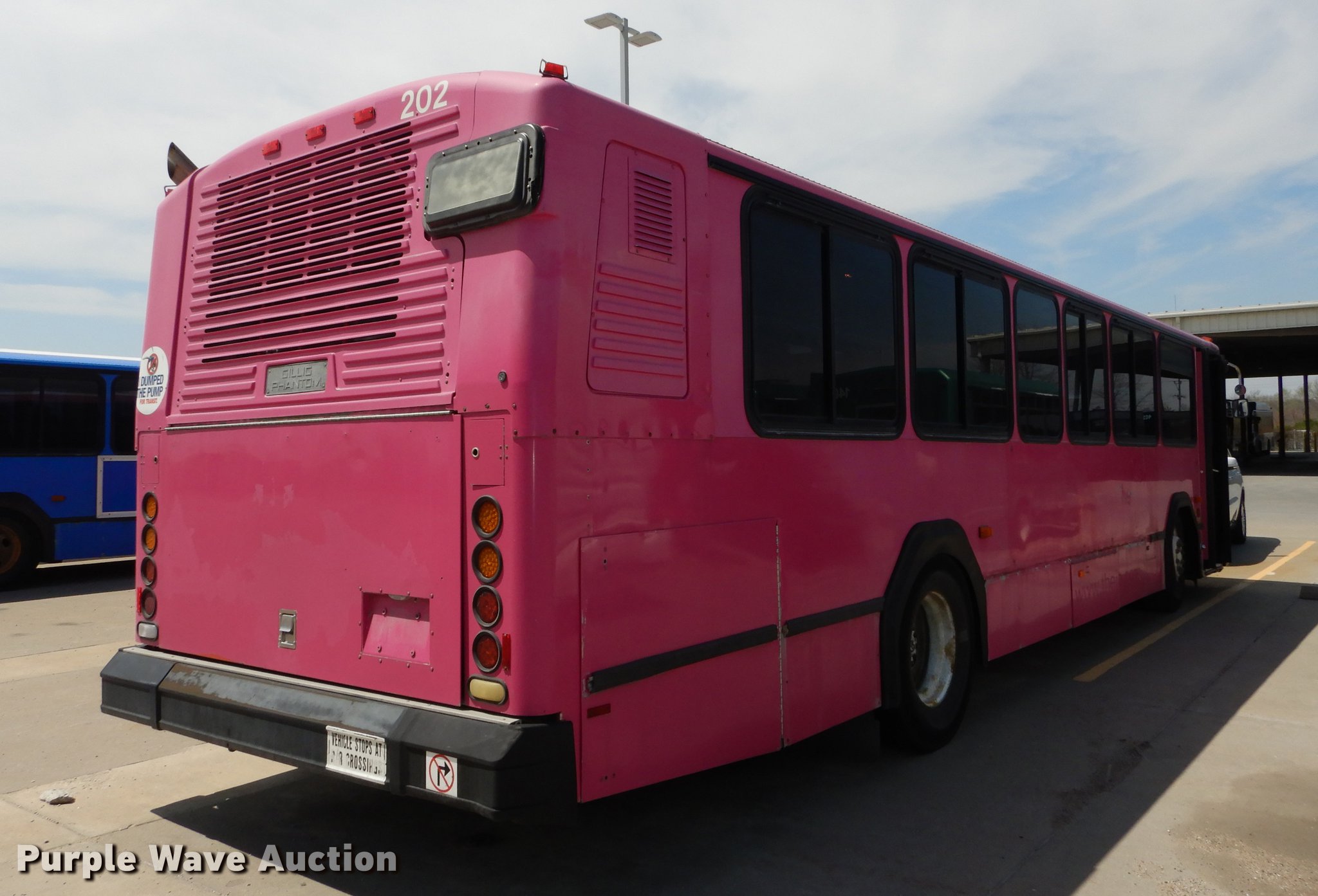 Purple Wave is selling a used Bus in Kansas. This item is a 2001 Gillig Phantom C21B102N4 transit bus with the following: 68,639 miles on odometer, 8,355 hours on meter, Approx. 428,437 total miles, Cummins M11 10.0L six cylinder turbo diesel engine, Allison automatic transmission, Single axle, AC and heat, Rear AC, Air suspension seat, Ceiling handrail, 37 passenger capacity, (37) adult seats, Bicycle rack, Ceiling and front emergency exits, Air suspension, Air brakes, 315/80R22.5 tires, GVWR 39,500 lbs, Dead batteries, Unit# JCT202