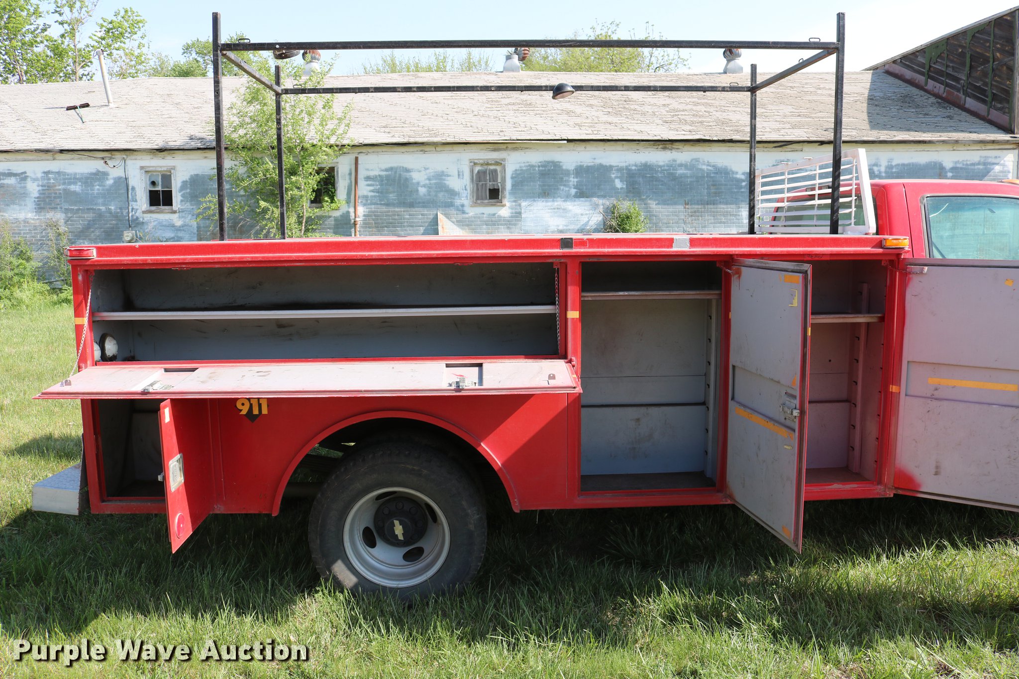 1998 Chevrolet Cheyenne 3500 rescue fire truck. 4,400 miles on odometer, 5.7L V8 OHV 16V gas engine, Automatic transmission, Four wheel drive, Single axle, Heat, MCB utility bed 11'L x 89"W, Single fuel tank, Spring suspension, Hydraulic brakes, 225/75R16 tires, No pump, No rear view mirror, No radio, ABS light on. Kansas title. 1GBJK34R7WF052289. Munden, KS 66959