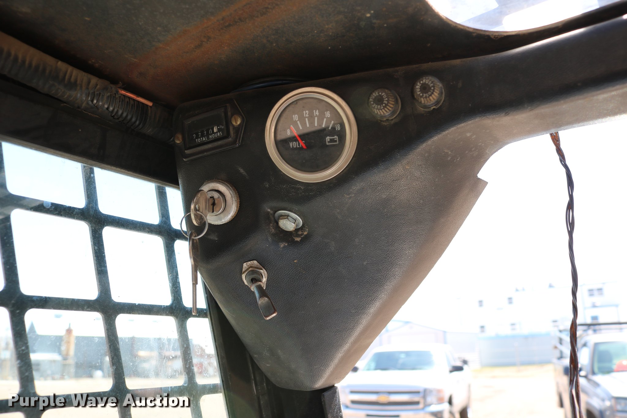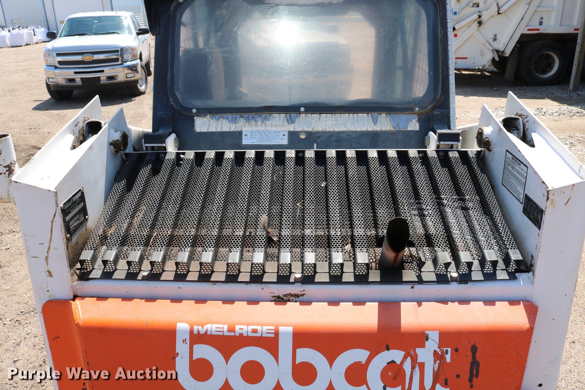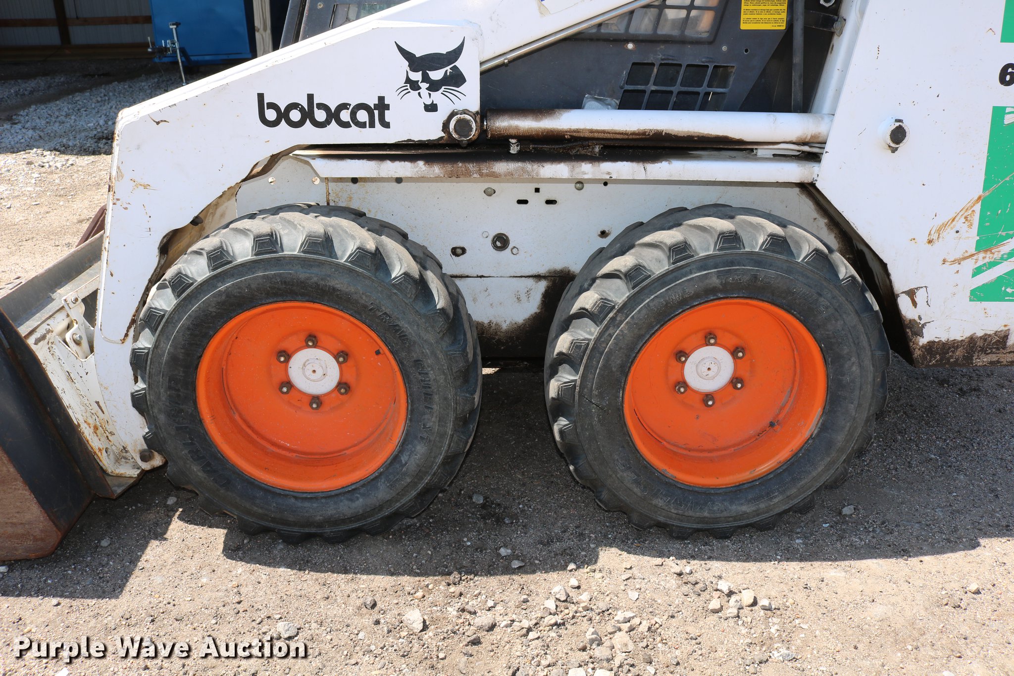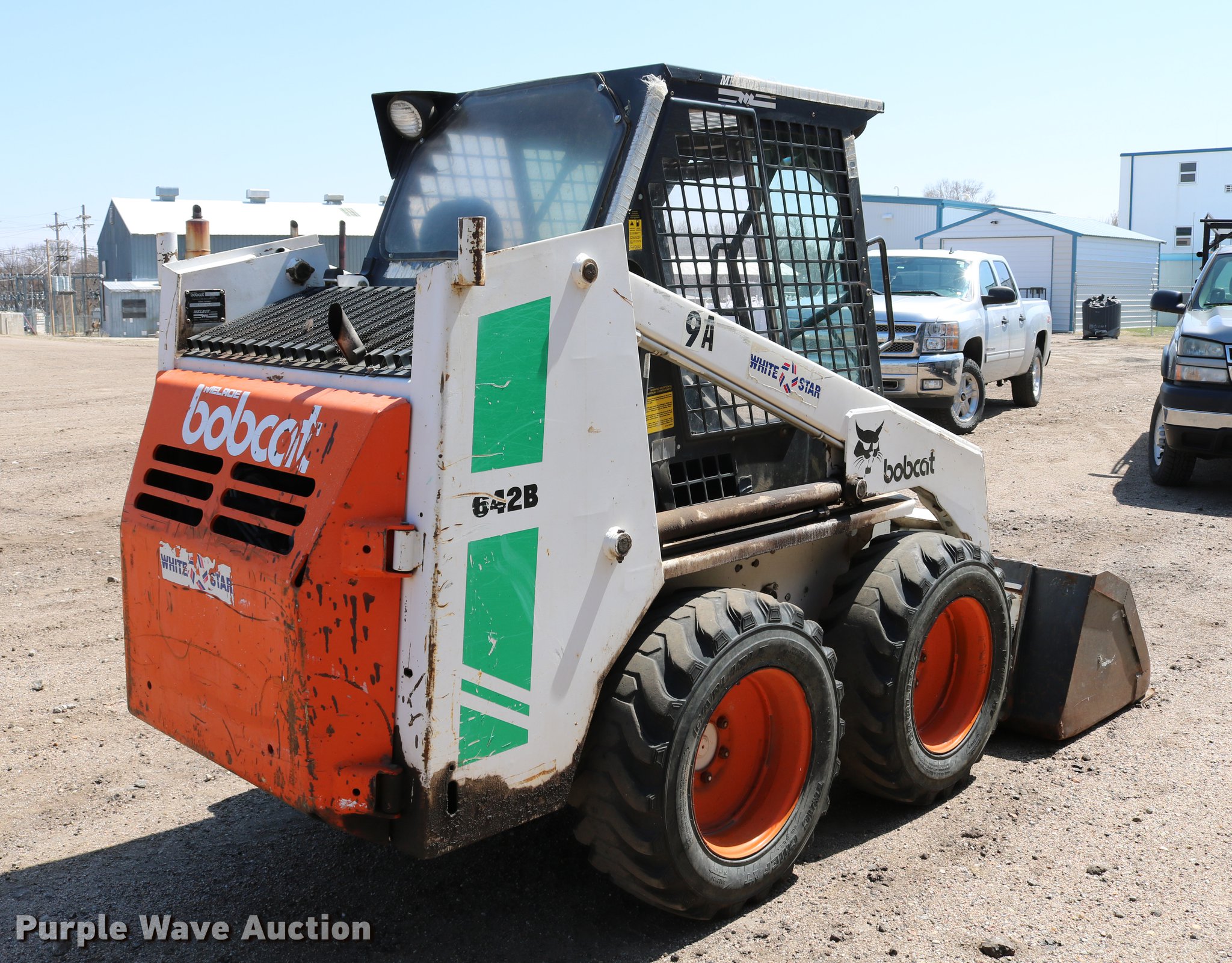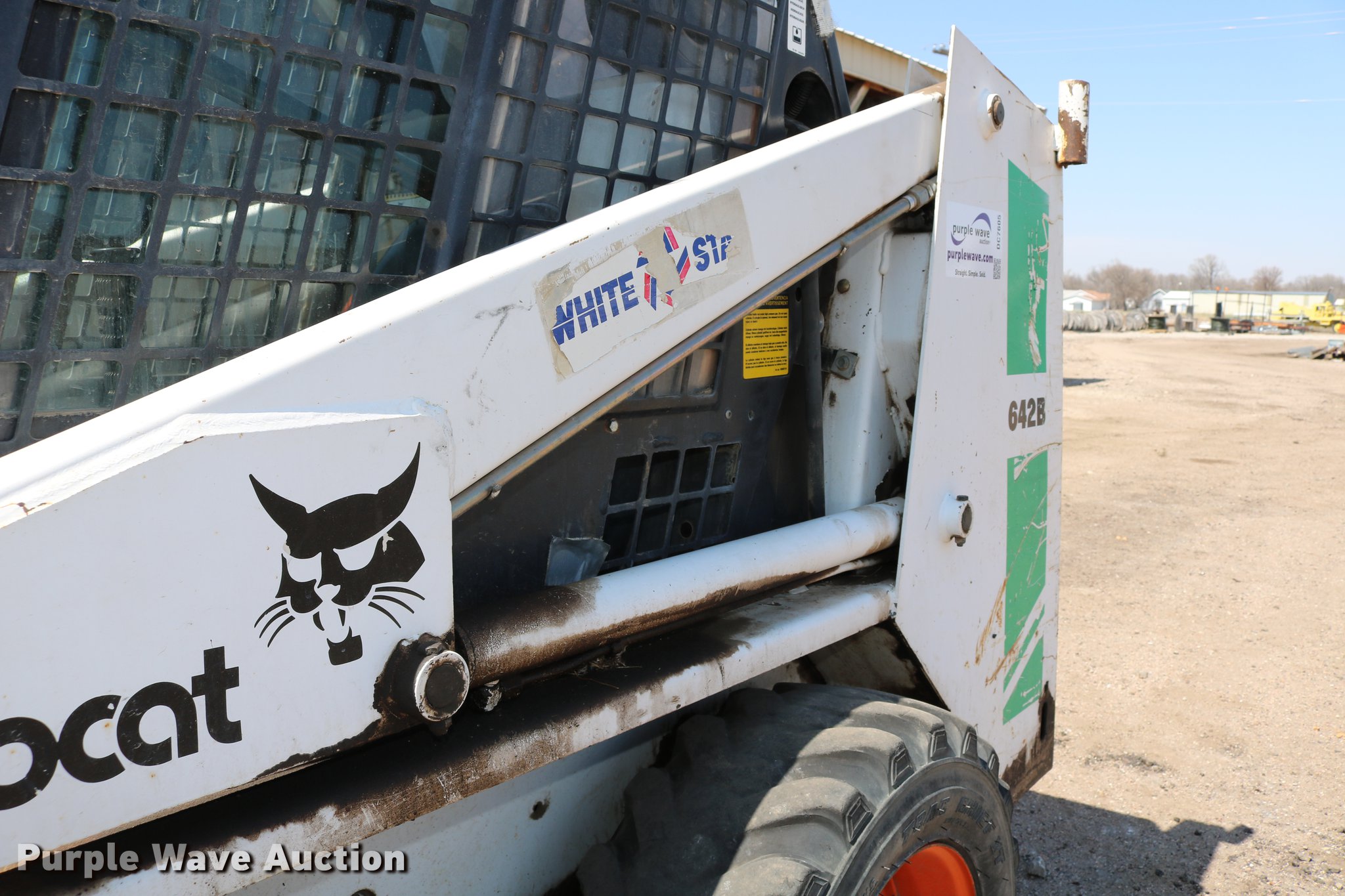 Purple Wave is selling a used Skid Steer Loader in Kansas. This item is a 1988 Bobcat 642B skid steer with the following: 2,771 hours on meter, Four cylinder gas engine, Hydrostatic transmission, EROPS, Heat, Hand and foot controls, Front and rear work lights, Wipers, Auxiliary hydraulics, Manual quick coupler, 60"W bucket, Bolt-on cutting edge, 10-16.5 tires, Auxiliary hydraulic pump may be weak, Lift and lower foot pedal intermittently sticks, Serial 504027251