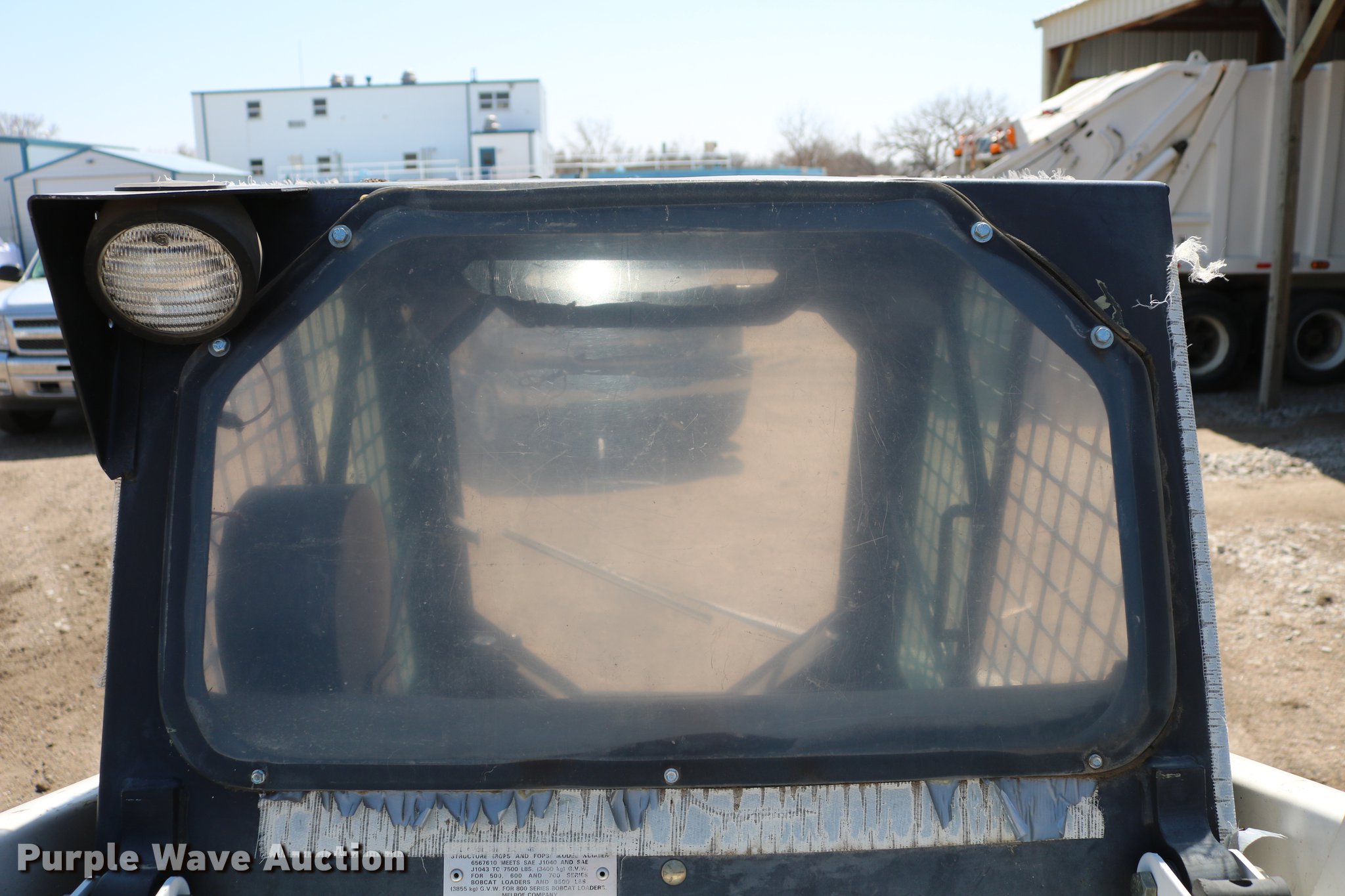 1988 Bobcat 642B skid steer. 2,771 hours on meter, Four cylinder gas engine, Hydrostatic transmission, EROPS, Heat, Hand and foot controls, Front and rear work lights, Wipers, Auxiliary hydraulics, Manual quick coupler, 60"W bucket Bolt-on cutting edge, 10-16.5 tires, Auxiliary hydraulic pump may be weak, Lift and lower foot pedal intermittently sticks, Serial 504027251. City Shop. Norton, KS 67654