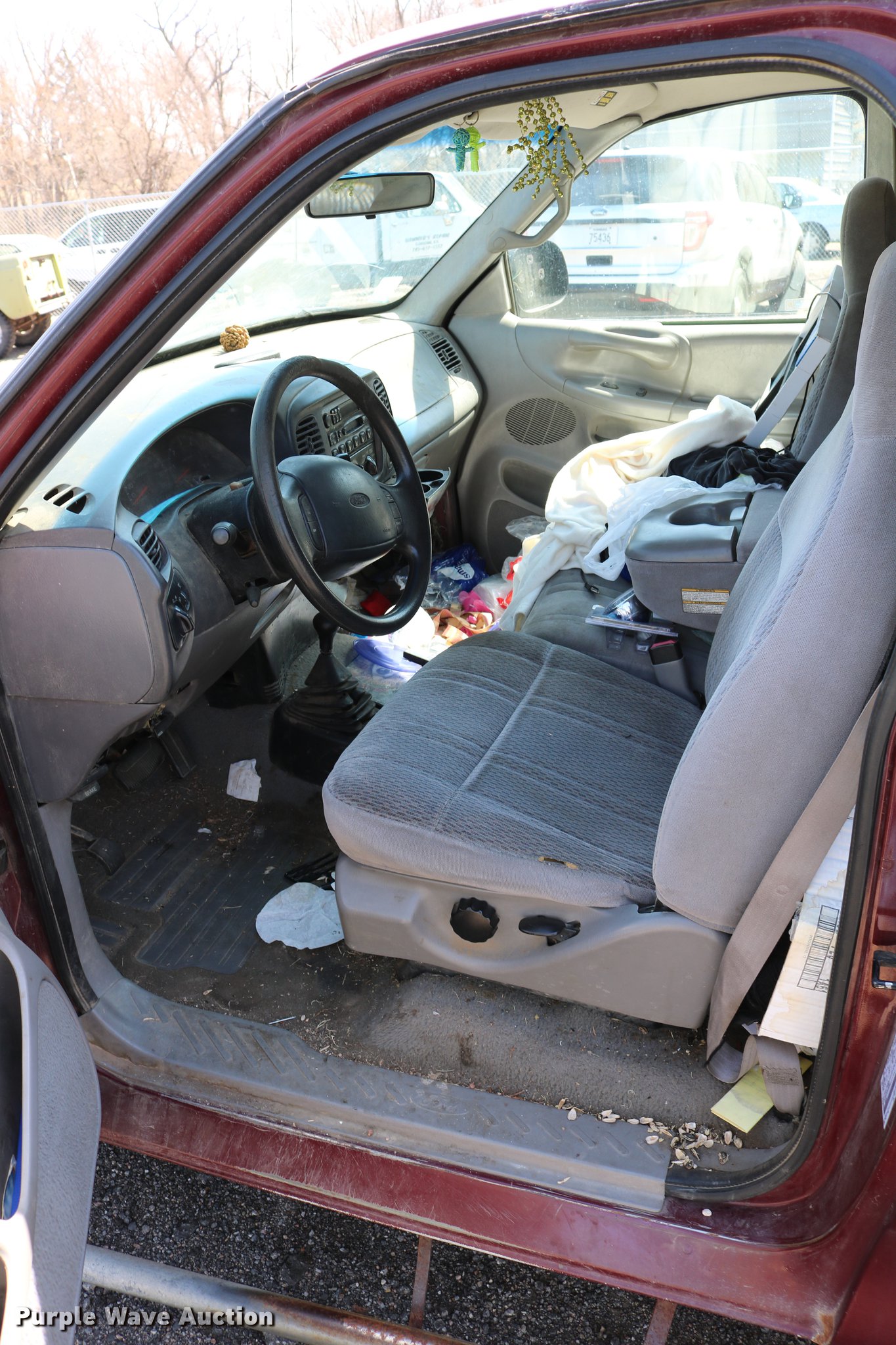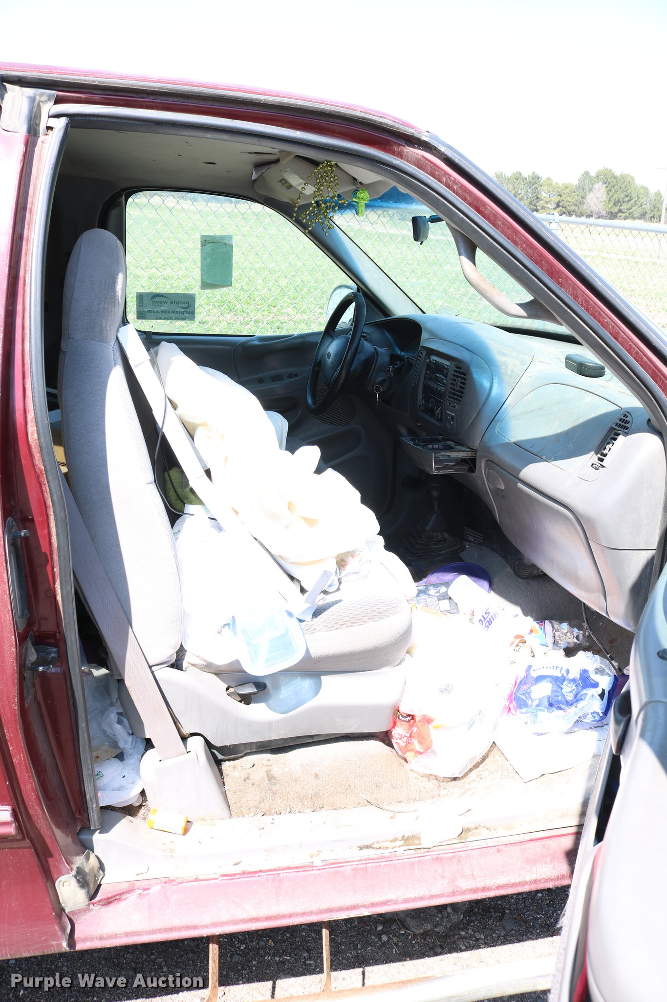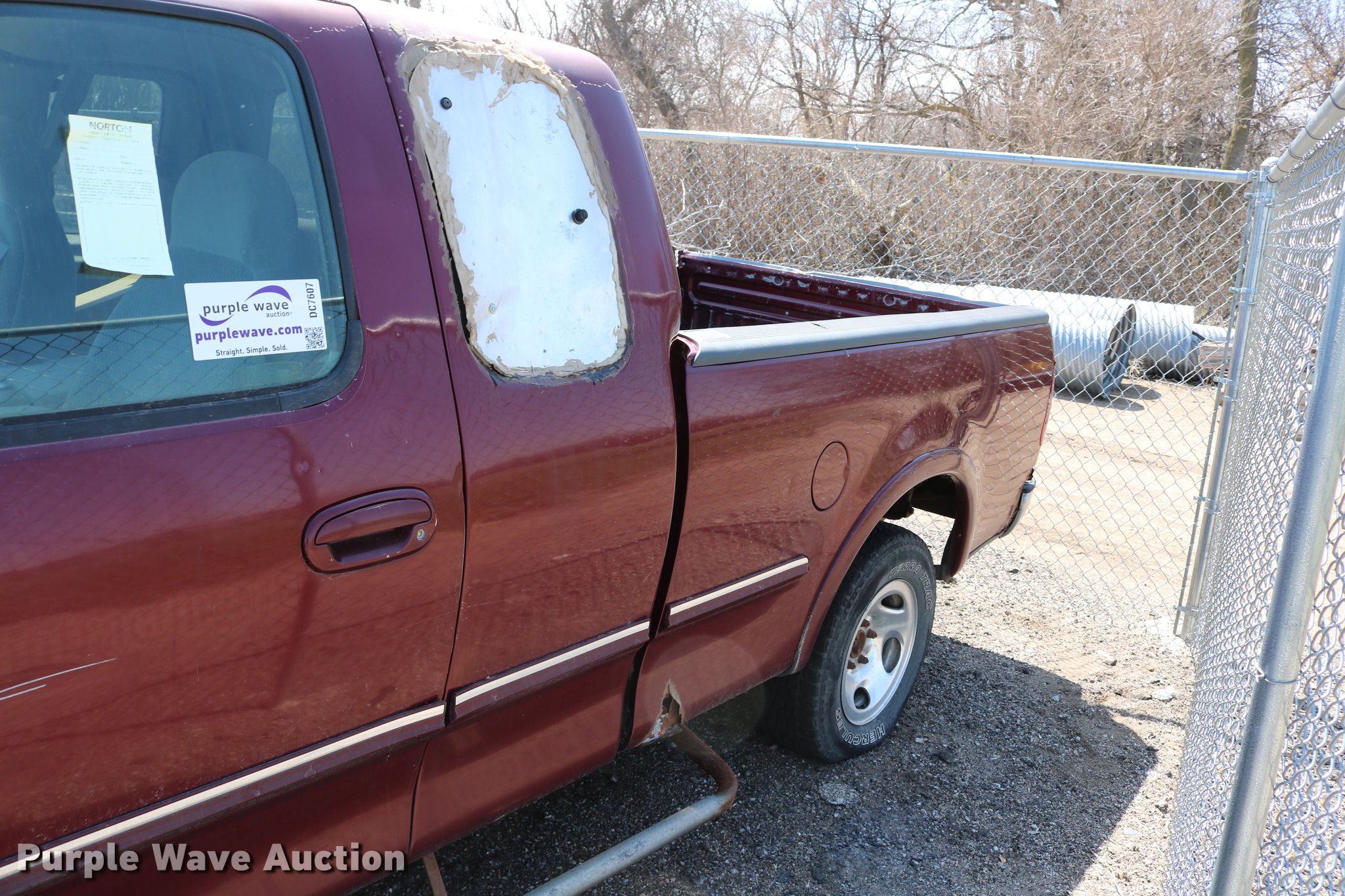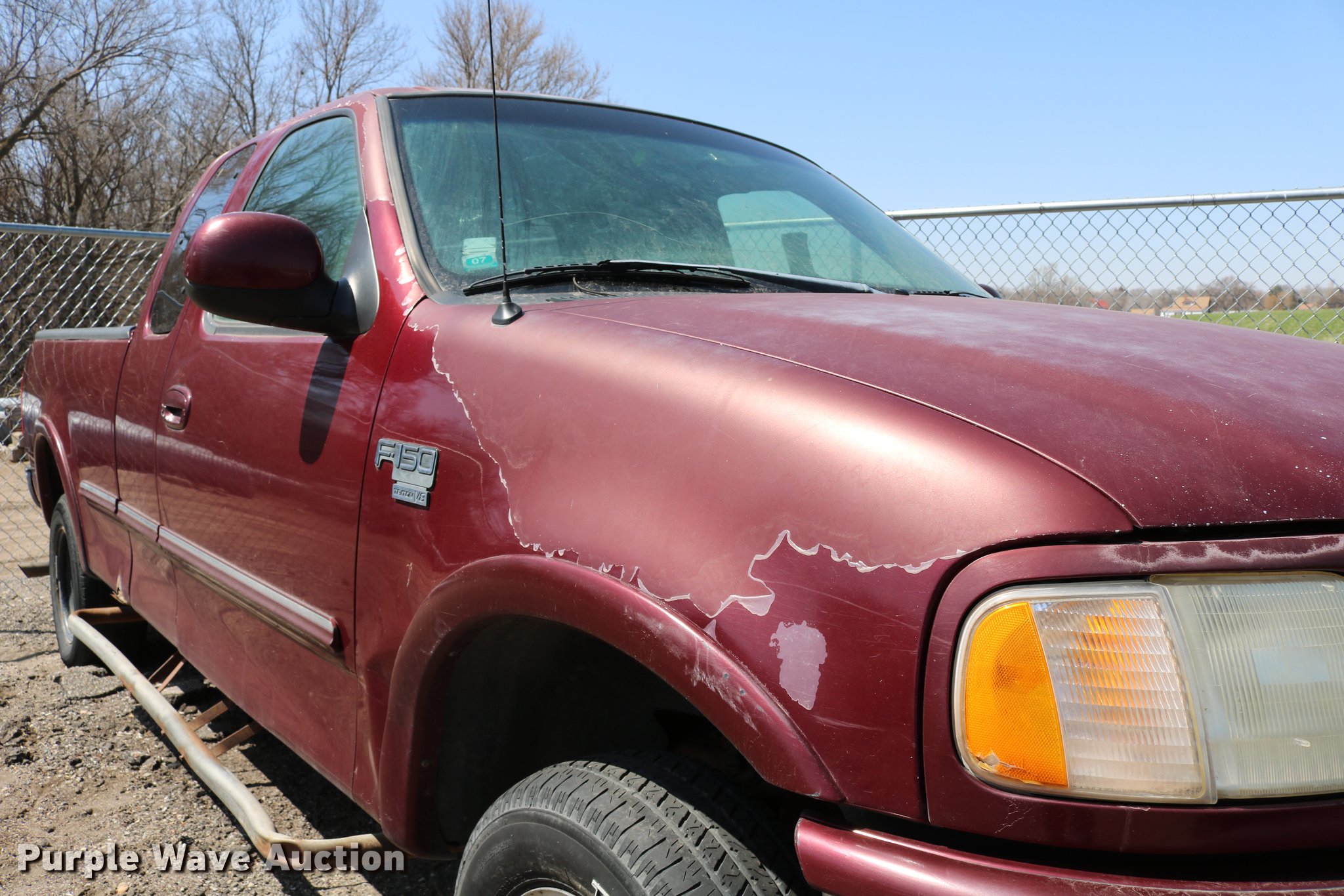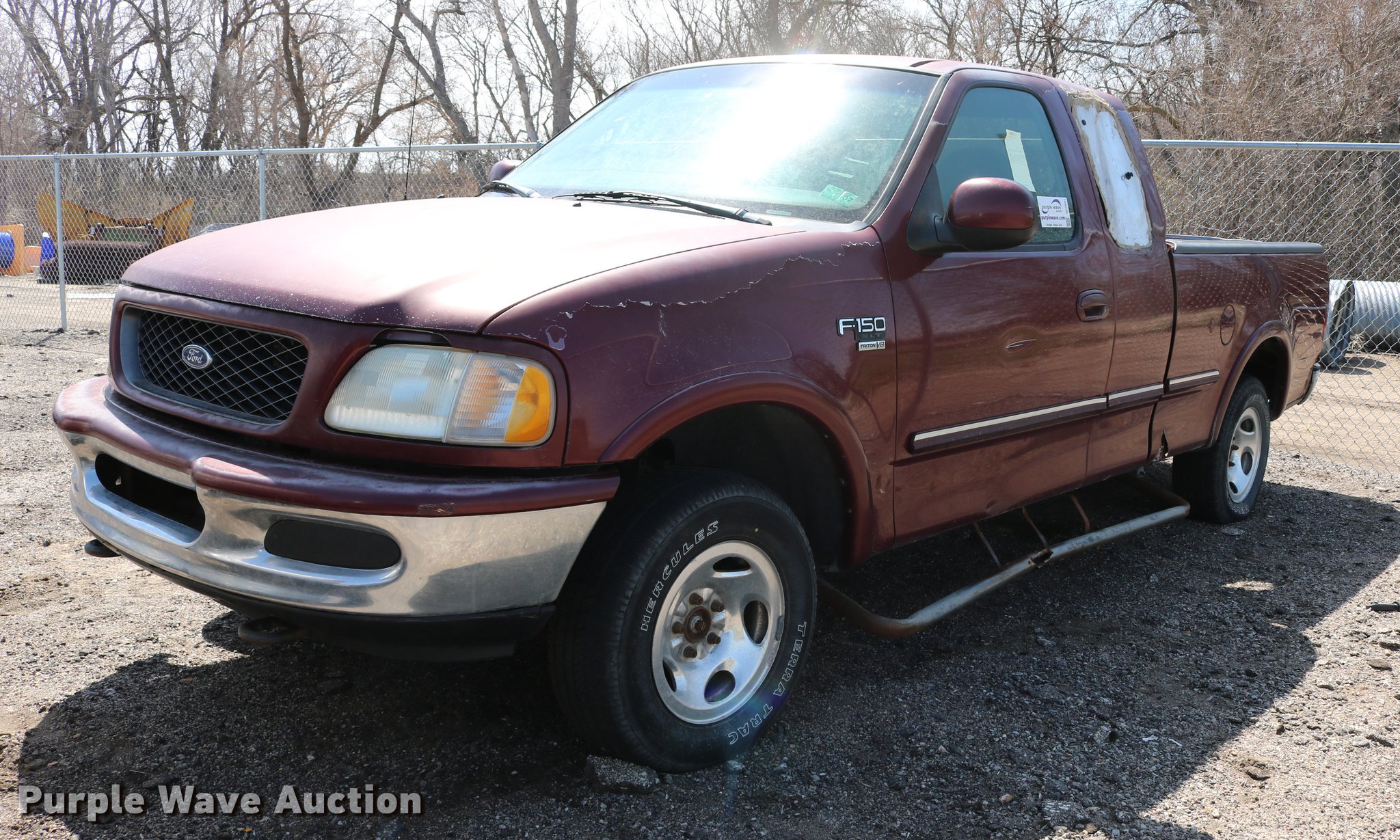 Purple Wave is selling a used 1/2 Ton Pickup or Van in Kansas. This item is a 1998 Ford F150 SuperCab pickup truck with the following: 222,831 miles on odometer, 4.6L V8 SOHC 16V gas engine, Automatic transmission, Four wheel drive, AC and heat, Tilt, Cruise, AM/FM, Power windows, locks, and mirrors, Cloth interior, Front tow hooks, Shop built running boards, Bed liner, Receiver hitch, Trailer wiring, 235/70R16 tires, Driver side rear side window is broken out, Cracked driver side mirror, Passenger side mirror missing, Drivers side taillight broken, Cracked windshield, Tailgate damaged, Unknown operating condition