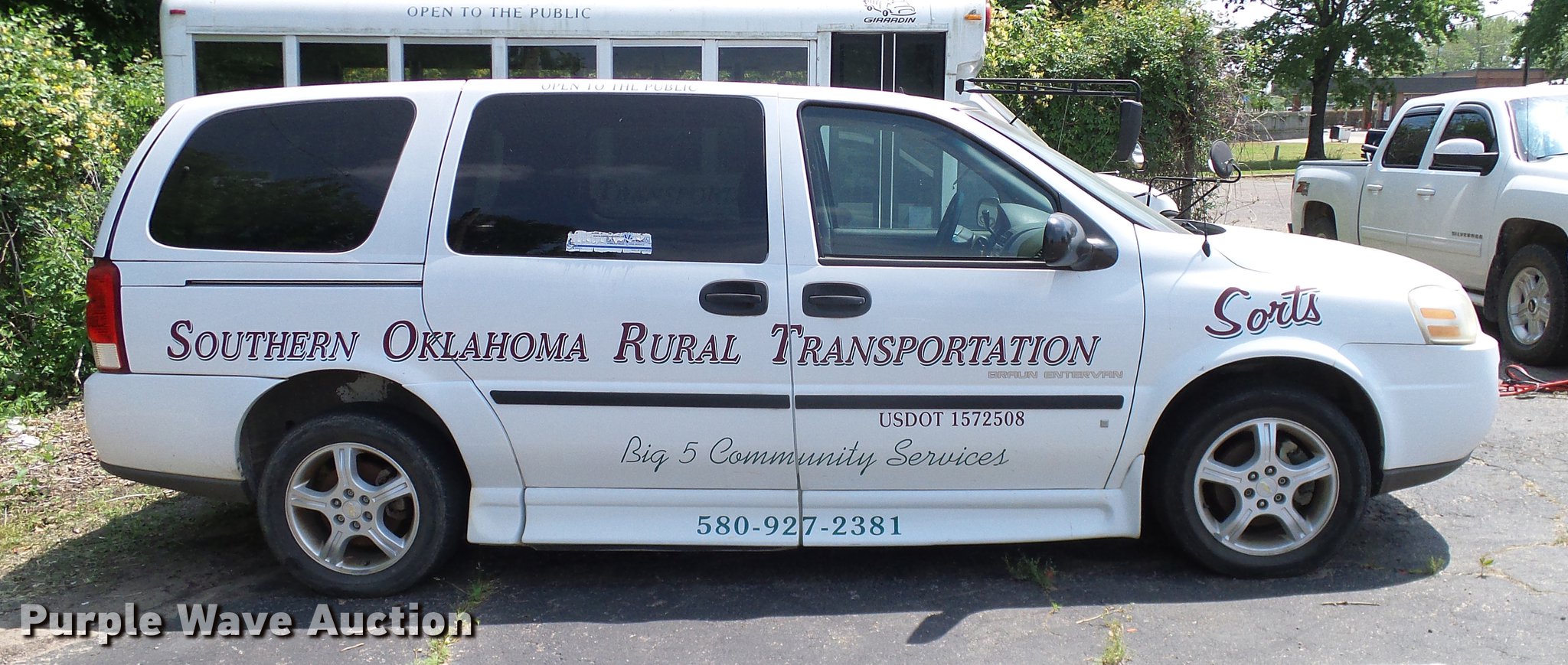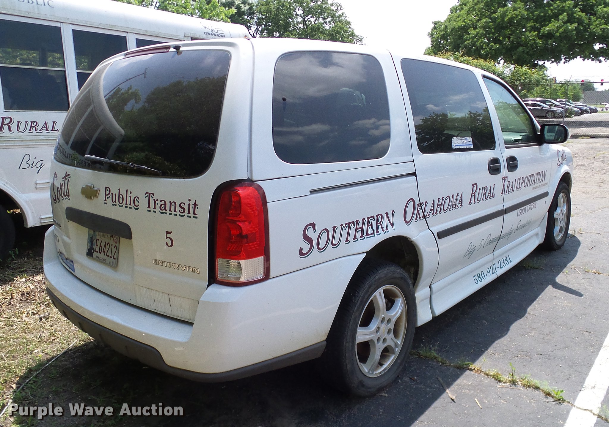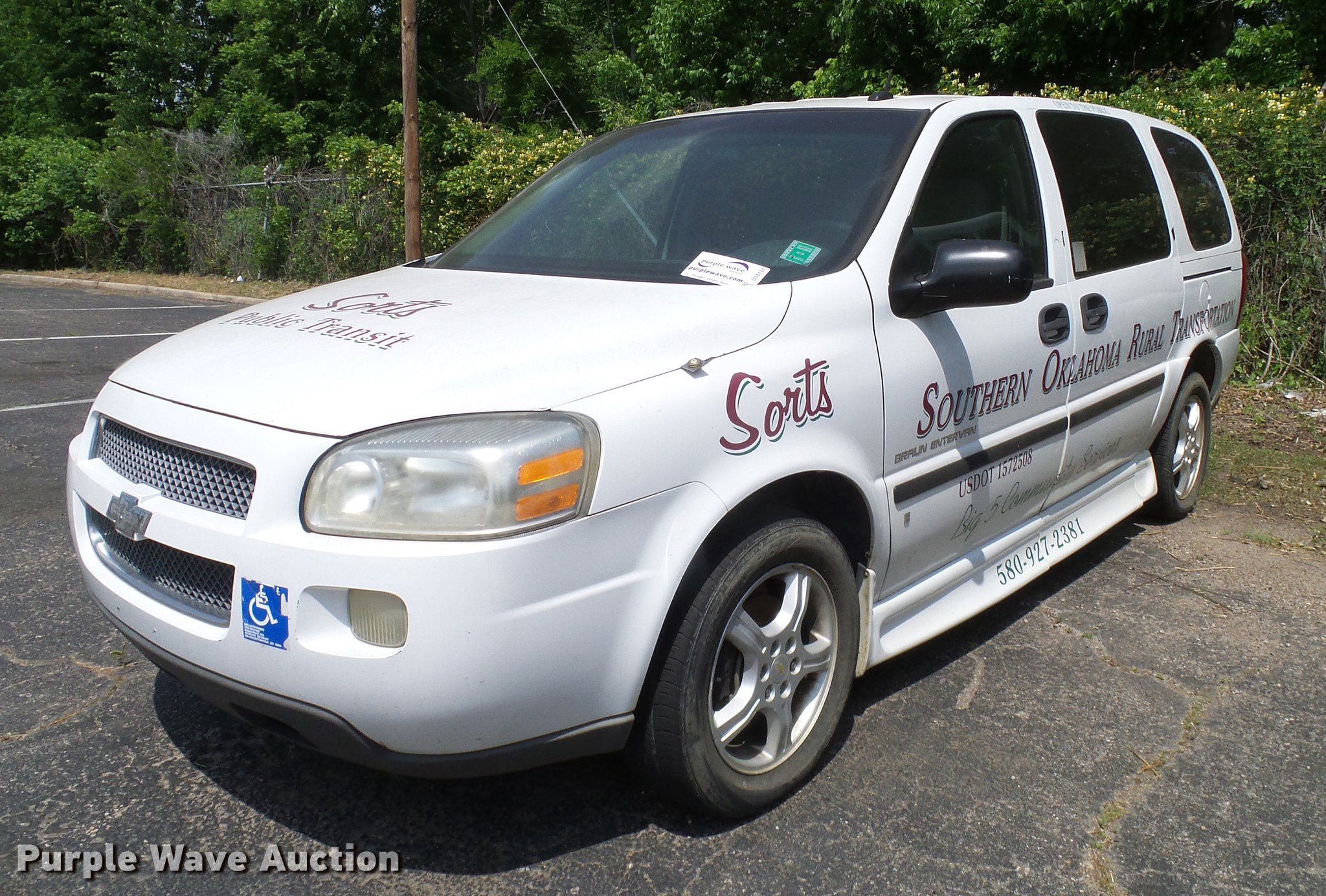 Purple Wave is selling a used Passenger Vehicle in Oklahoma. This item is a 2007 Chevrolet Uplander Cargo van with the following: 208,518 miles on odometer, 3.9L V6 DOHC 24V FFV gas engine, Automatic transmission, AC and heat, Tilt, Cruise, AM/FM/CD, Power windows, locks, and mirrors, Cloth interior, Wheelchair ramp, Broken, 225/60R17 tires, Dead battery, Unknown operating condition, Unit# 56