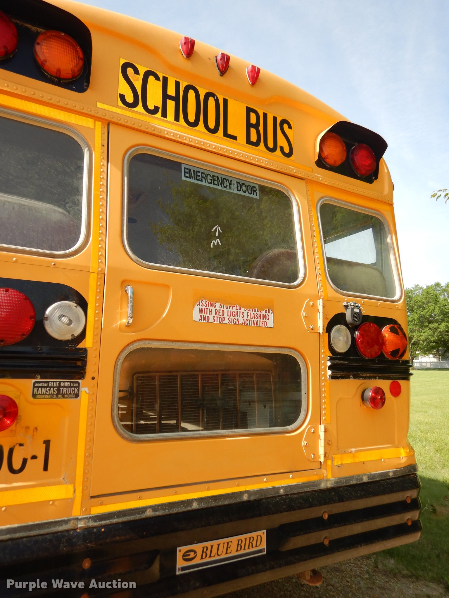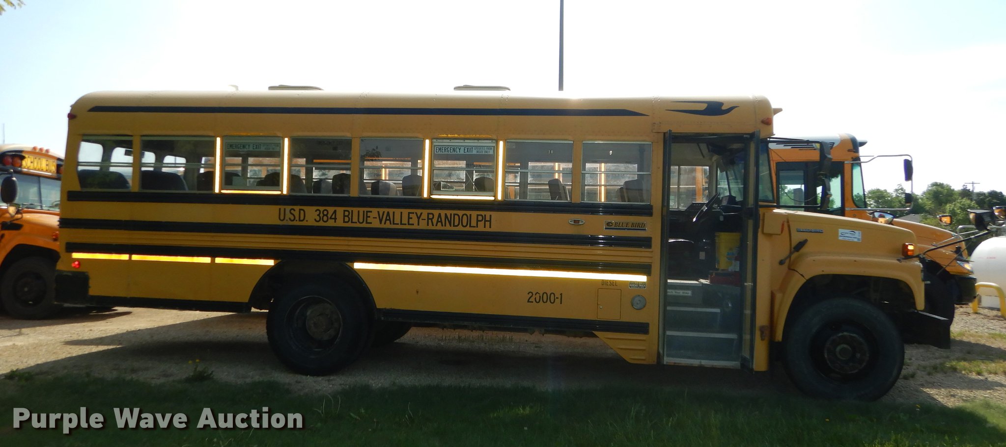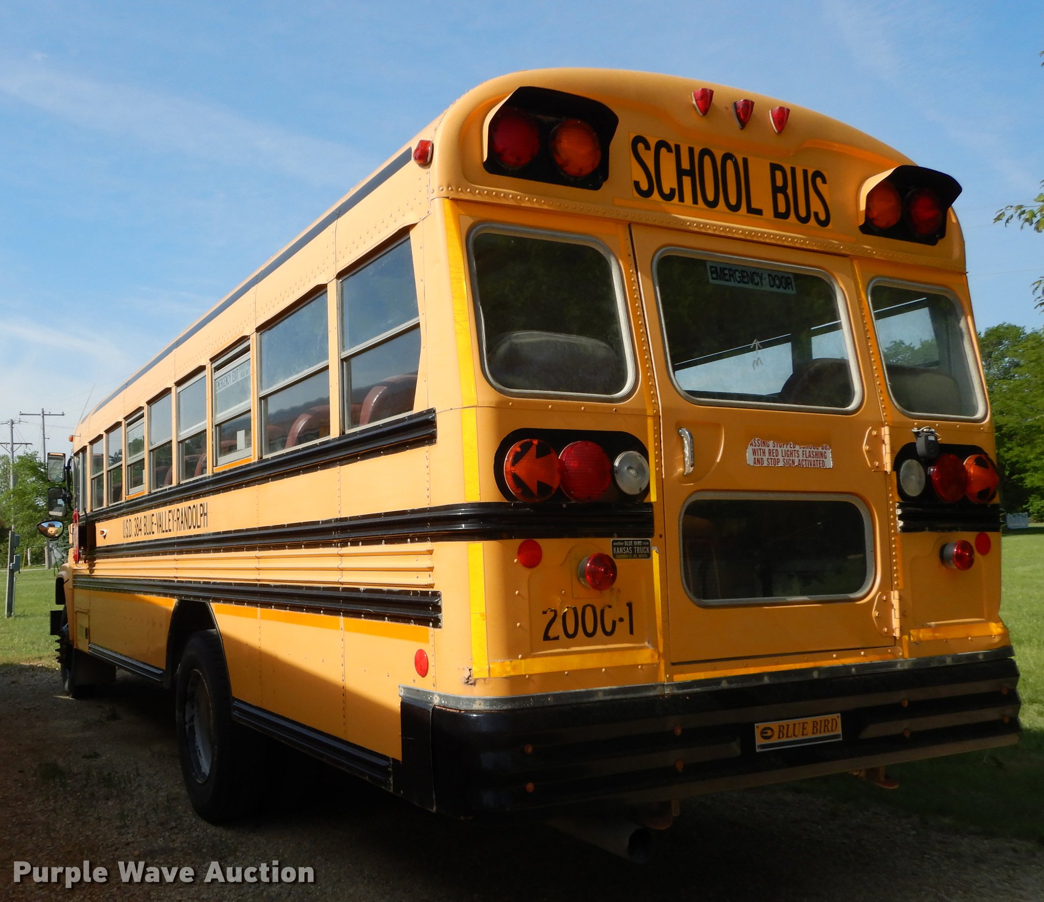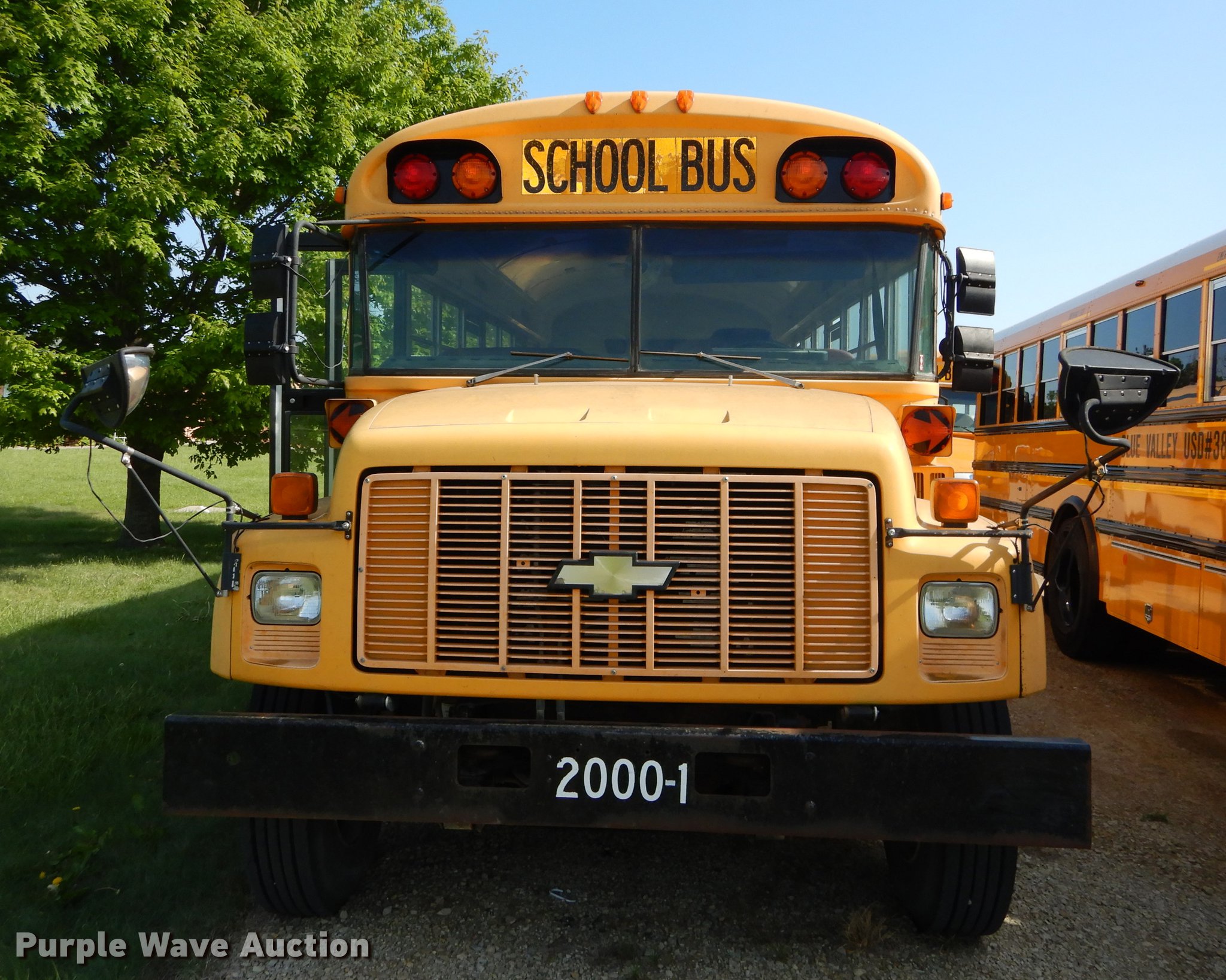 Purple Wave is selling a used Bus in Kansas. This item is a 2000 Chevrolet C7H064 Blue Bird school bus with the following: 144,699 miles on odometer, Caterpillar 3126 7.2L L6 turbo diesel engine, 142 HP, Serial 8YL47880, Automatic transmission, Single axle, Heat, AM/FM/cassette, Heated mirrors, Air suspension seat, Vinyl interior, 47 passenger capacity, Ceiling, rear, and side emergency exits, Lighted stop sign, Rear tow hooks, 192" wheelbase, Spring suspension, Hydraulic brakes, 10R22.5 tires, GVWR 27,960 lbs, Decals will be painted over prior to auction, Unit# 2000-1