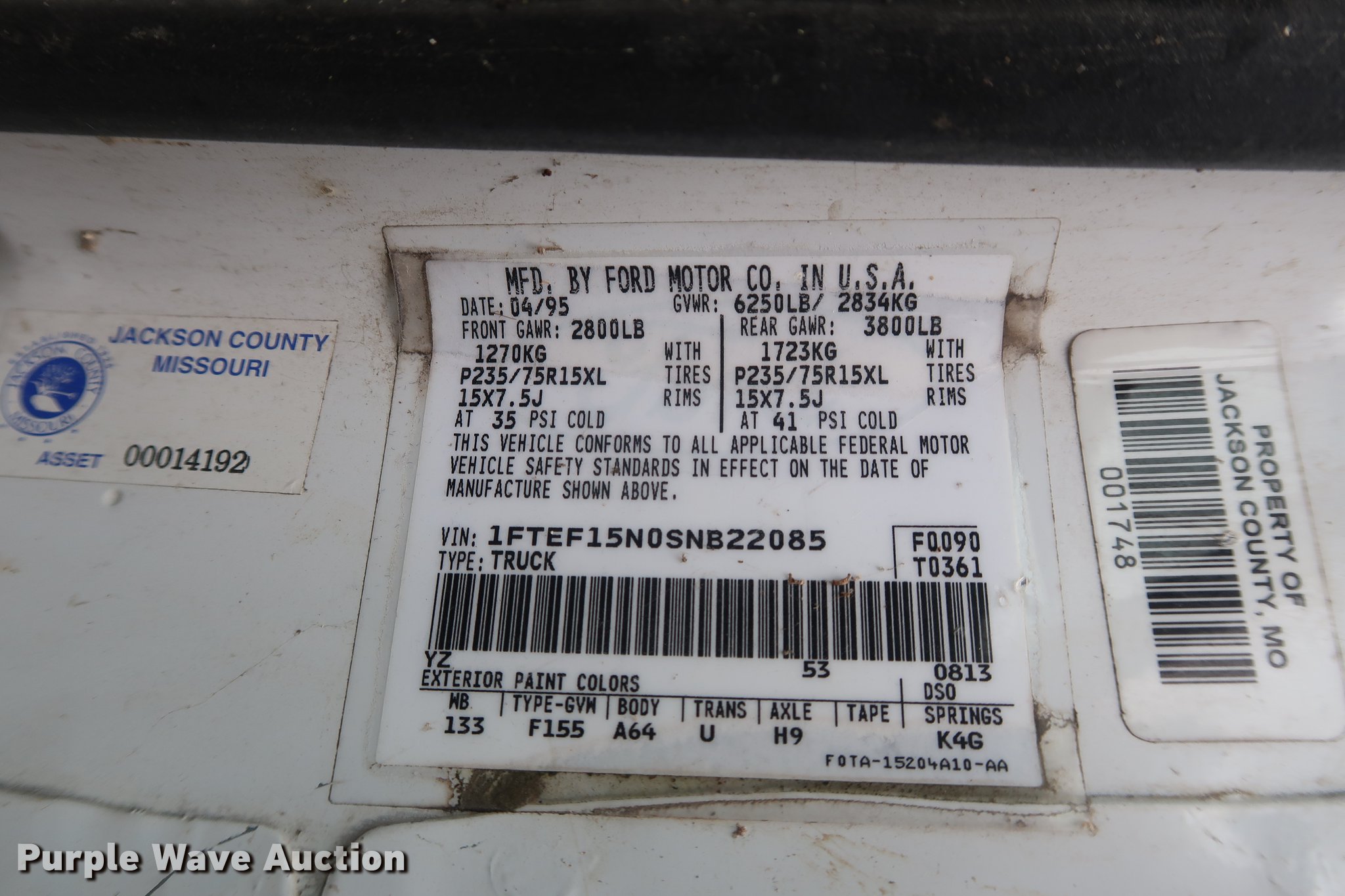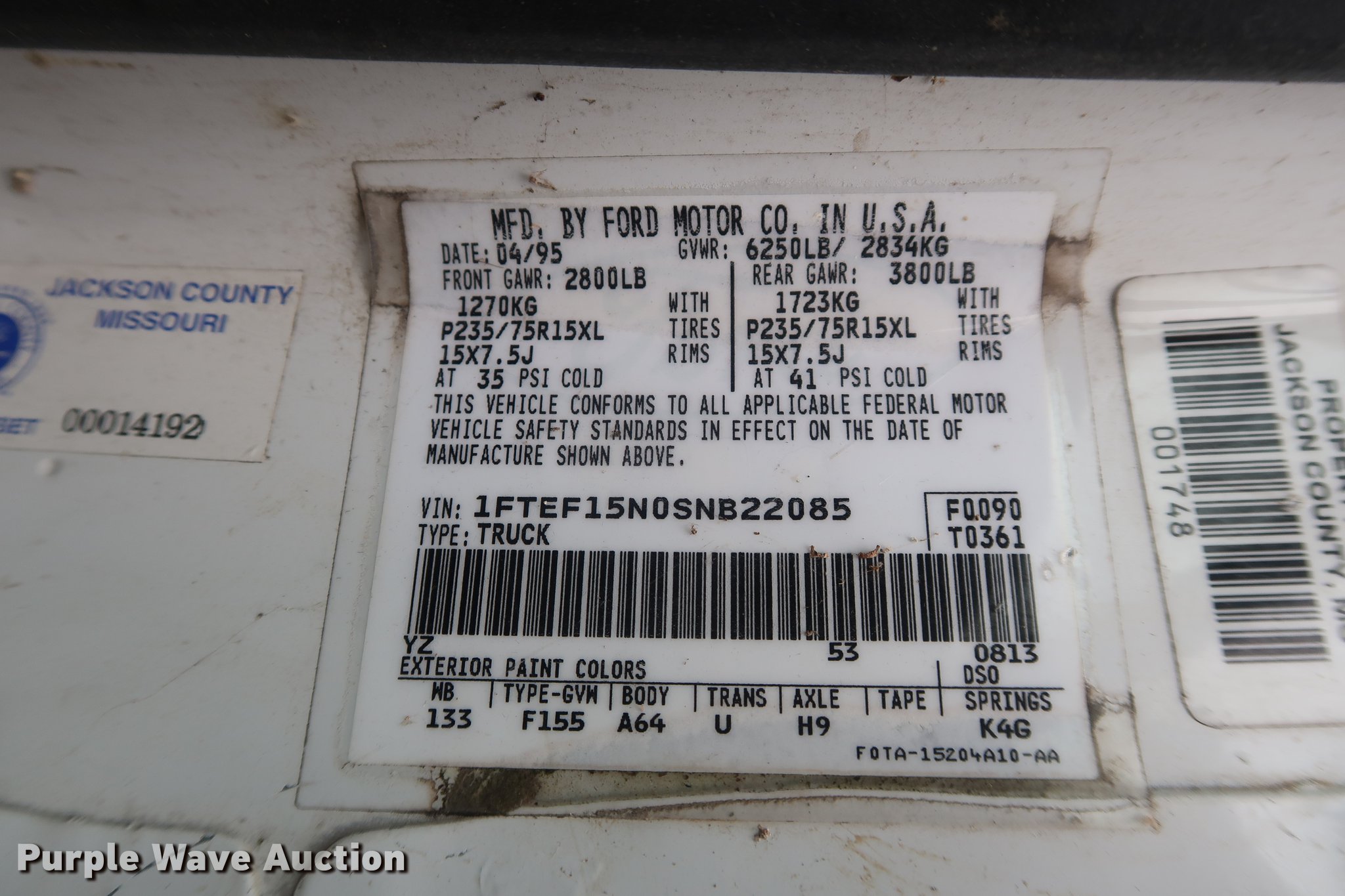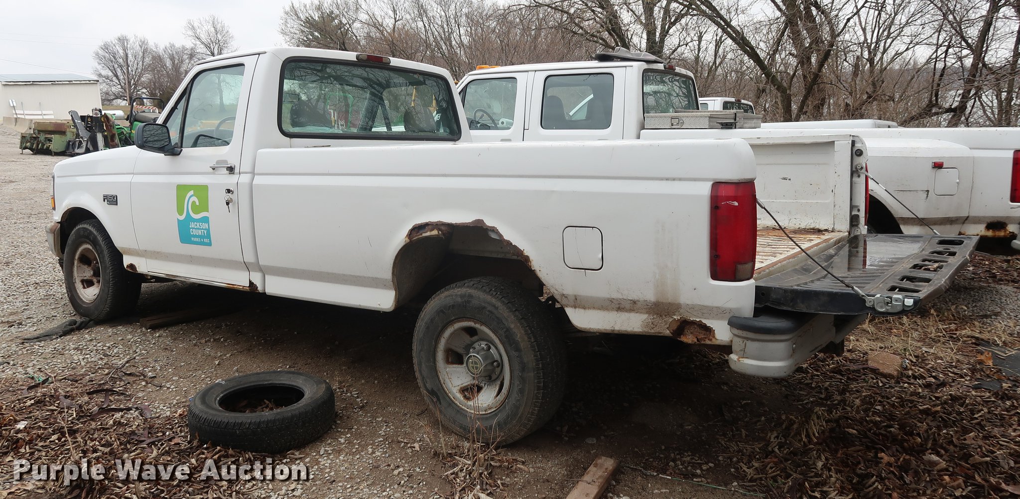 Purple Wave is selling a used 1/2 Ton Pickup or Van in Missouri. This item is a 1995 Ford F150 pickup truck with the following: Unknown miles on odometer, 5.0L V8 OHV 16V gas engine, Automatic transmission, Heat, Tilt, Cruise, AM/FM, Vinyl interior, Receiver hitch, Trailer wiring, 235/75R15 tires, Dead battery, Flat tires, Unknown operating condition