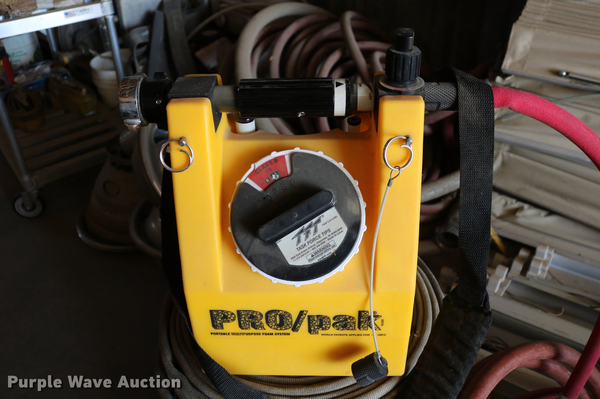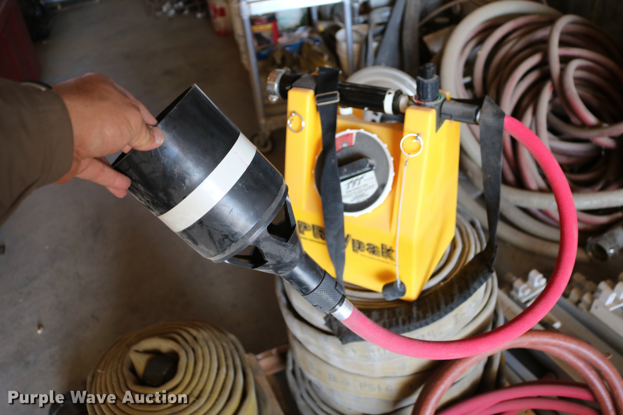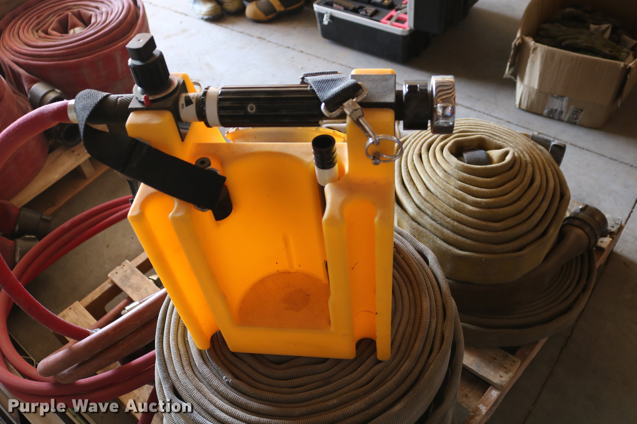 Purple Wave is selling a used Tools in Kansas. This item is a (11) nylon fire hoses with the following: (7) 50'L x 1 3/4" diameter, 50'L x 1.5", (2) 25'L x 2.5", 14'L x 4.5" diameter, Pro/Pak hand held foamer, Two gallon capacity, 1.5" fire hose input, Additional nylon hose, Assorted 1" rubber fire hose