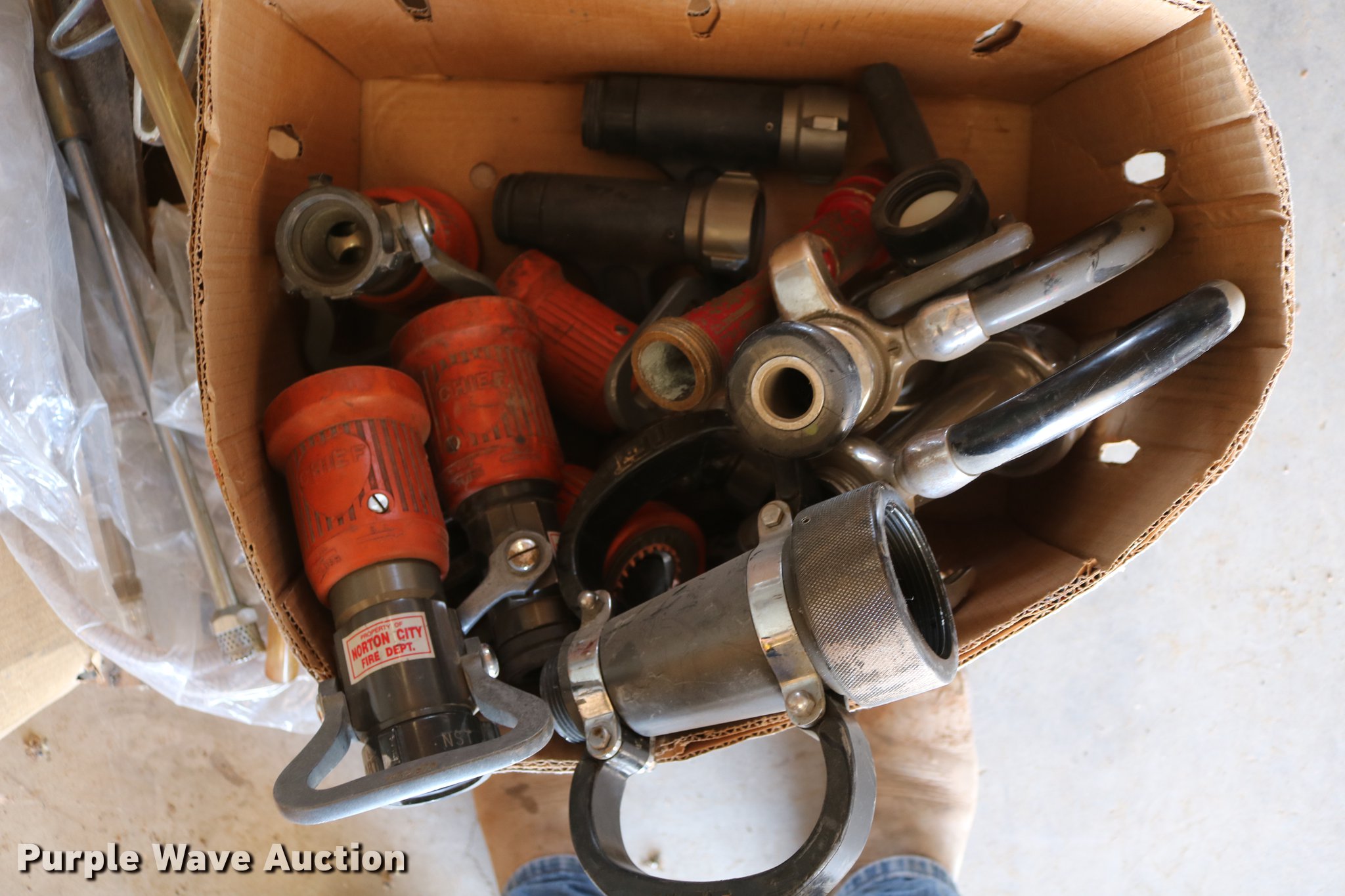 (2) Indian fire pumps. Assorted fire nozzles, Assorted fire extinguisher brackets, Akron ground monitor. 914 N State St. Norton, KS 67654
